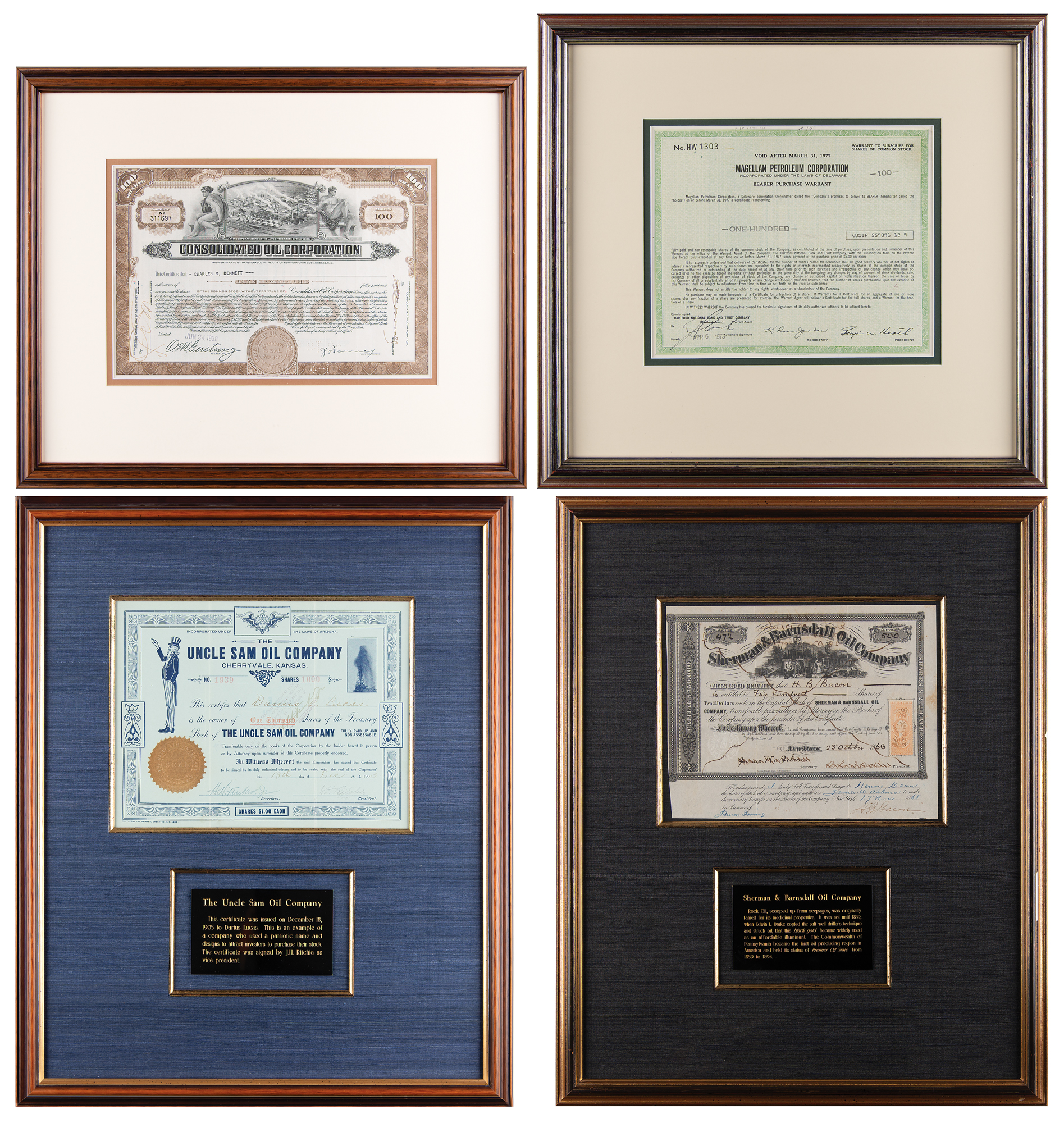 Stock certificate for 500 shares in the Sherman & Barnsdall Oil Company, one page, 9.5 x 7.5, October 23, 1868, signed in ink by the company's president and secretary. The certificate features a fine vignette of oil derricks and barrels of oil. Nicely mounted, cloth-matted, and framed with a plaque to an overall size of 17.5 x 21.75. In fine condition.