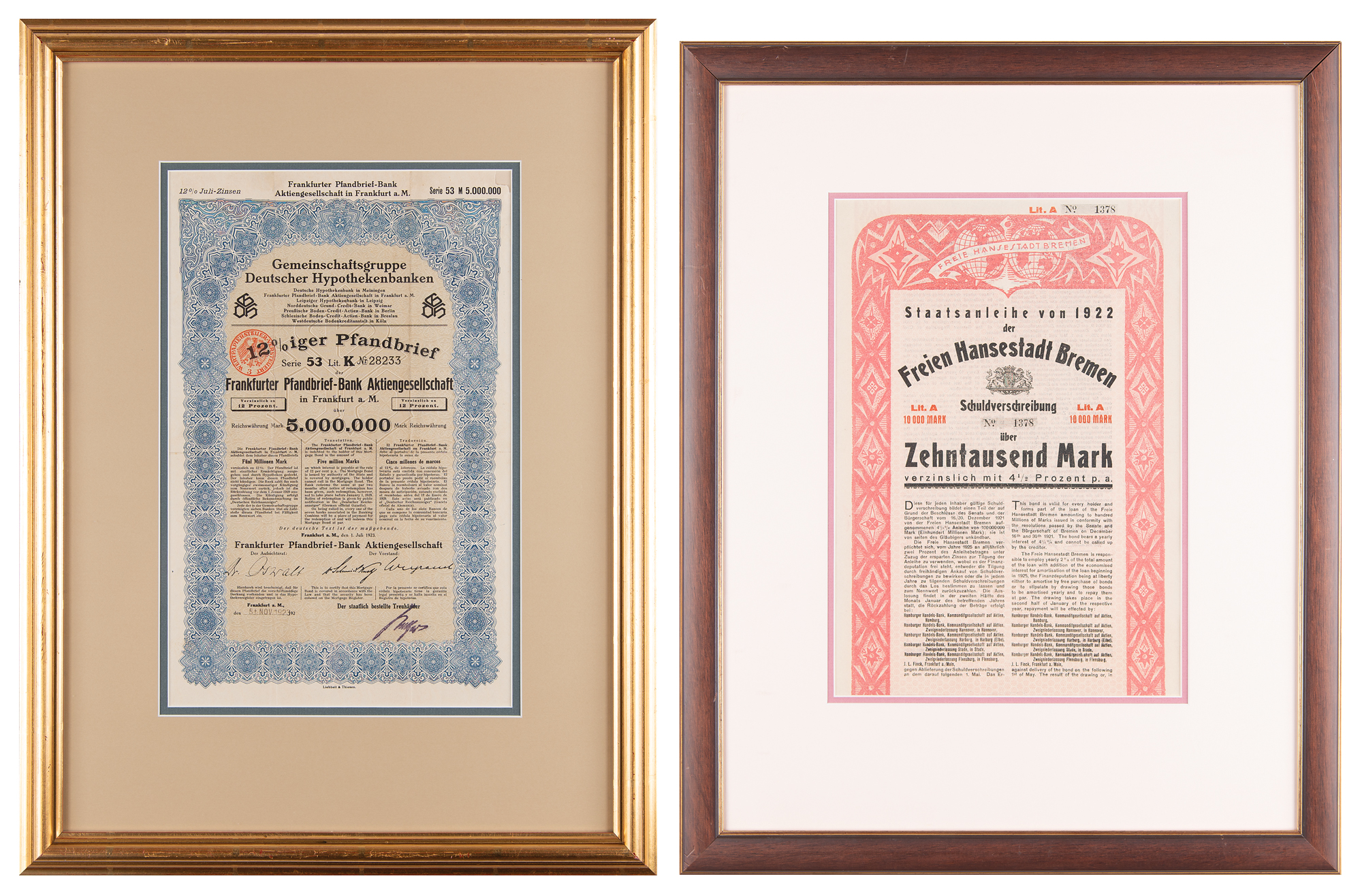 German bond of the Gemeinschaftsgruppe Deutscher Hypothekenbanken [Community Group of German Mortgage Banks], one page, 9 x 14, July 1, 1923, with stamped and facsimile signatures below. Double-matted and framed to an overall size of 17 x 22.5. In fine condition.