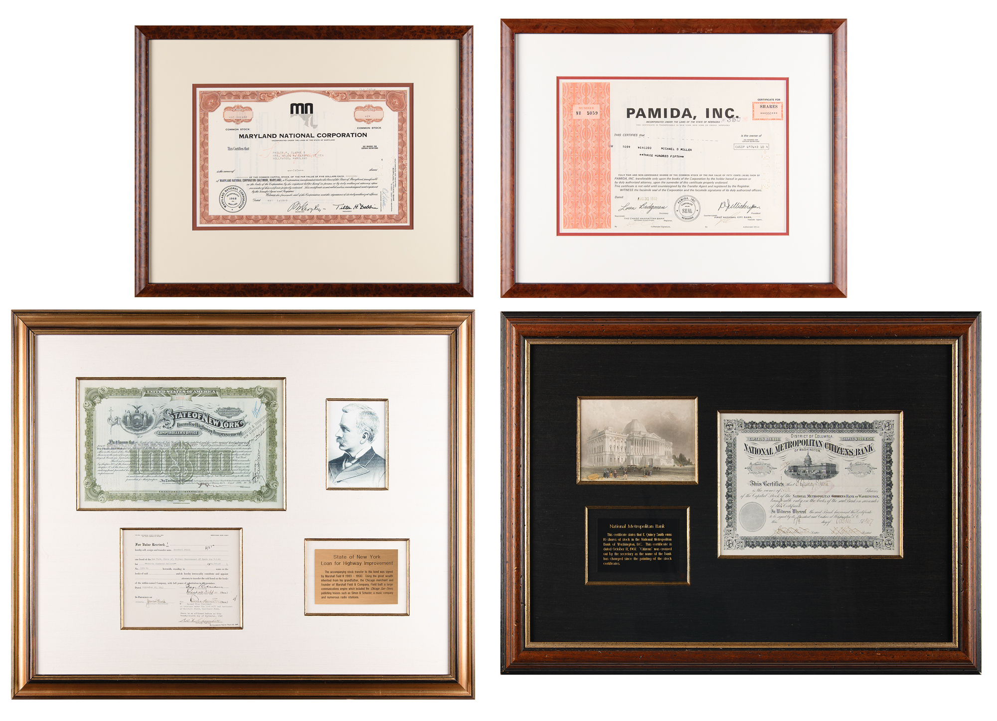 Stock certificate for two shares in the Maryland National Corporation, one page, 11.5 x 7.5, May 1, 1969, featuring facsimile signatures of the company's president and secretary. Handsomely double-matted and framed to an overall size of 18.75 x 15. In fine condition.