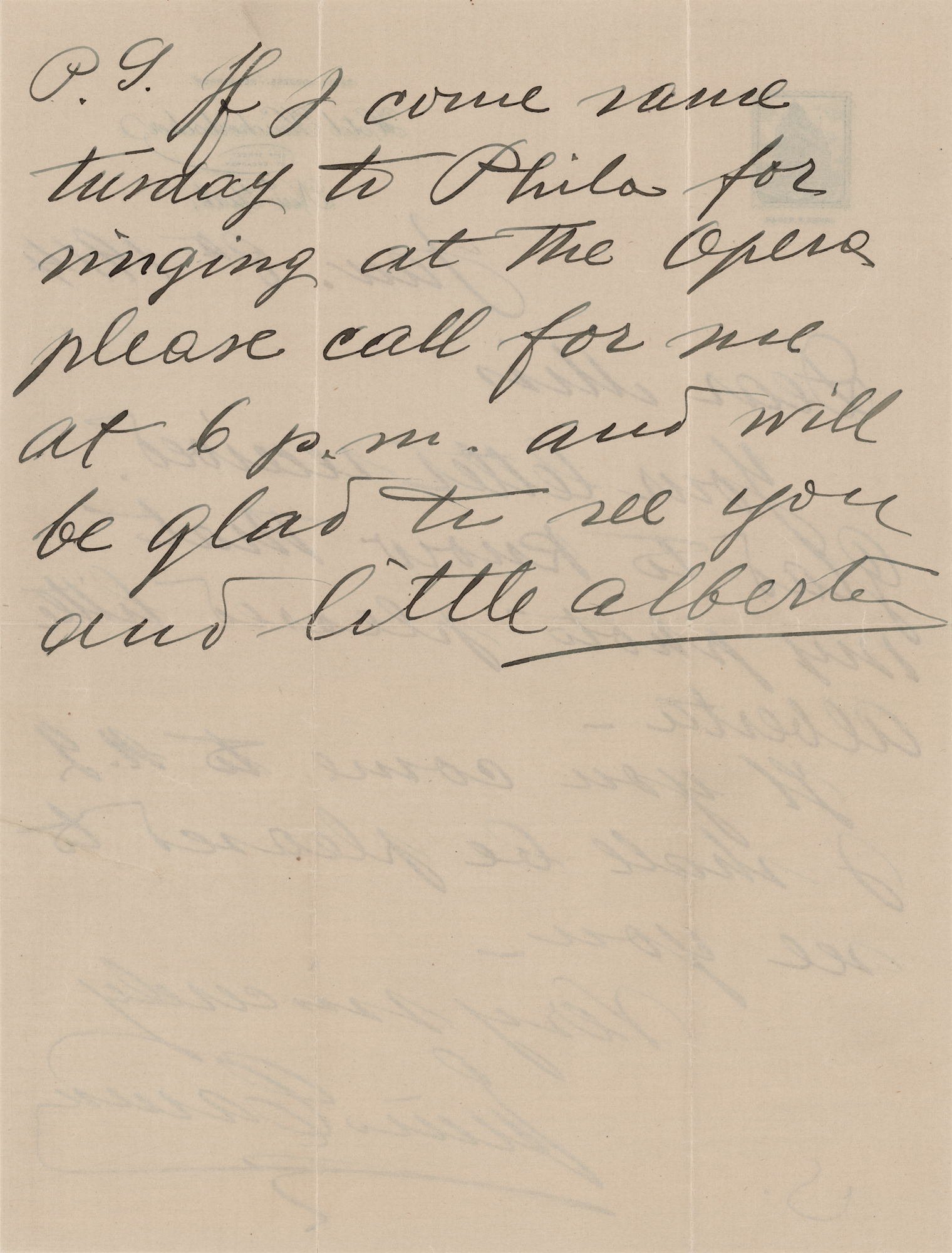 ALS, one page both sides, 8 x 10.5, Hotel Knickerbocker (New York) letterhead, January 8, 1914. Handwritten letter to Harriet E. Knight, in part: “Your letter received. Glad to know that my photo pleased little Alberta. If you come to N. Y. I shall be pleased to see you.” Caruso adds a postscript to the reverse: “If I come…to Phila for singing at the Opera please call for me at 6 p.m. and will be glad to see you and little Alberta.” In fine condition. Accompanied by the original mailing envelope and a ticket stub for the Metropolitan Opera House.