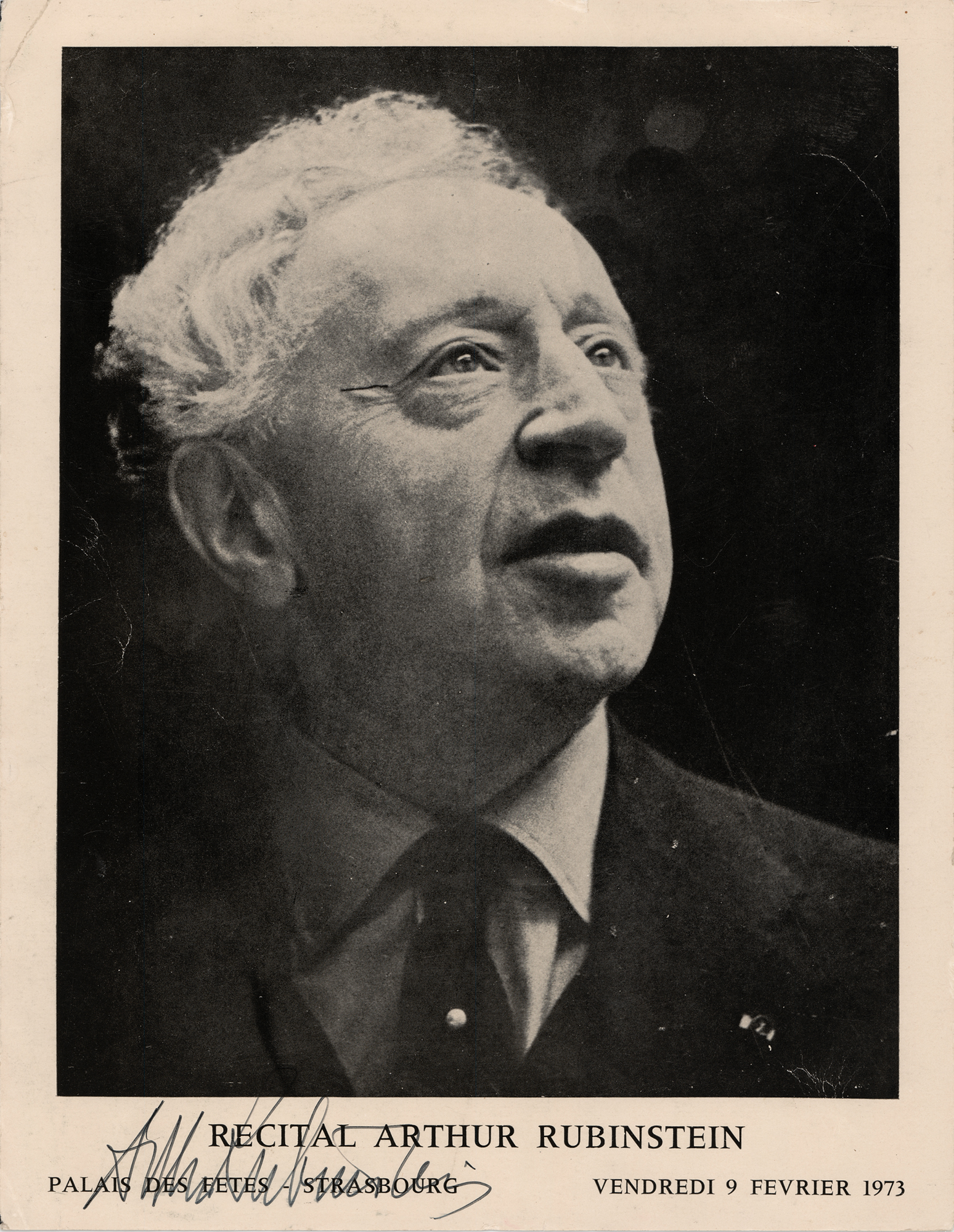 Piano virtuoso known especially for his interpretations of Chopin (1887–1982). Vintage semi-glossy 8.25 x 10.75 program photo of Arthur Rubinstein for a recital at the Palais des Fetes in Strasbourg, France, on February 9, 1973, signed in the lower border in black felt tip. In very good condition, with overall light creasing and surface impressions.