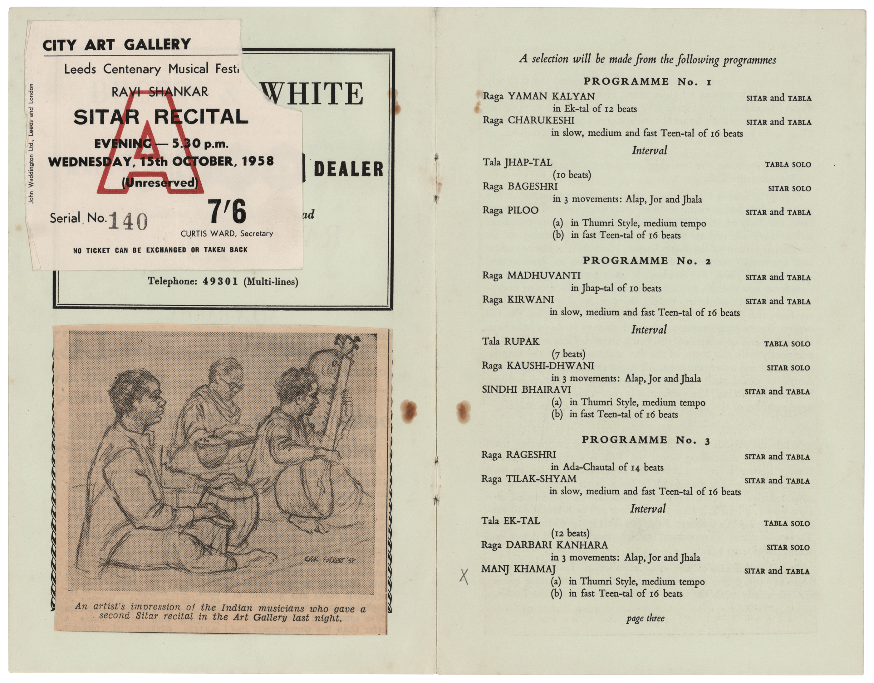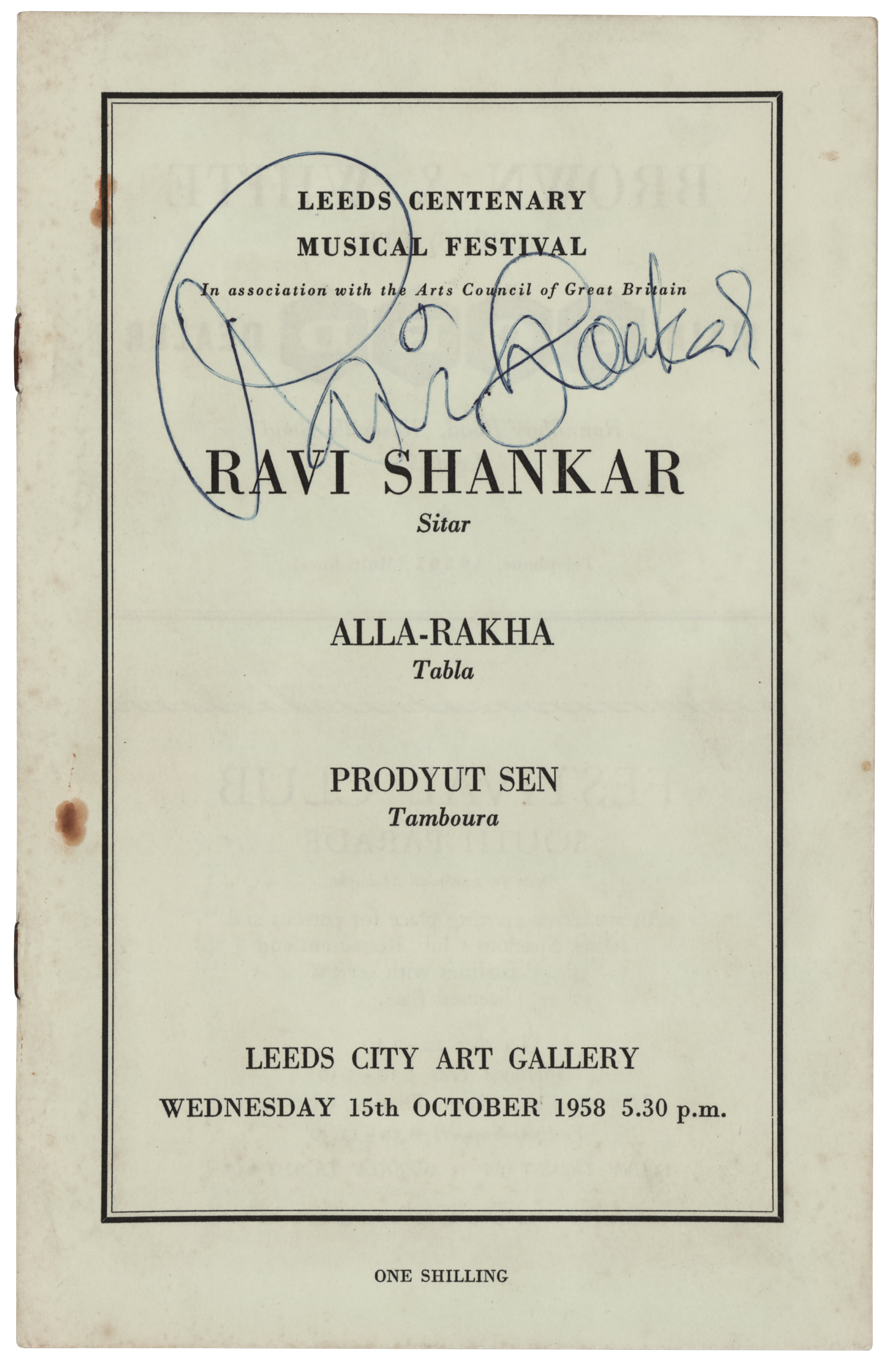 Vintage program for a performance by Ravi Shankar at the Leeds Centenary Music Festival held at the Leeds City Art Gallery on October 15, 1958, six pages, 5.5 x 8.5, signed on the front cover in ballpoint by Shankar. The inner pages contain affixed newspaper clippings and a ticket stub for the event. In fine condition, with a few small rust stains.