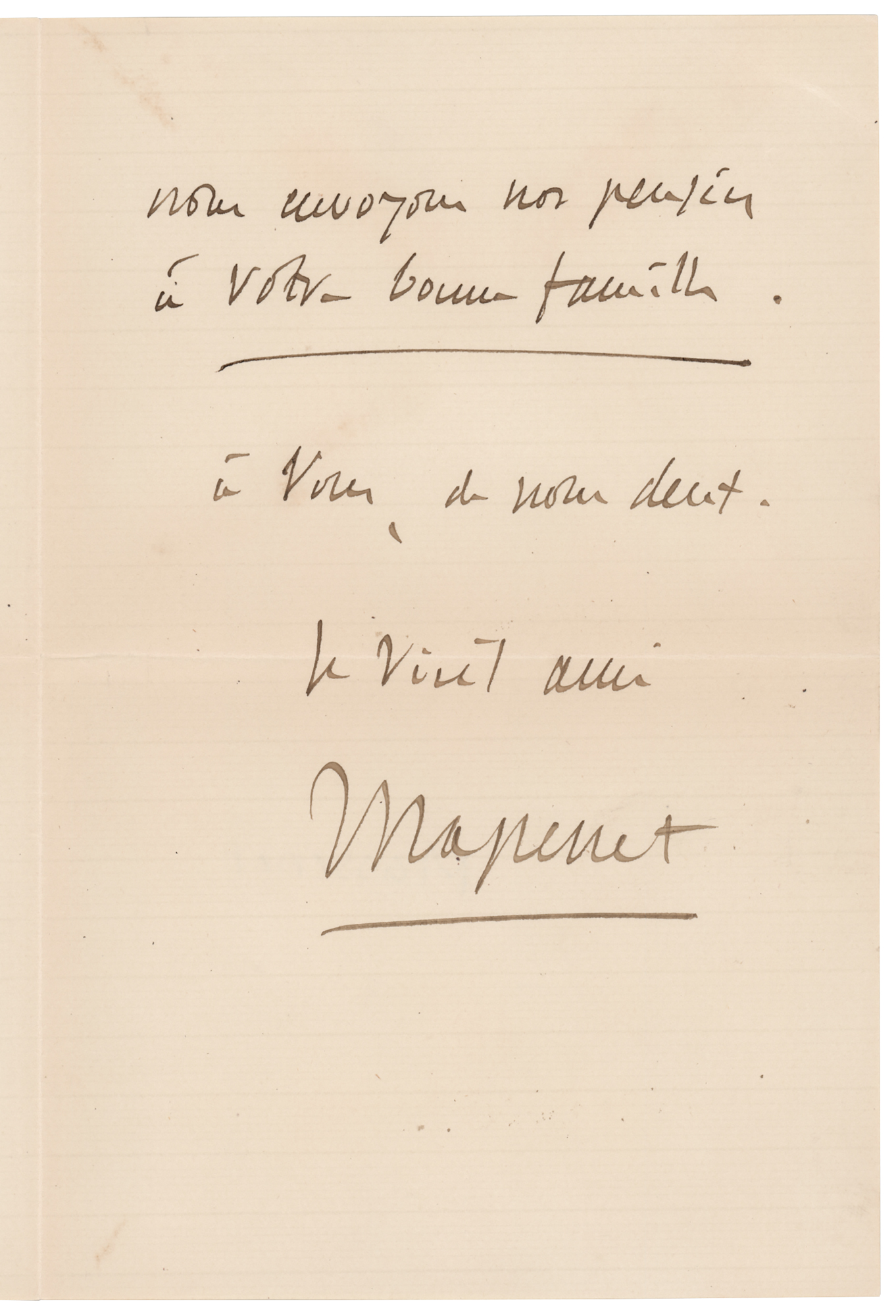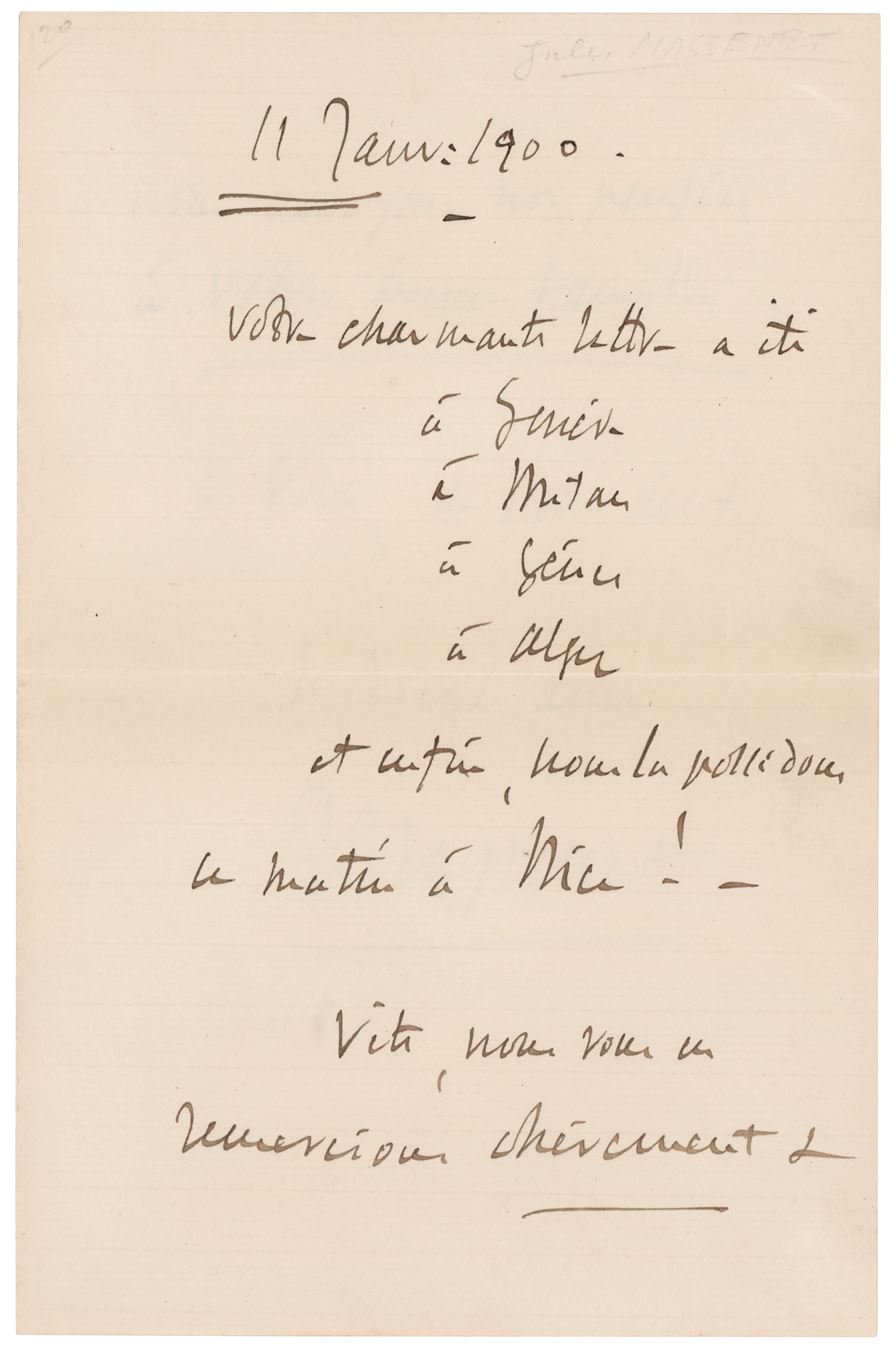 French composer of the Romantic era best known for his operas (1842-1912). ALS in French, signed “Massenet,” two pages on two adjoining sheets, 4.25 x 6.5, January 11, 1900. Sent from Nice, an untranslated handwritten letter from Jules Massenet to pianist Jean Cavinet. In fine condition. Accompanied by the original hand-addressed mailing envelope.