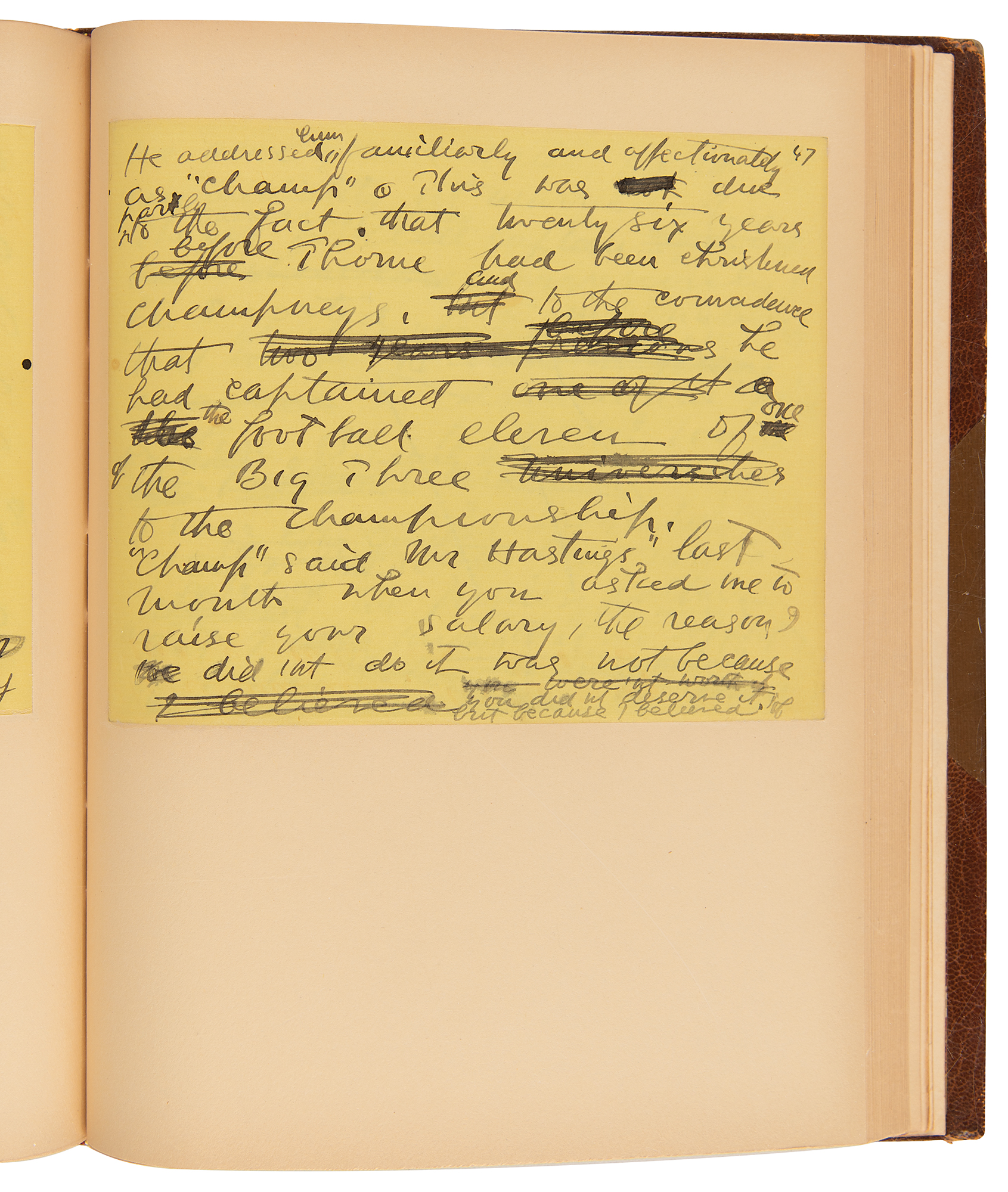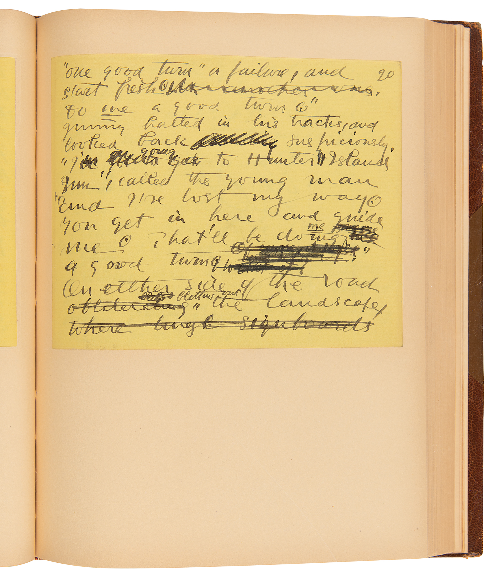 Influential journalist and writer of fiction and drama (1864–1916), remembered as an ally of Theodore Roosevelt and for his work as a war correspondent covering the Spanish–American War, the Second Boer War, and World War I. AMS signed "Richard Harding Davis, Mt. Kisco, N.Y.," 75 pages, 5.75 x 4.75, no date but published in 1914. Davis's handwritten draft for his story "The Boy Scout," the first tale in his 1914 short story collection The Boy Scout and Other Stories for Boys. Writing on bright yellow notebook paper, Davis begins: "A rule of the Boy Scouts is every day to do some one a good turn. Not because the copy-books tell you it deserves another, but in spite of that pleasing possibility. If you are a true scout, until you have performed your act of kindness your day is dark. You are as unhappy as is the grown up who has begun his day without shaving, or reading the New York Sun. But as soon as you have proved yourself you may, with a clear conscience, look the world in the face and untie the knot in your kerchief." Davis makes numerous emendations throughout, striking through and replacing numerous words. The manuscript is in fine condition: each page has been professionally inlaid into a larger 6.75 x 8.75 sheet, and custom-bound together in half-morocco; however, the front board is neatly detached at the joint.