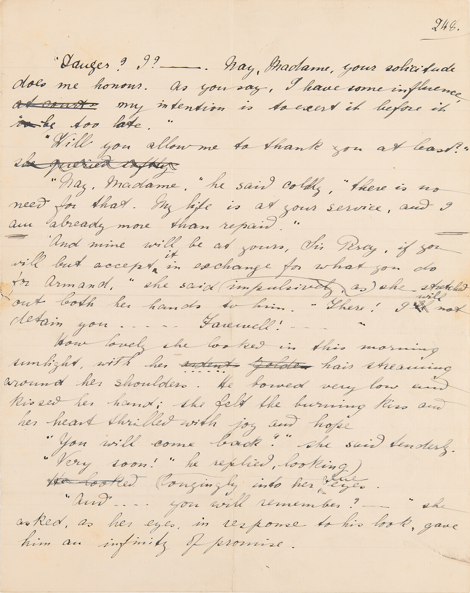 British writer and artist (1865–1947) best known for her series of novels featuring the Scarlet Pimpernel. Handwritten page from Baroness Emma Orczy's draft for her popular novel The Scarlet Pimpernel, one page, 8 x 10.25, sent by the baroness to her publisher, Greening, to pass on to Newman Flower for use in connection with her article 'How I Wrote The Scarlet Pimpernel,' a contribution to The Story-Teller. The page , numbered "248," depicts a characteristic scene of gallantry in which Sir Percy Blakeney offers his service to a lady. In part: "He bowed very low and kissed her hand; she felt the burning kiss and her heart thrilled with joy and hope. 'You will come back?' she said tenderly. 'Very soon!' he replied, looking longingly into her blue eyes. 'And… you will remember?—' she asked, as her eyes, in response to his look, gave him an infinity of promise."