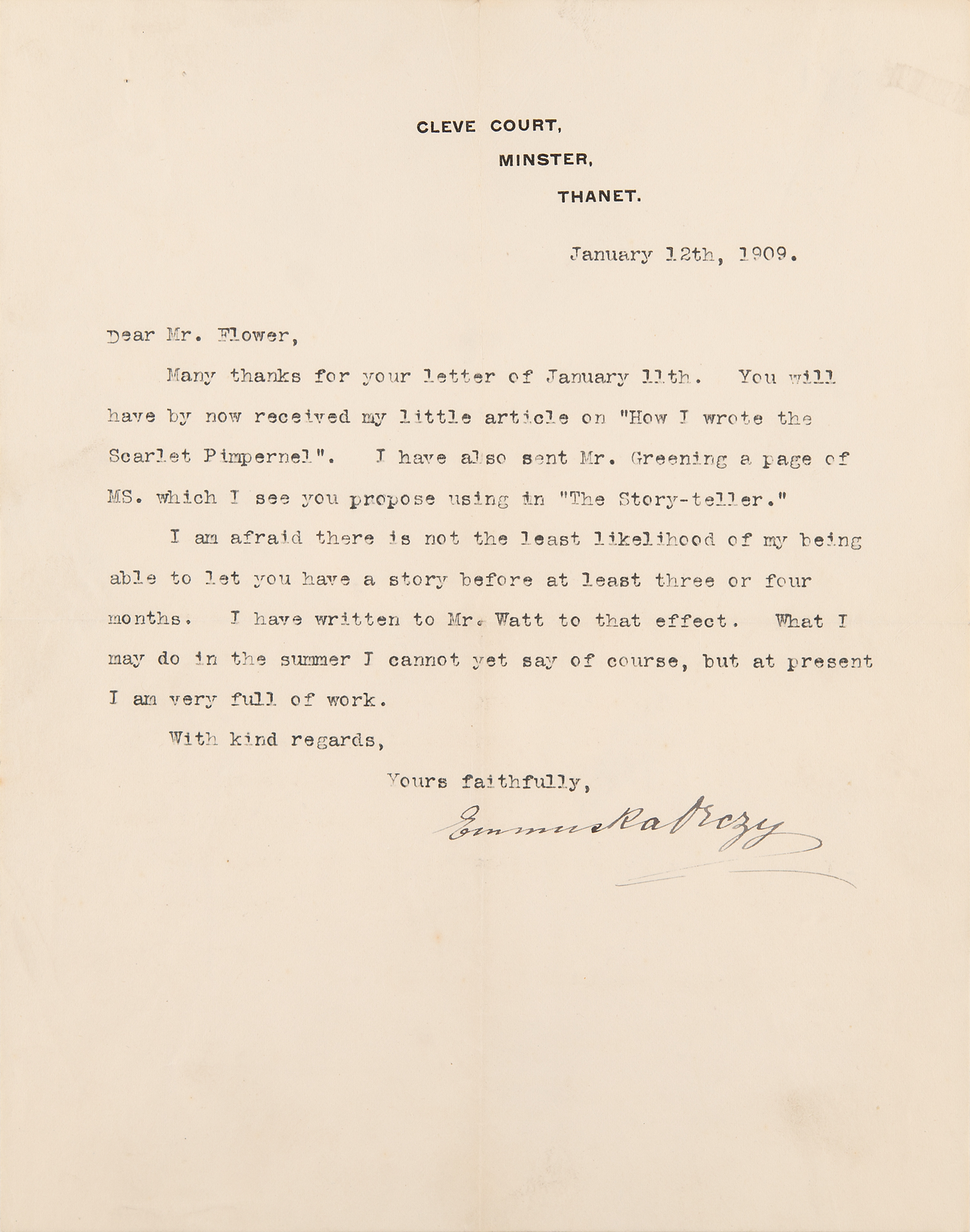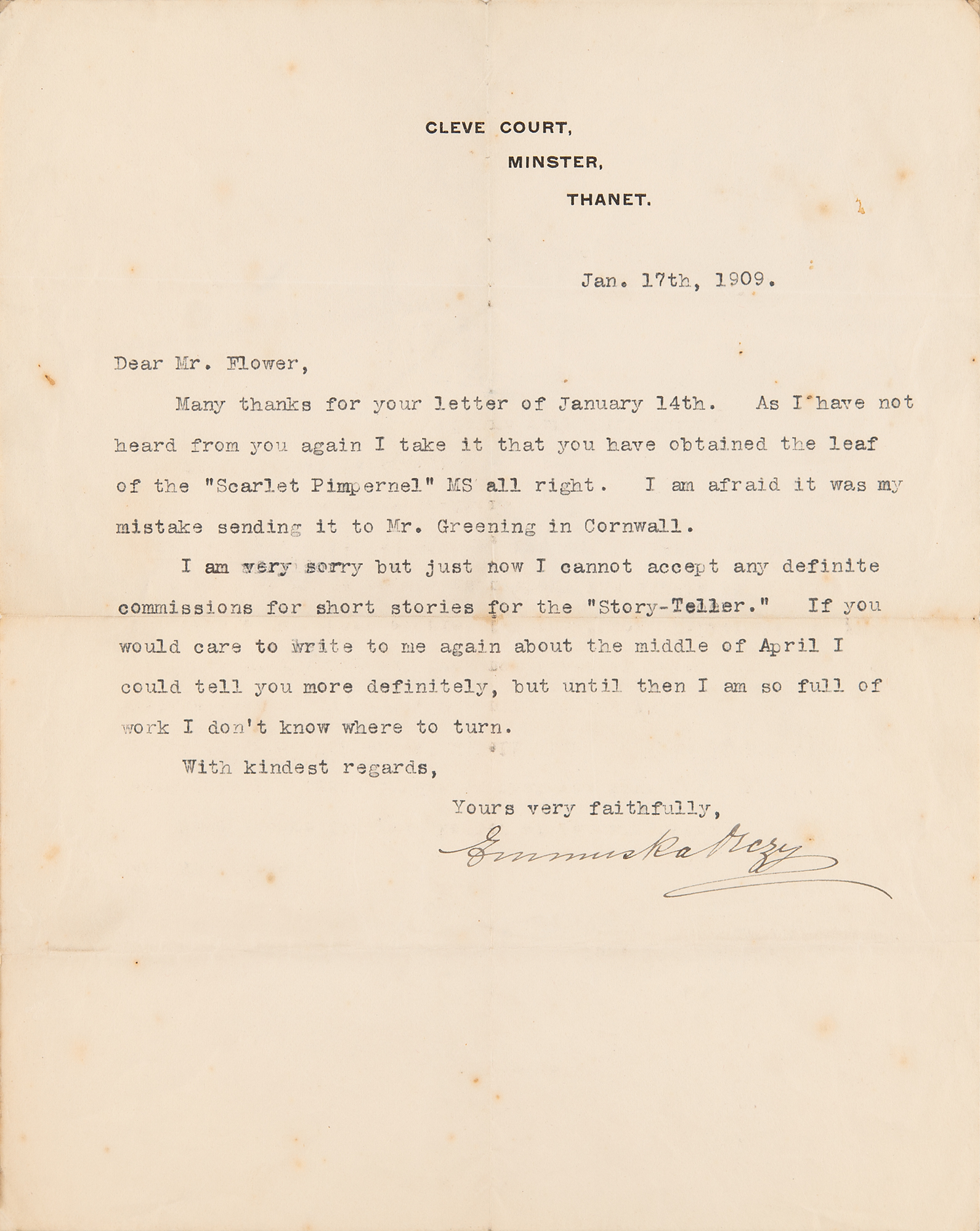 Includes two TLSs signed "Emmuska Orczy," each one page, 8 x 10, Cleve Court letterhead, January 12 and 17, 1909, both to Mr. Flower. The first, in part: "You will have by now received my little article on 'How I wrote the Scarlet Pimpernel.' I have also sent Mr. Greening a page of MS. which I see you propose using in 'The Story-teller.'" The second, in part: "As I have not heard from you again I take it that you have obtained the leaf of the 'Scarlet Pimpernel' MS all right. I am afraid it was my mistake sending it to Mr. Greening in Cornwall. I am very sorry but just now I cannot accept any definite commissions for short stories." In overall fine condition, with intersecting folds. Housed in a custom-made navy blue presentation folder with gilt-stamped morocco spine.