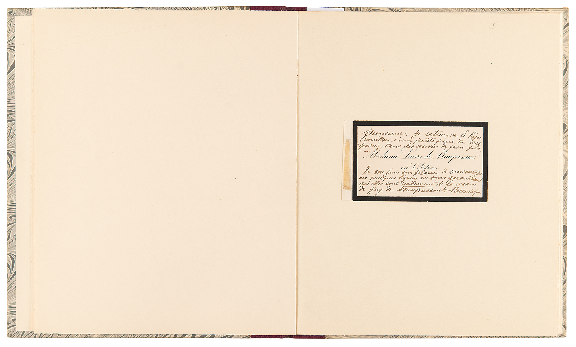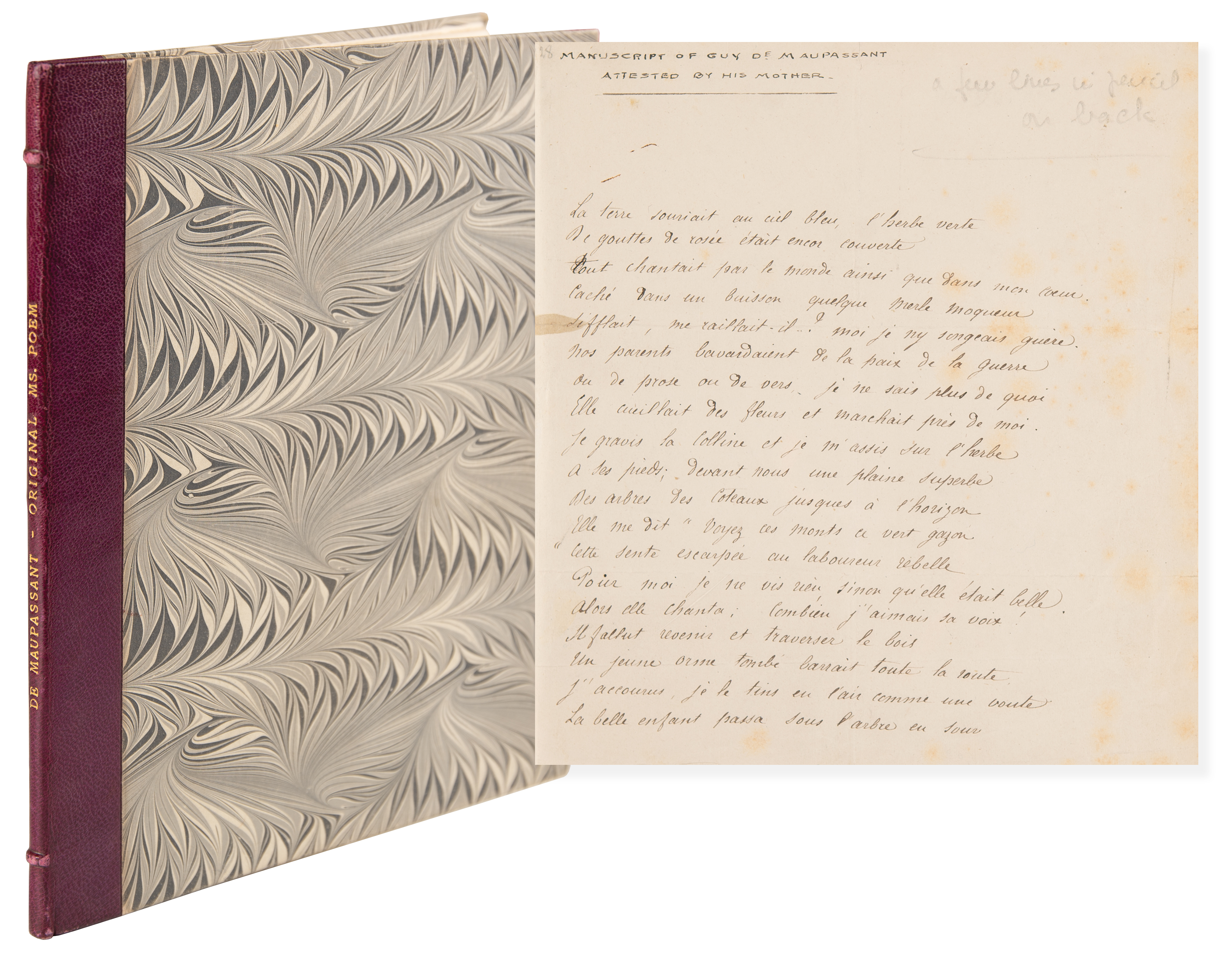 French naturalist writer (1850-1893) considered the greatest French author of short stories. Unsigned handwritten poem by Guy de Maupassant, one page, 7.5 x 8, no date. Maupassant pens the first part of his poem 'Promenade à seize ans [Walking at Sixteen Years Old,' beginning: "La terre souriait au ciel bleu, l'herbe verte / de gouttes de rosée était encor couverte. / Tout chantait par le monde ainsi que dans mon coeur. / Caché dans un buisson, quelque merle moqueur sifflait. Me raillait-il? Moi, je n'y songeais guère [The earth smiled at the blue sky, the green grass / With drops of dew was still covered. / Everything sang in the world as well as in my heart. / Hidden in a bush, some mockingbird / Was whistling. Was it mocking me? I hardly thought about it]." Annotated at the head in another hand: "Manuscript of Guy de Maupassant attested by his Mother." Includes a handwritten note by his mother, signed "Laure de Maupassant," on one of her personal calling cards, certifying that the manuscript is in her son's hand. Both are tipped into a handsome custom hardcover binding, featuring a maroon morocco gilt-stamped spine. In fine condition, with scattered light foxing.