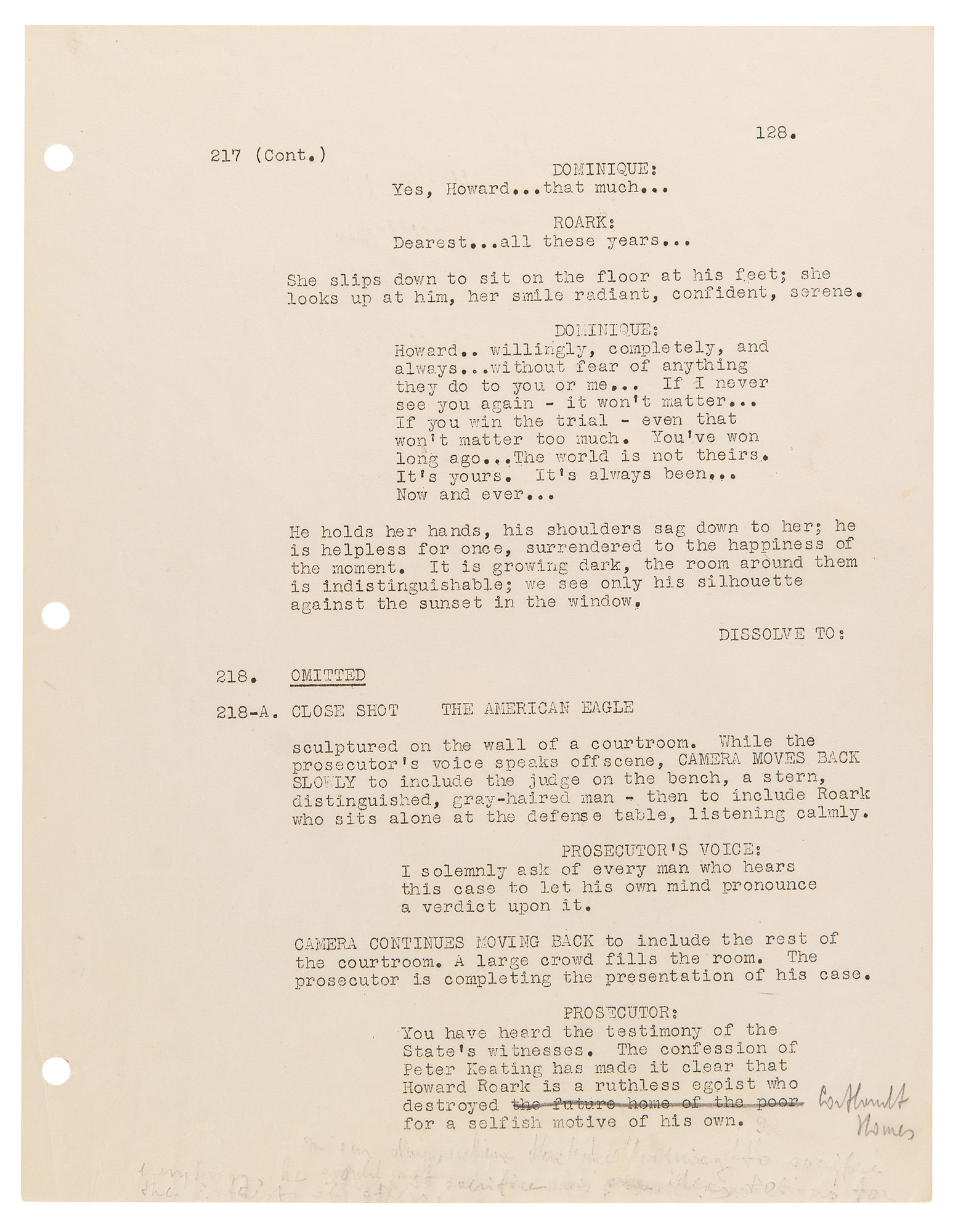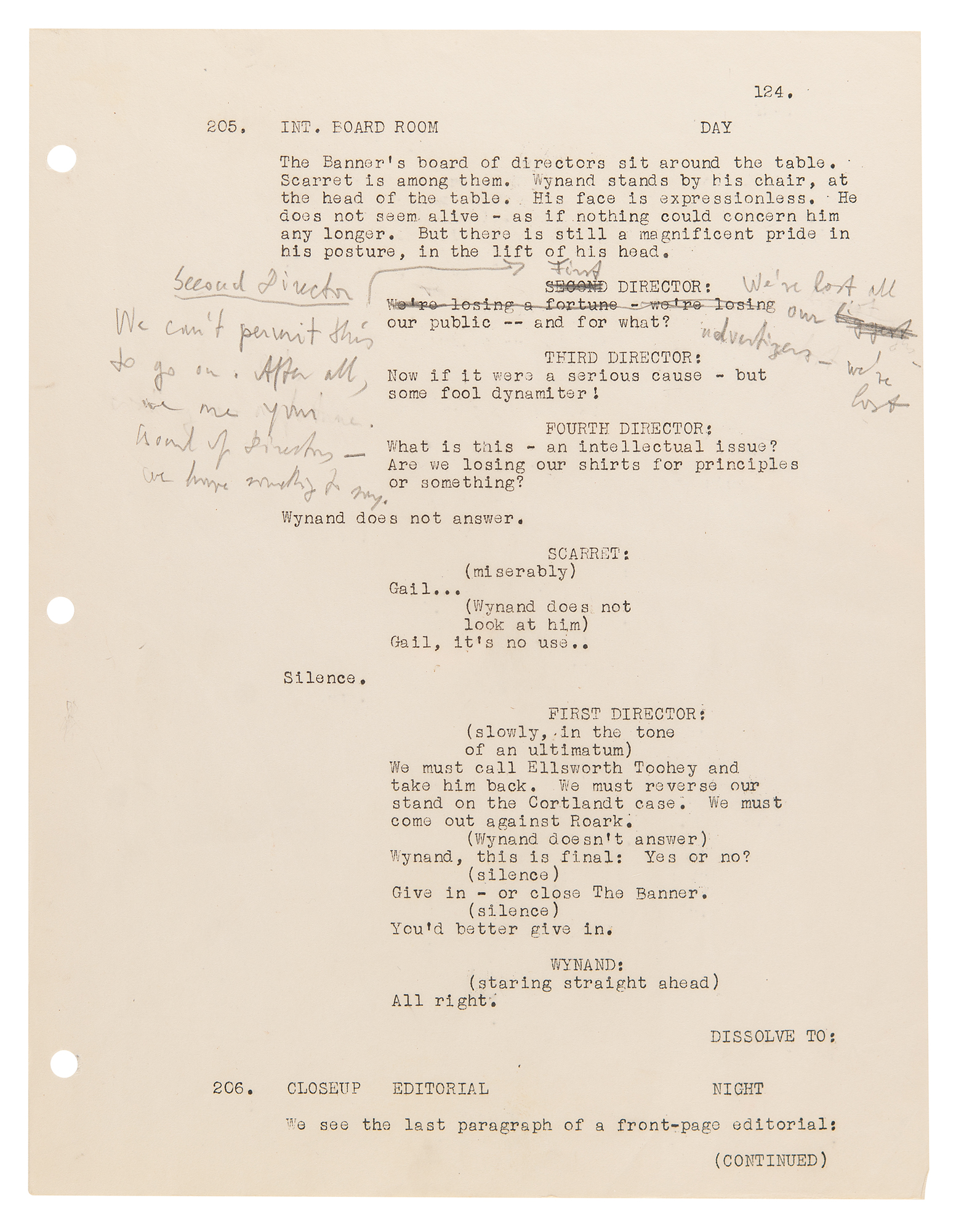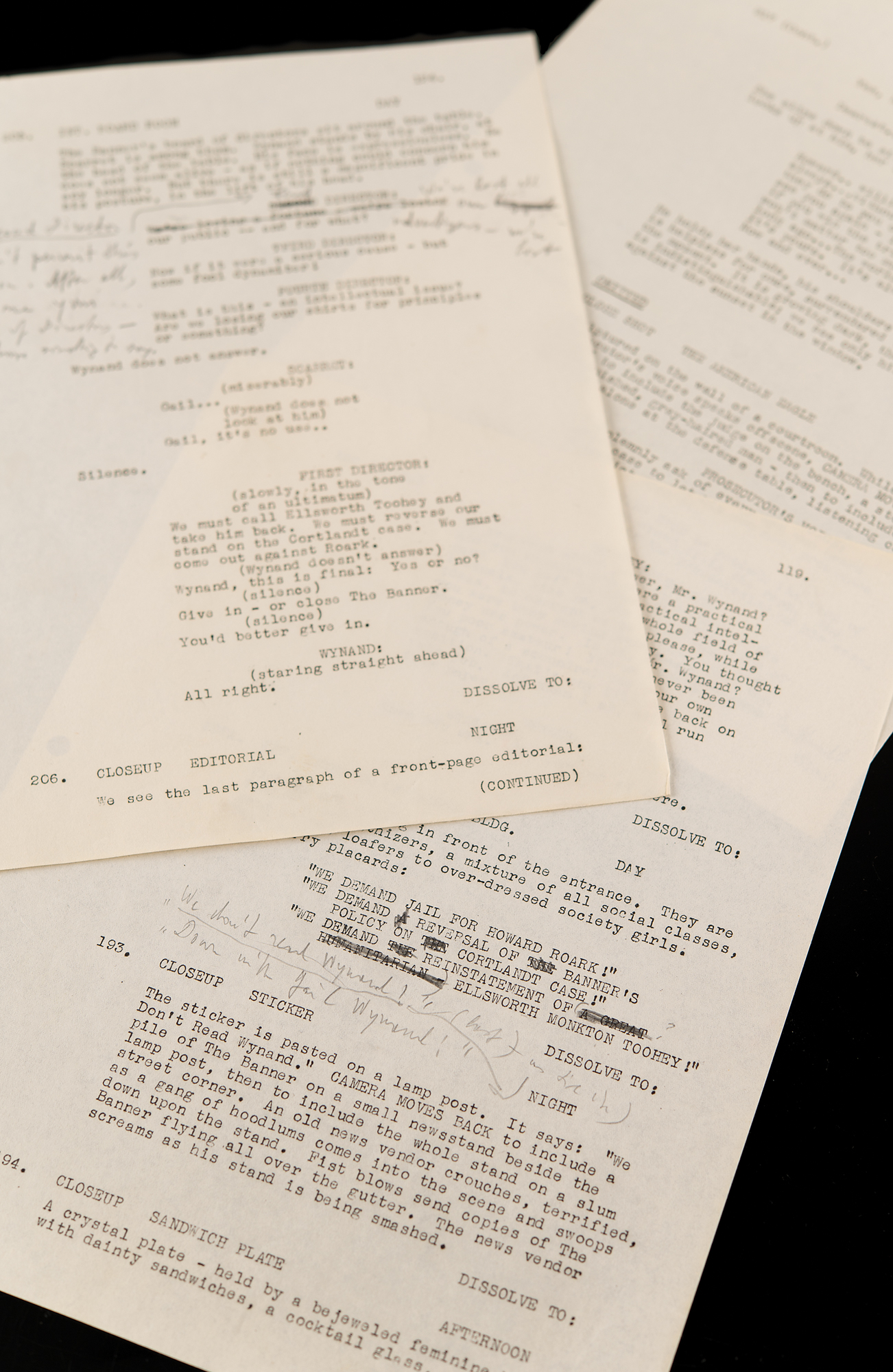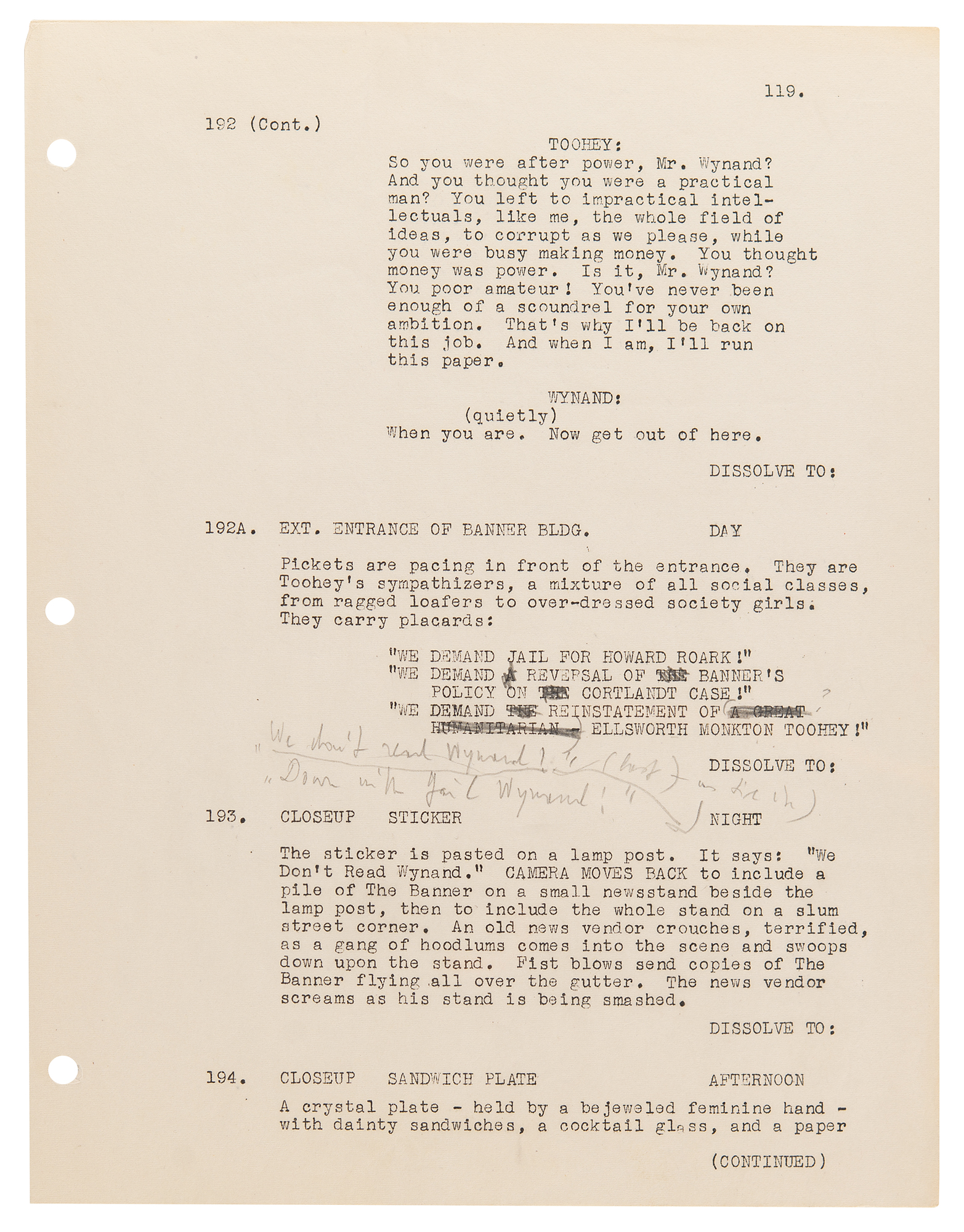 Three hand-annotated pages from Ayn Rand's personal copy of the screenplay for The Fountainhead, 8.5 x 11, each amended in pencil by Rand. Includes: page 119, scene 192A, in which the public demands that Roark be punished for dynamiting Cortlandt Homes, with some dialogue added by Rand: "'We don't read Wynand!' 'Down with Gail Wynand!'"; page 124, scene 205, in which Wynand falters under pressure from his board of directors, with Rand adding a line for the "Second Director"—"We can't permit this to go on. After all, we are your board of directors—we have something to say"—and for the "First Director," "We've lost all our advertisers—we've lost"; and page 128, scene 217, in which Dominique confesses that she has always loved Roark, with Rand amending a prosecutor's line to read "Cortlandt Homes" instead of "the future home of the poor," with some further erased pencil notations at the bottom. In overall fine condition.