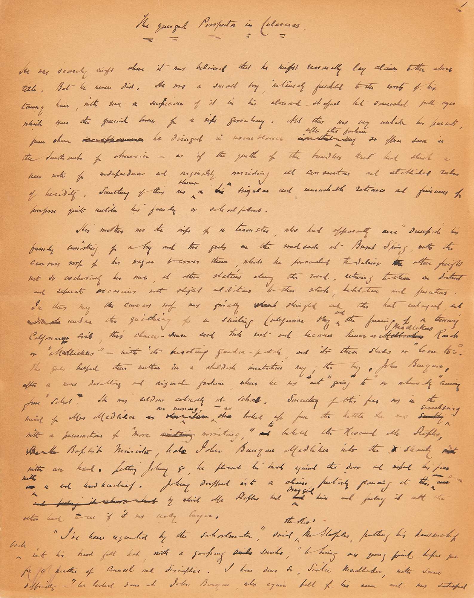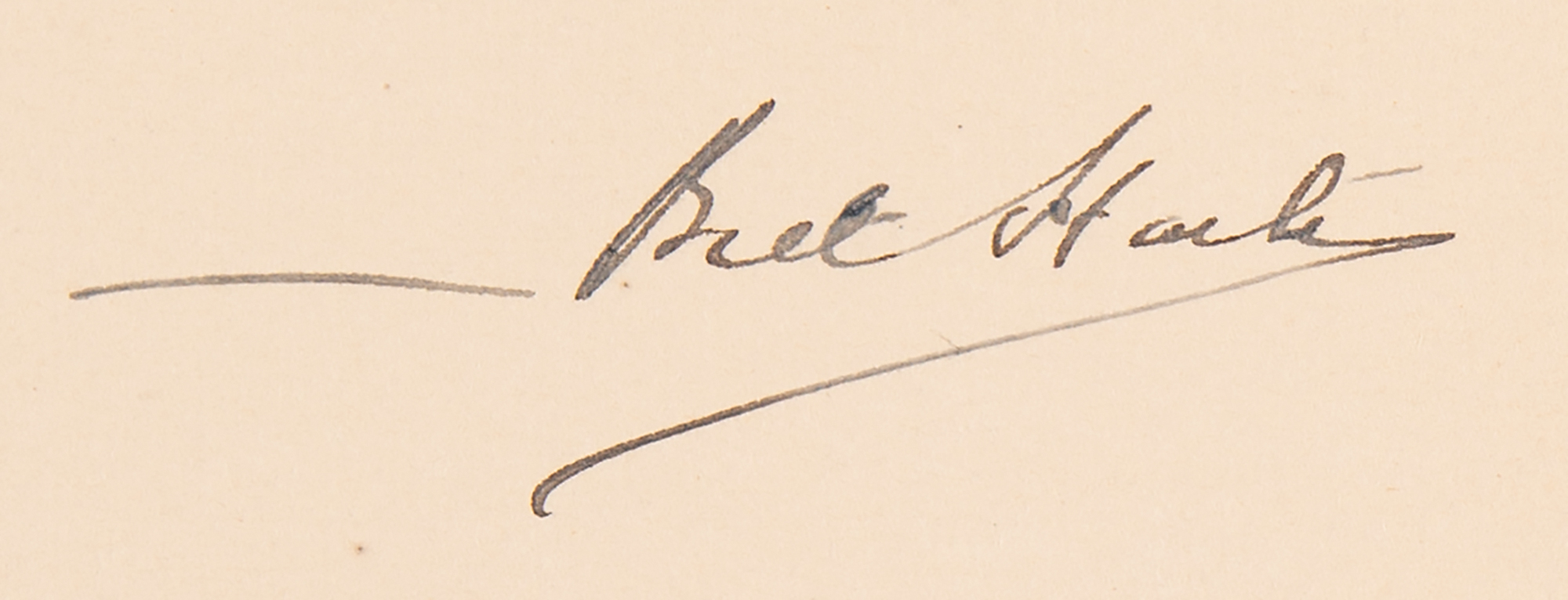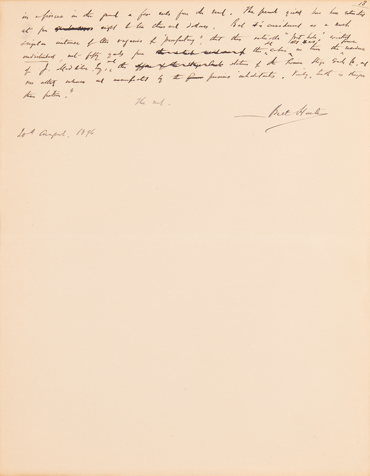 American author (1836-1902) best known for his colorful tales of California pioneers, including the much-anthologized story 'The Outcasts of Poker Flat.' AMS signed "Bret Harte," thirteen pages, 7 x 9, August 20, 1896. Harte's draft of his short story "The Youngest Prospector in Calaveras," published in his collection Tales of Trail and Town in 1898. The story begins: "He was scarcely eight when it was believed that he could have reasonably laid claim to the above title. But he never did. He was a small boy, intensely freckled to the roots of his tawny hair, with even a suspicion of it in his almond-shaped but somewhat full eyes, which were the greenish hue of a ripe gooseberry. All this was very unlike his parents, from whom he diverged in resemblance in that fashion so often seen in the Southwest of America—as if the youth of the boundless West had struck a new note of independence and originality, overriding all conservative and established rules of heredity." In fine condition, with uniform toning to only the first page. A fabulous tale of the California gold rush by a celebrated observer of the American West.