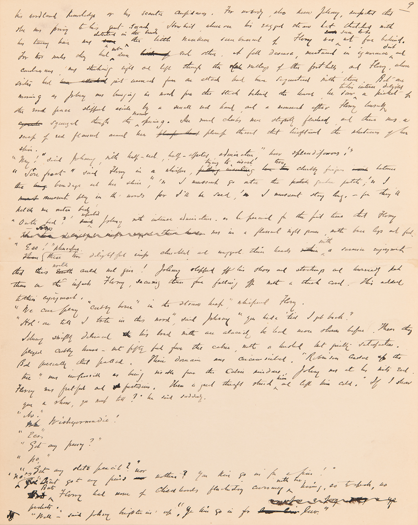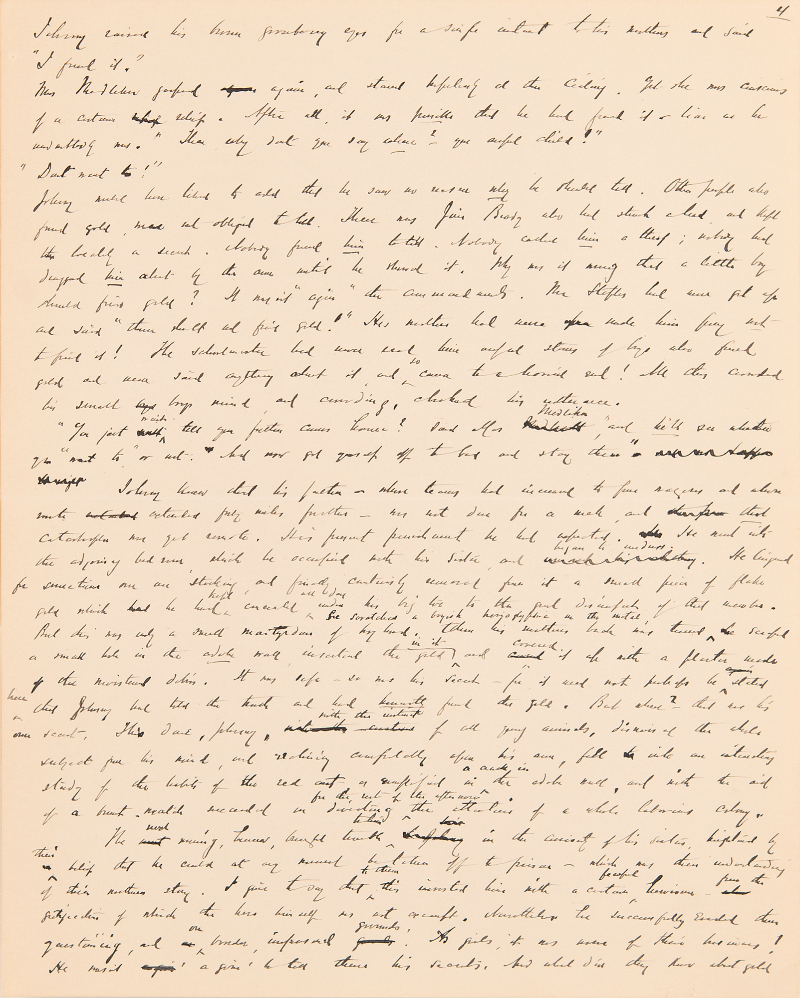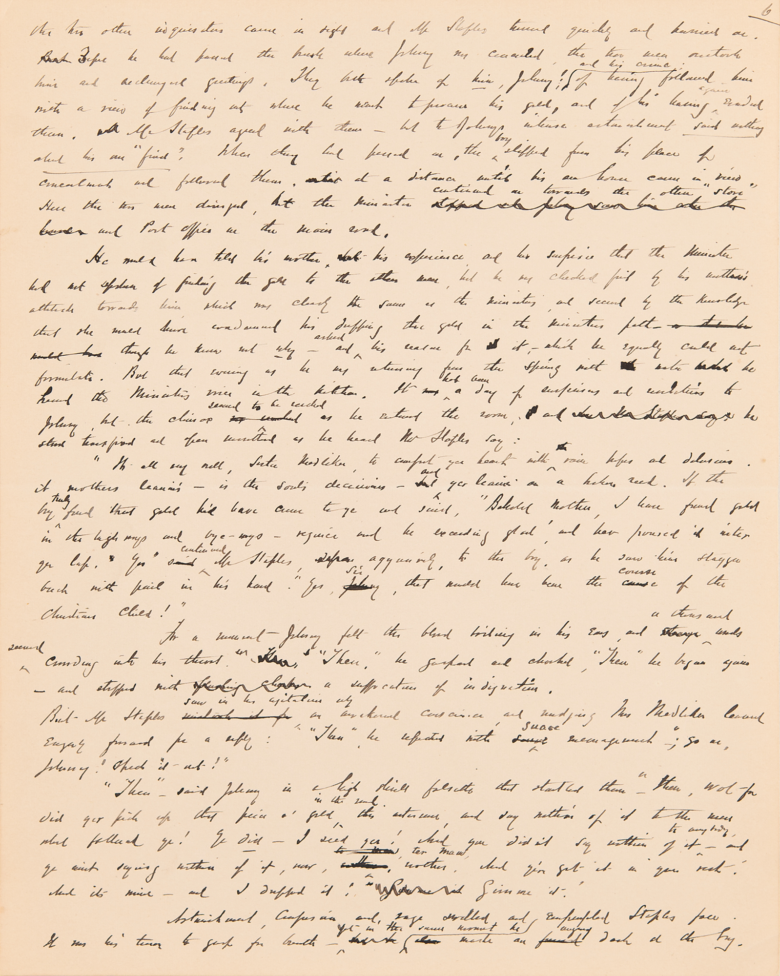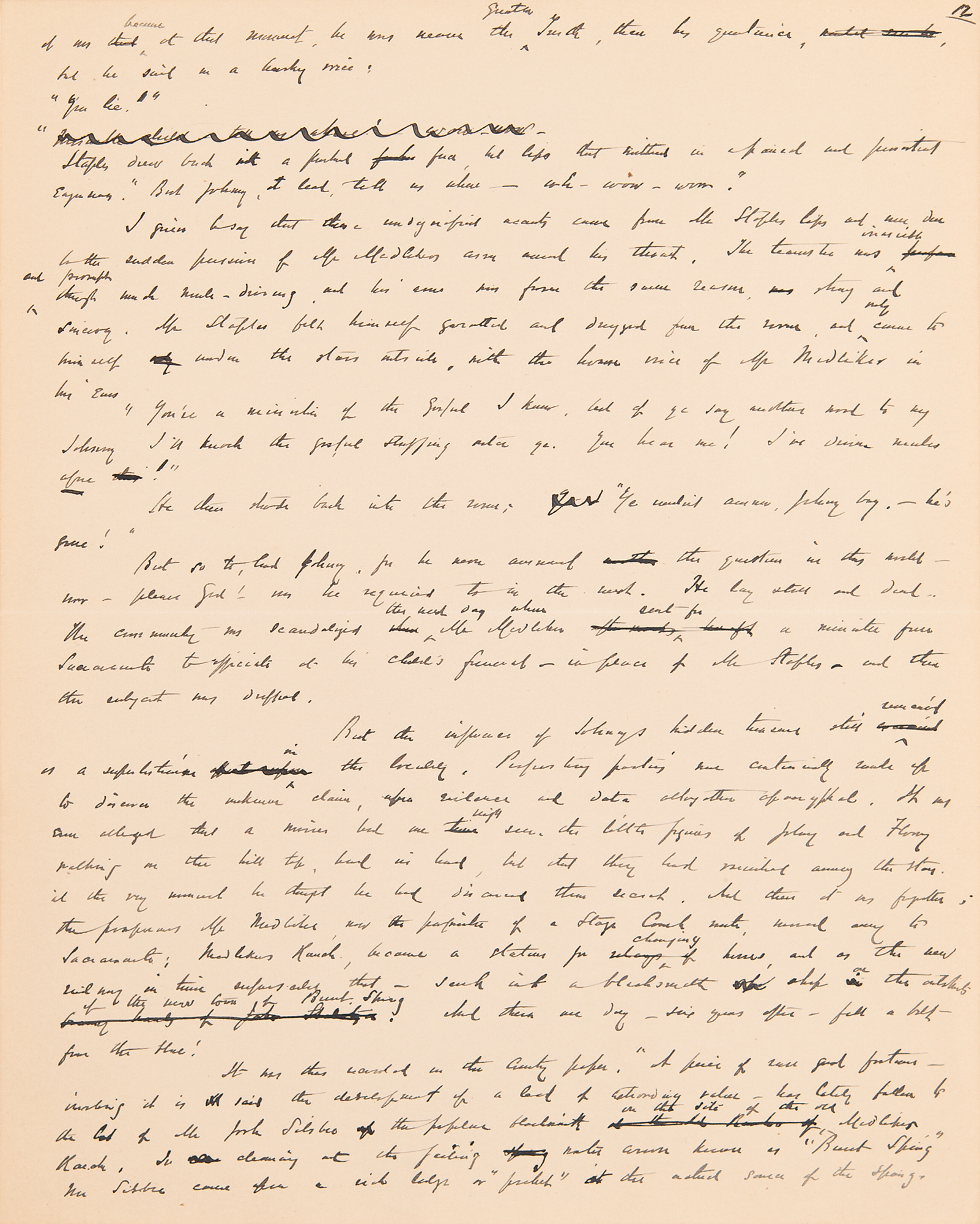 American author (1836-1902) best known for his colorful tales of California pioneers, including the much-anthologized story 'The Outcasts of Poker Flat.' AMS signed "Bret Harte," thirteen pages, 7 x 9, August 20, 1896. Harte's draft of his short story "The Youngest Prospector in Calaveras," published in his collection Tales of Trail and Town in 1898. The story begins: "He was scarcely eight when it was believed that he could have reasonably laid claim to the above title. But he never did. He was a small boy, intensely freckled to the roots of his tawny hair, with even a suspicion of it in his almond-shaped but somewhat full eyes, which were the greenish hue of a ripe gooseberry. All this was very unlike his parents, from whom he diverged in resemblance in that fashion so often seen in the Southwest of America—as if the youth of the boundless West had struck a new note of independence and originality, overriding all conservative and established rules of heredity." In fine condition, with uniform toning to only the first page. A fabulous tale of the California gold rush by a celebrated observer of the American West.