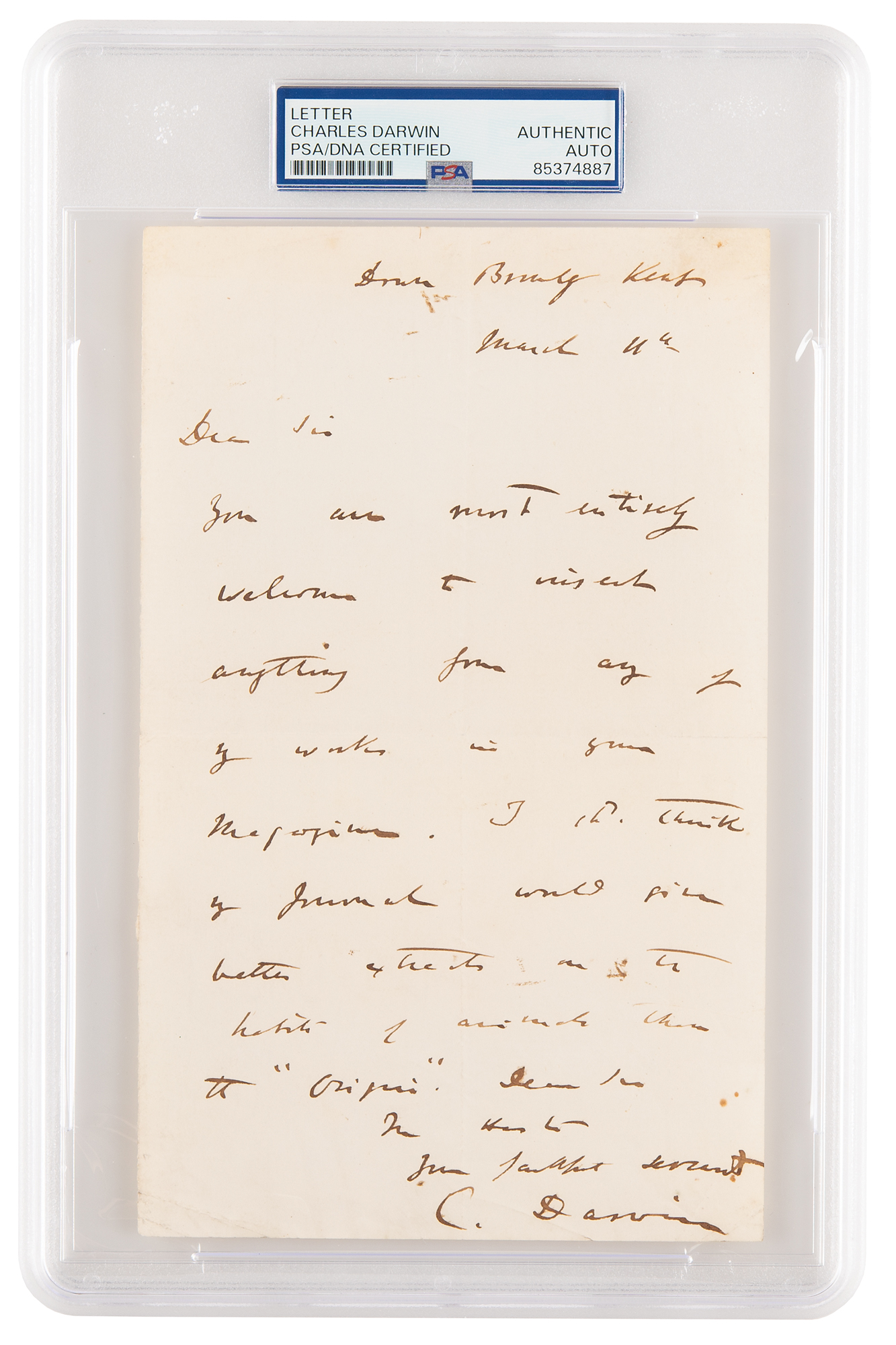 ALS signed “C. Darwin,” one page, 5 x 8, March 11, [no year but circa 1862–69]. Handwritten letter to a gentleman, granting permission to quote liberally from his famous works. In full: "You are most entirely welcome to insert anything from any of my works in your Magazine. I sh'd think my Journal would give better extracts on the habits of animals than the 'Origin.'" In fine condition. Encapsulated in a PSA/DNA authentication holder.