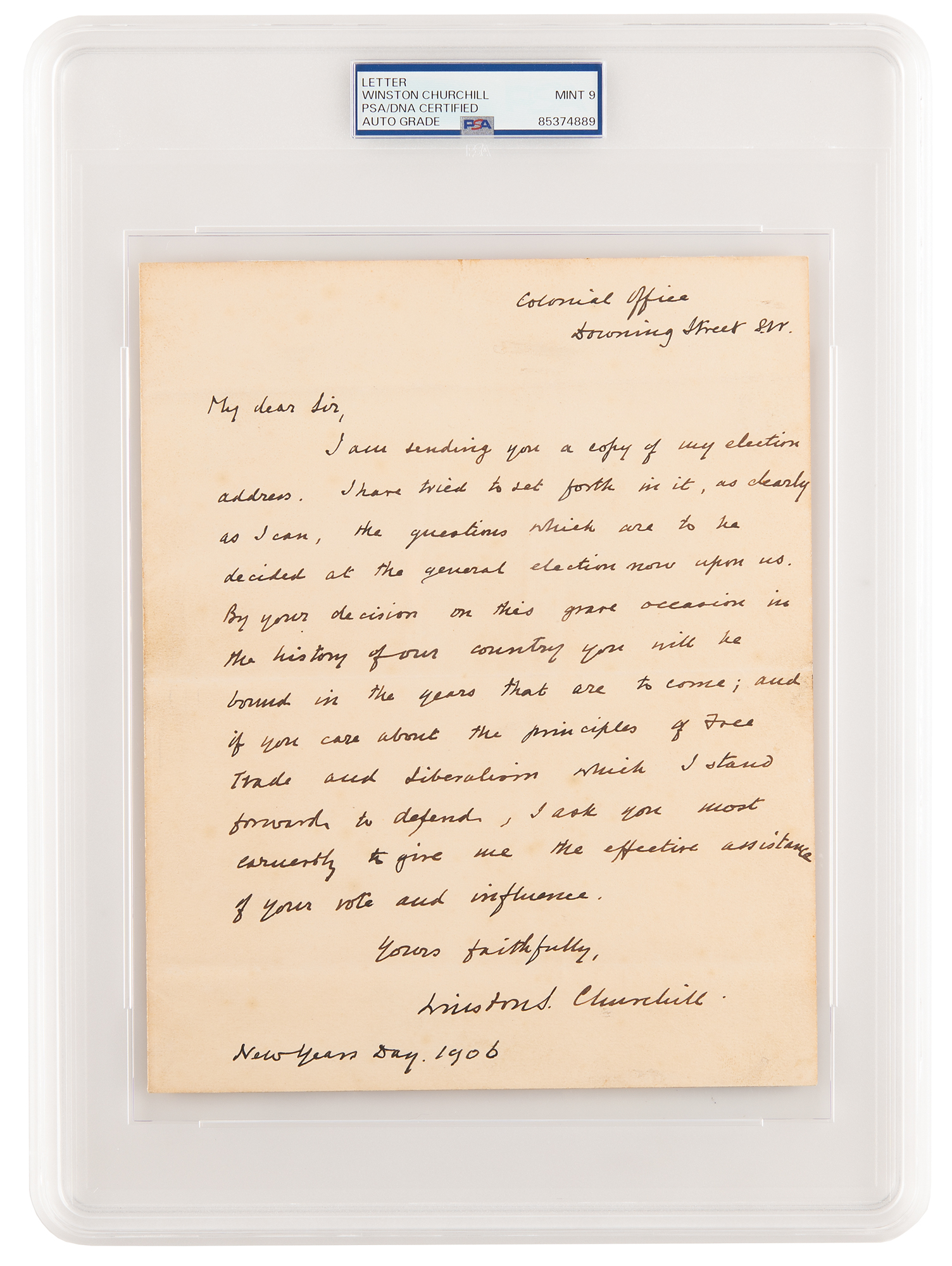 Significant ALS signed “Winston S. Churchill,” one page, 7.25 x 9, January 1, 1906. Addressed from the “Colonial Office, Downing Street,” a handwritten letter from Churchill to an unknown politician, requesting his support in the upcoming general election, in full: “I am sending you a copy of my election address. I have tried to set forth in it, as clearly as I can, the questions which are to be decided at the general election now upon us. By your decision on this grave occasion in the history of our country you will be bound in the years that are to come; and if you care about the principles of Free Trade and Liberalism which I stand forward to defend, I ask you most earnestly to give me the effective assistance of your vote and influence.” Reverse of second integral page blindstamped with the 'Colonial Office' seal. In fine condition. Encapsulated and graded by PSA/DNA as "MINT 9."