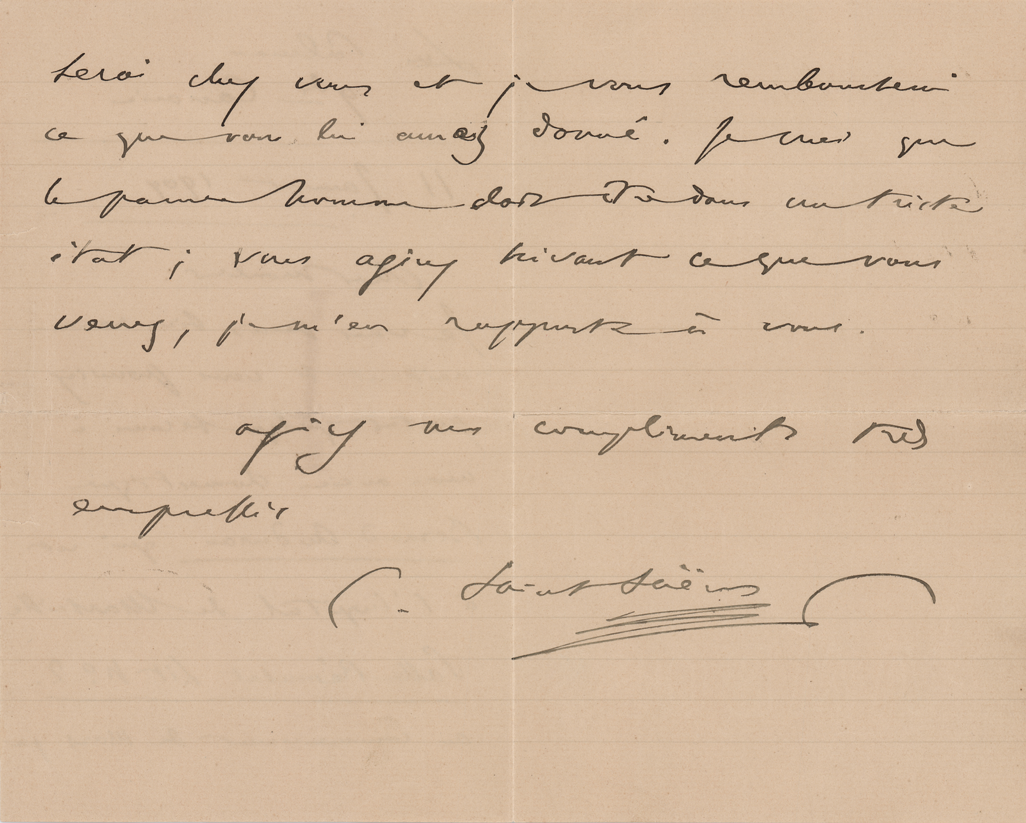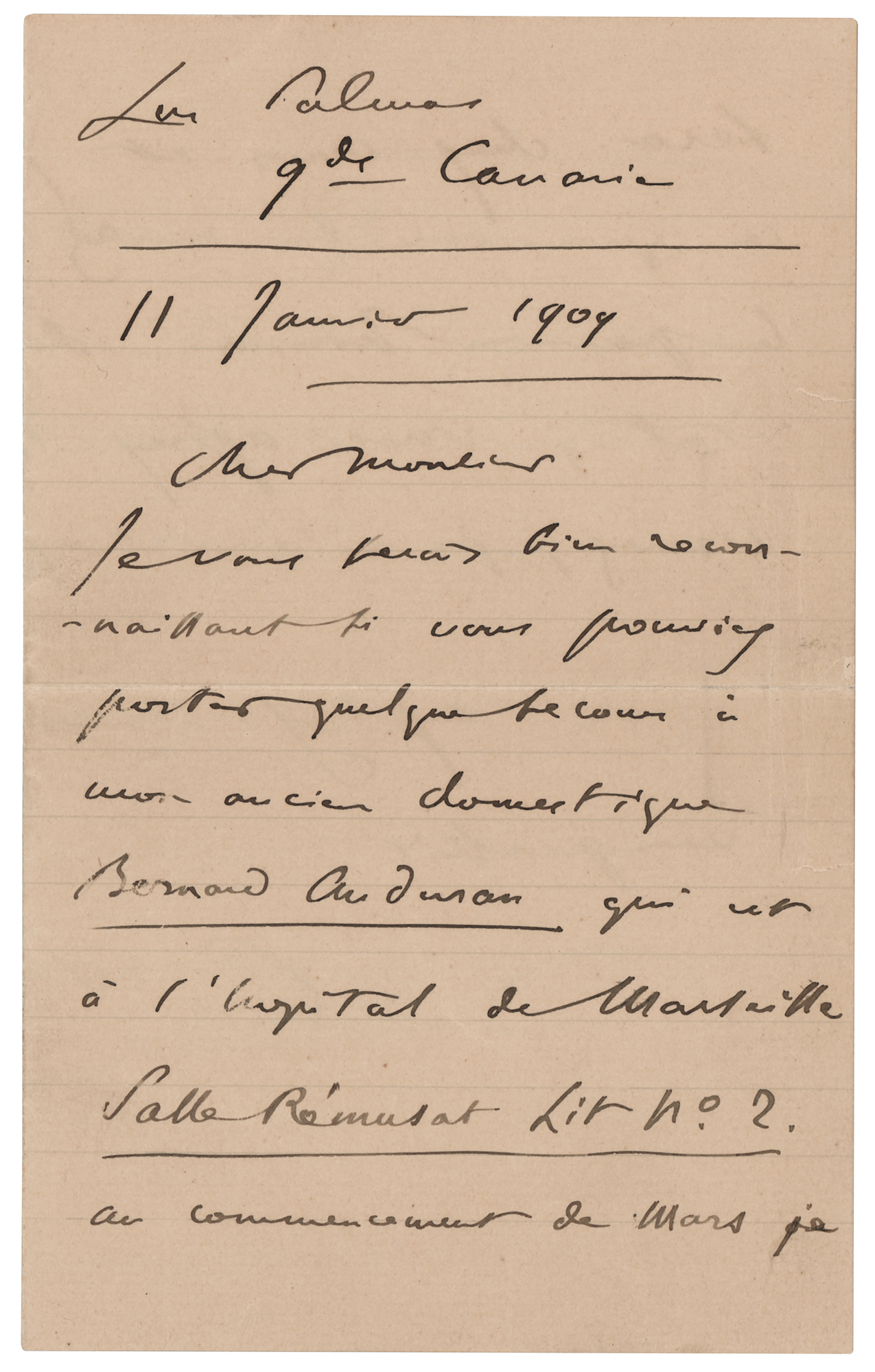 ALS in French, signed “C. Saint-Saens,” two pages on two adjoining sheets, 4.5 x 7, January 11, 1904. Untranslated handwritten letter addressed from the Spanish island city of Las Palmas de Gran Canaria. In fine condition.