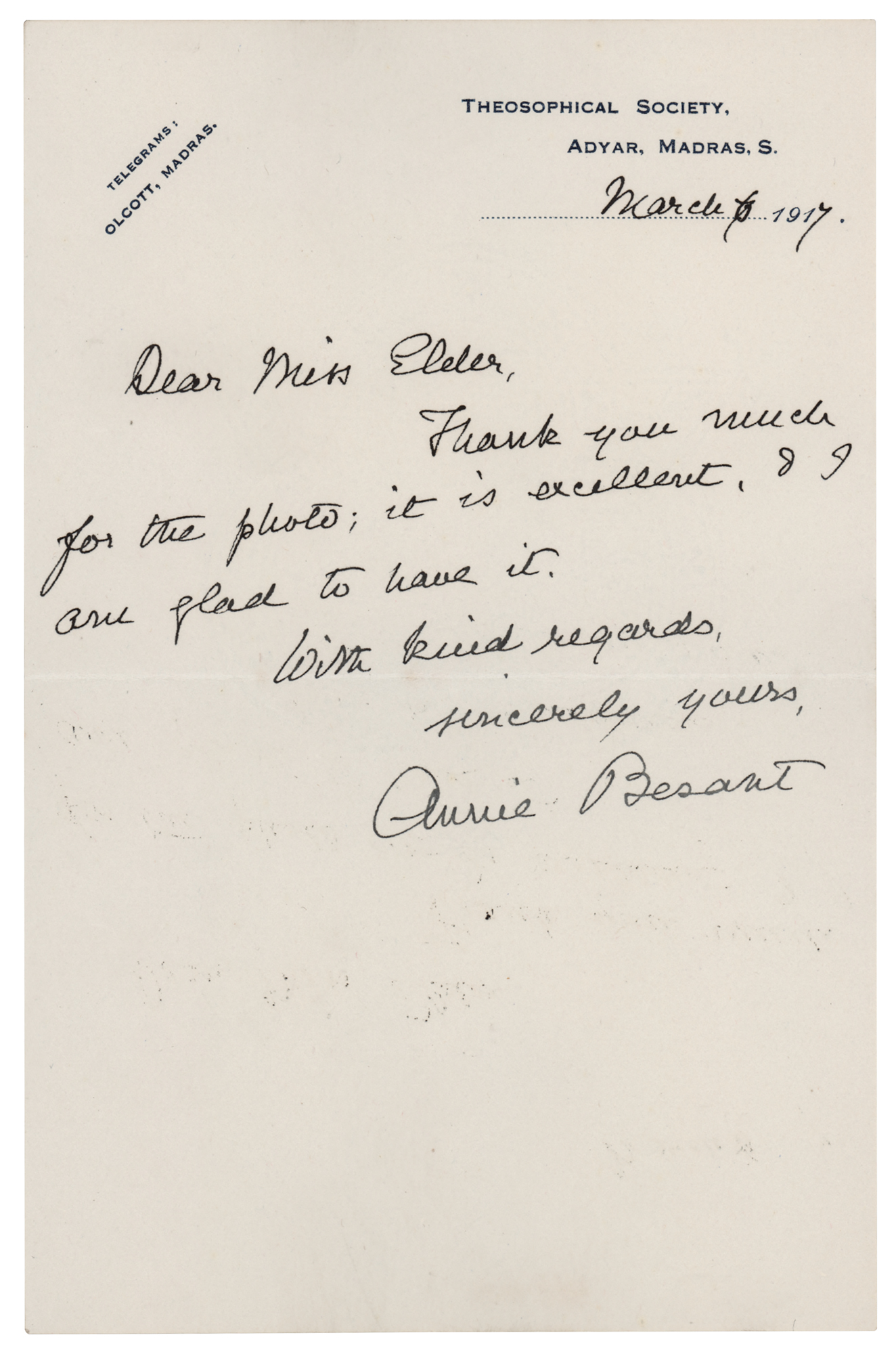 British theosophist, women's rights activist, and writer (1847-1933) who also became involved in Indian politics as an advocate for home rule. ALS, one page, 4.5 x 7, Theosophical Society letterhead, March 7, 1917. Handwritten letter to "Miss Eleler," in full: "Thank you much for the photo; it is excellent, & I am glad to have it." In fine condition.