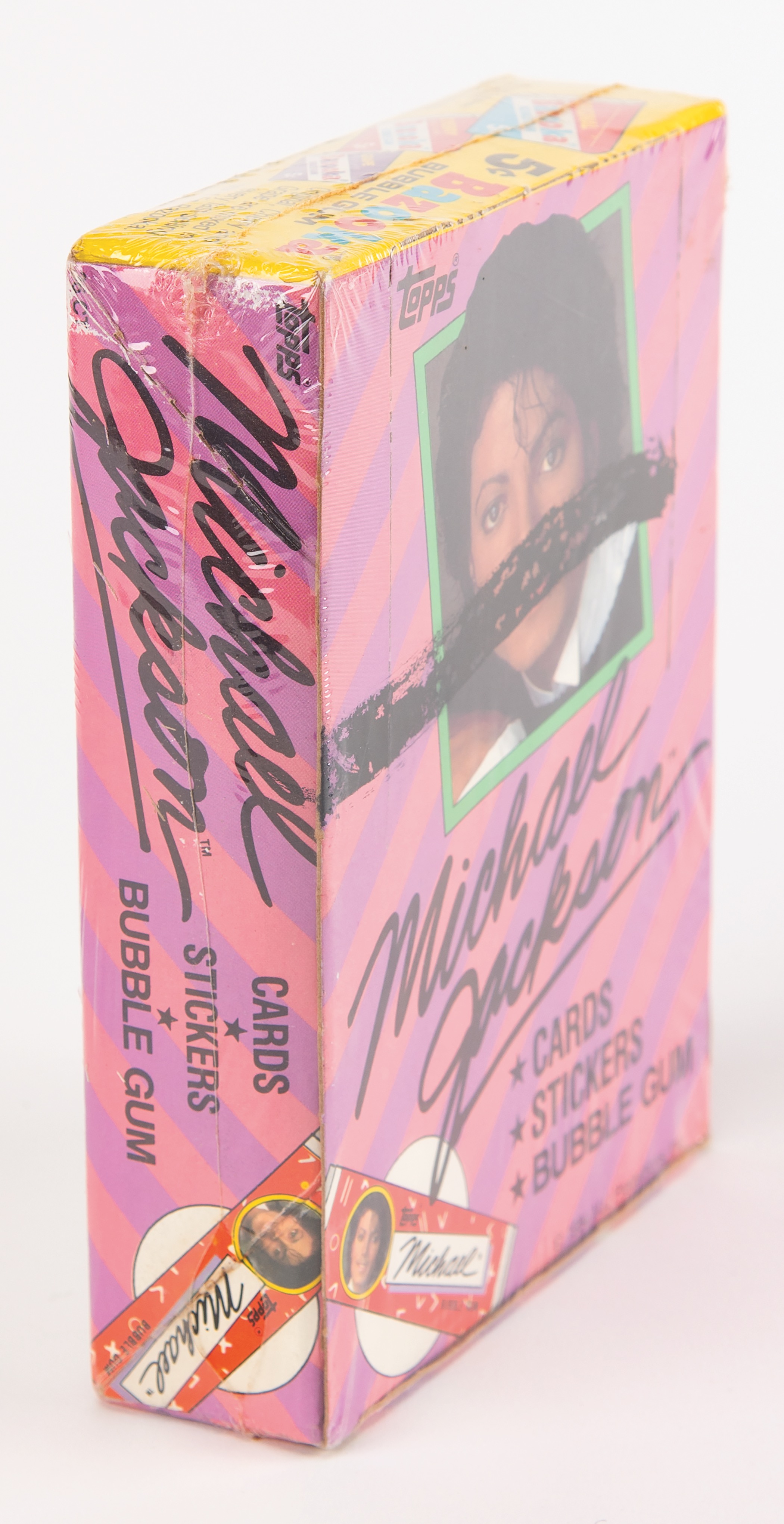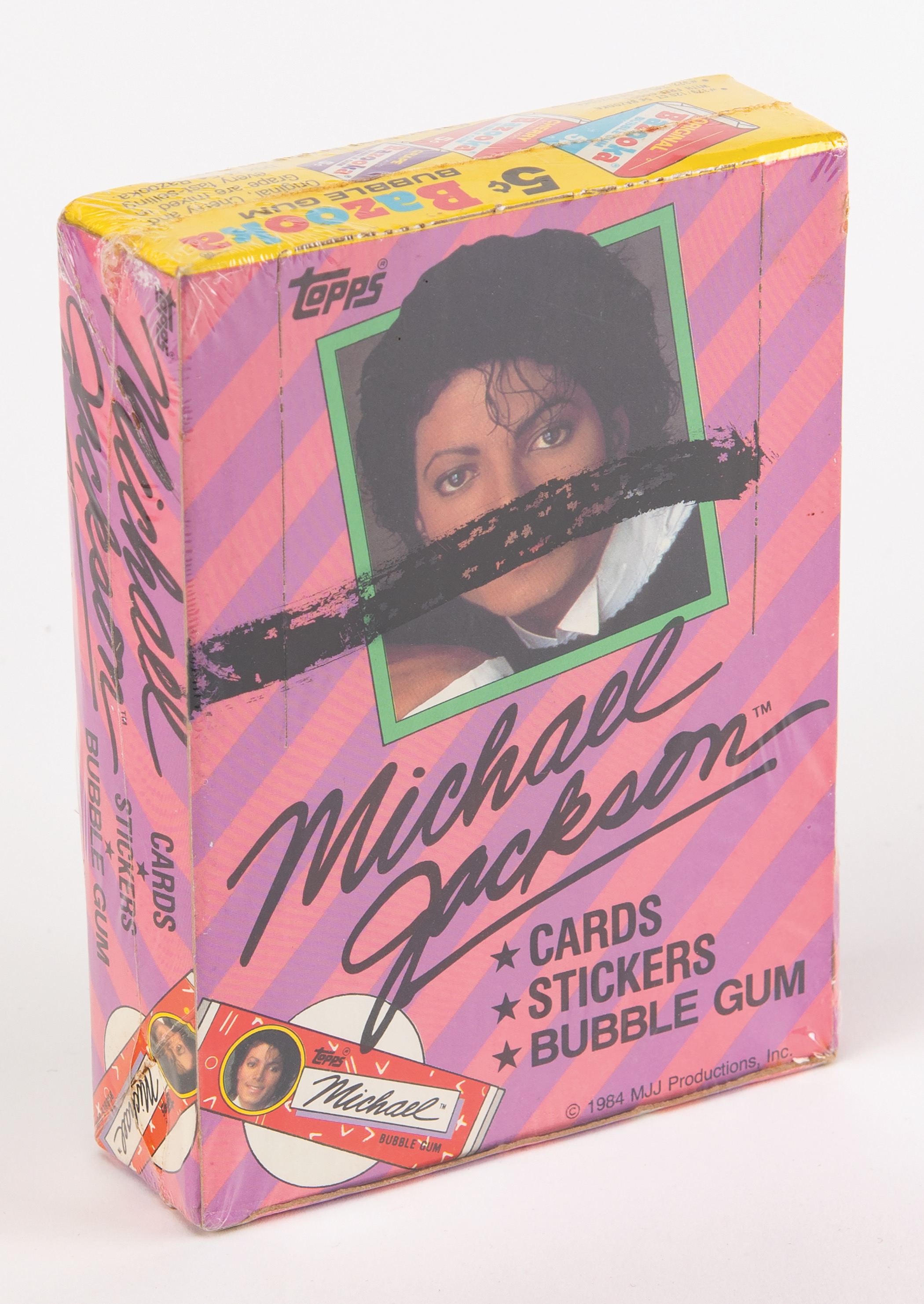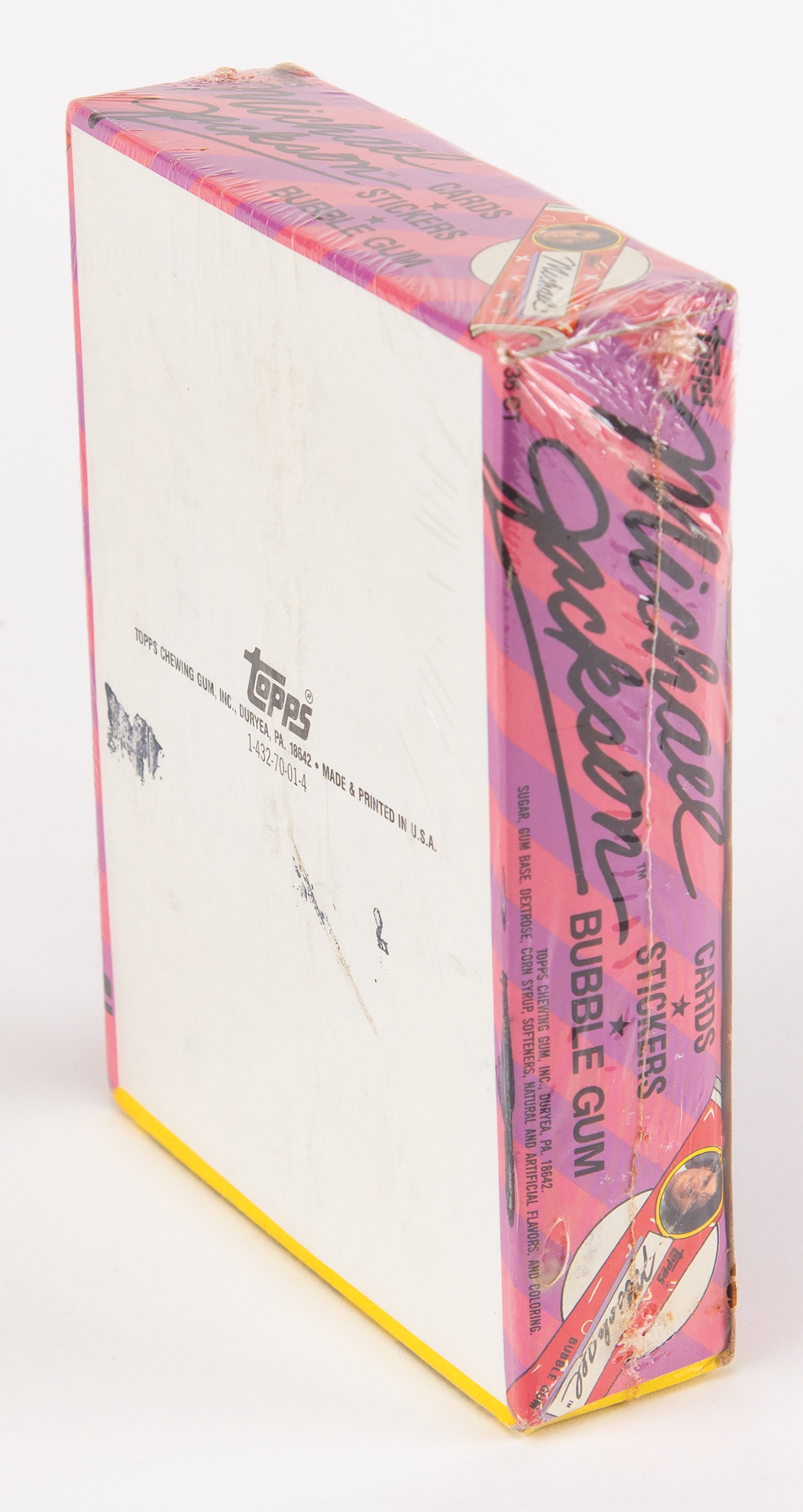 Unopened 1984 Topps first series Michael Jackson trading card wax box set, 5.5˝ x 7.25˝ x 1.75˝, containing 36 card packages with stickers and bubble gum. The cover and three sides bear Jackson’s image and facsimile signature, and the underside features the Topps logo and address. The top yellow edge of the box has a Bazooka bubble gum advertisement, and a copyright statement to the bottom edge of the front cover reads “1984 MJJ Productions, Inc.” Sealed in its original wrapper and in fine condition, with light wear to corners and edges.