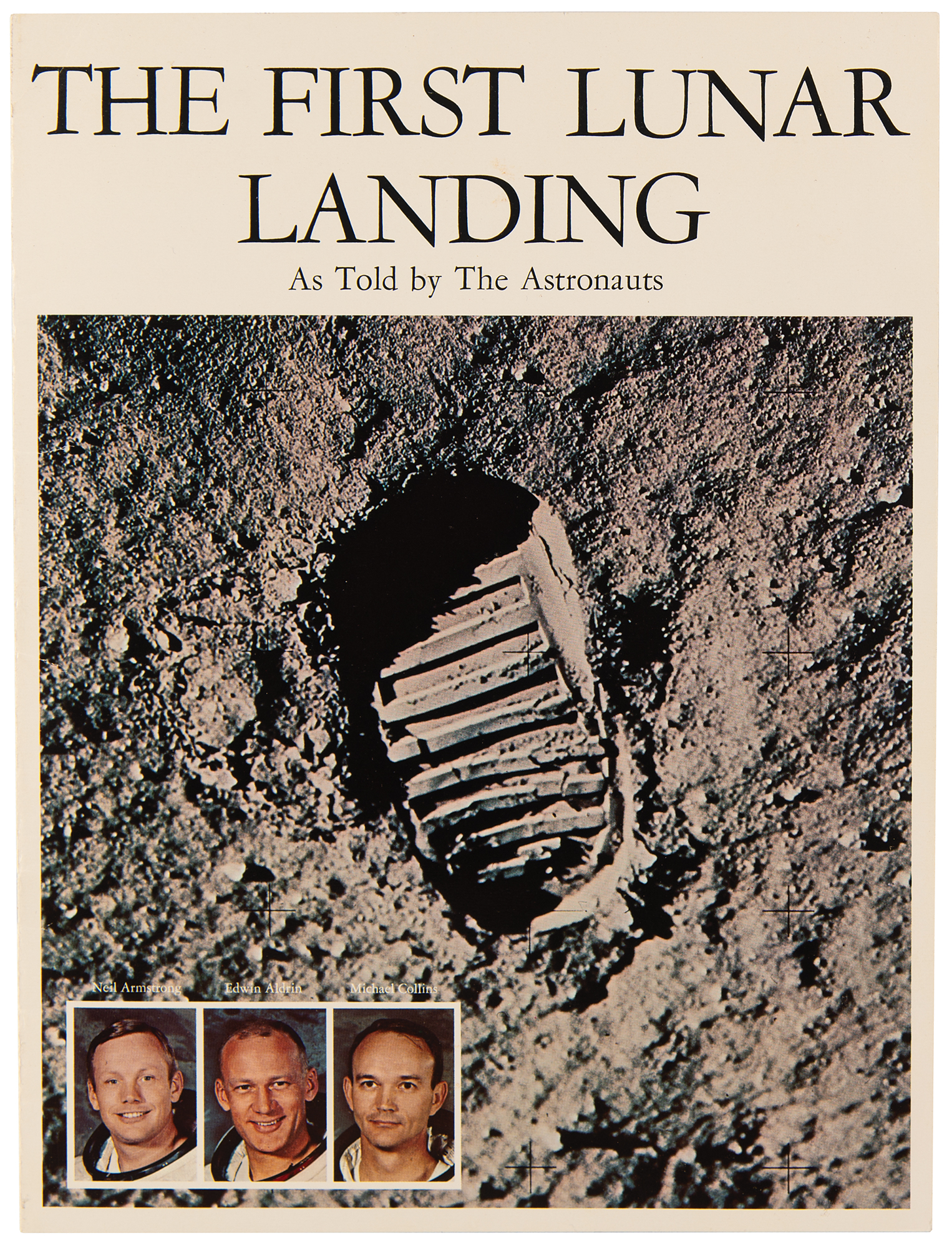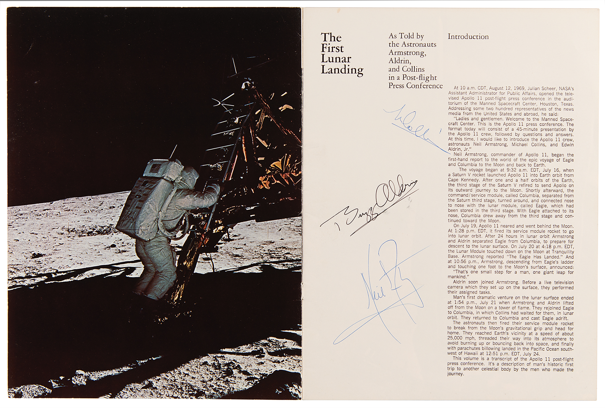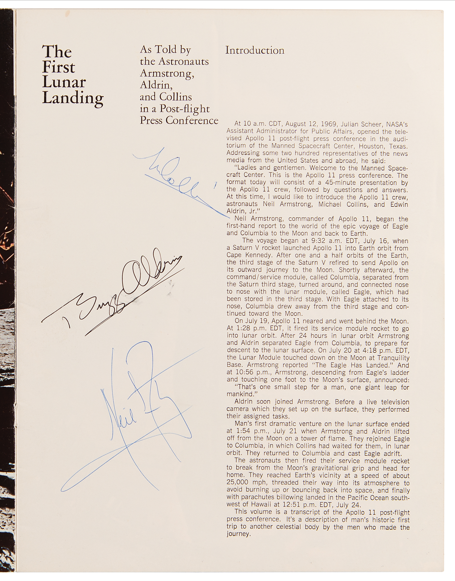 Fantastic official NASA report entitled "The First Lunar Landing: As Told by The Astronauts," 24 pages, 9 x 12, published in 1970 by the Government Printing Office, signed on the first page in blue ballpoint by Neil Armstrong and Michael Collins, and in black felt tip by Buzz Aldrin. The detailed report chronicles mankind's historic first lunar landing from liftoff to splashdown, as told by the astronauts in their post-flight press conference and illustrated with full color images from the mission. In fine condition, with very slight brushing to Aldrin's signature.