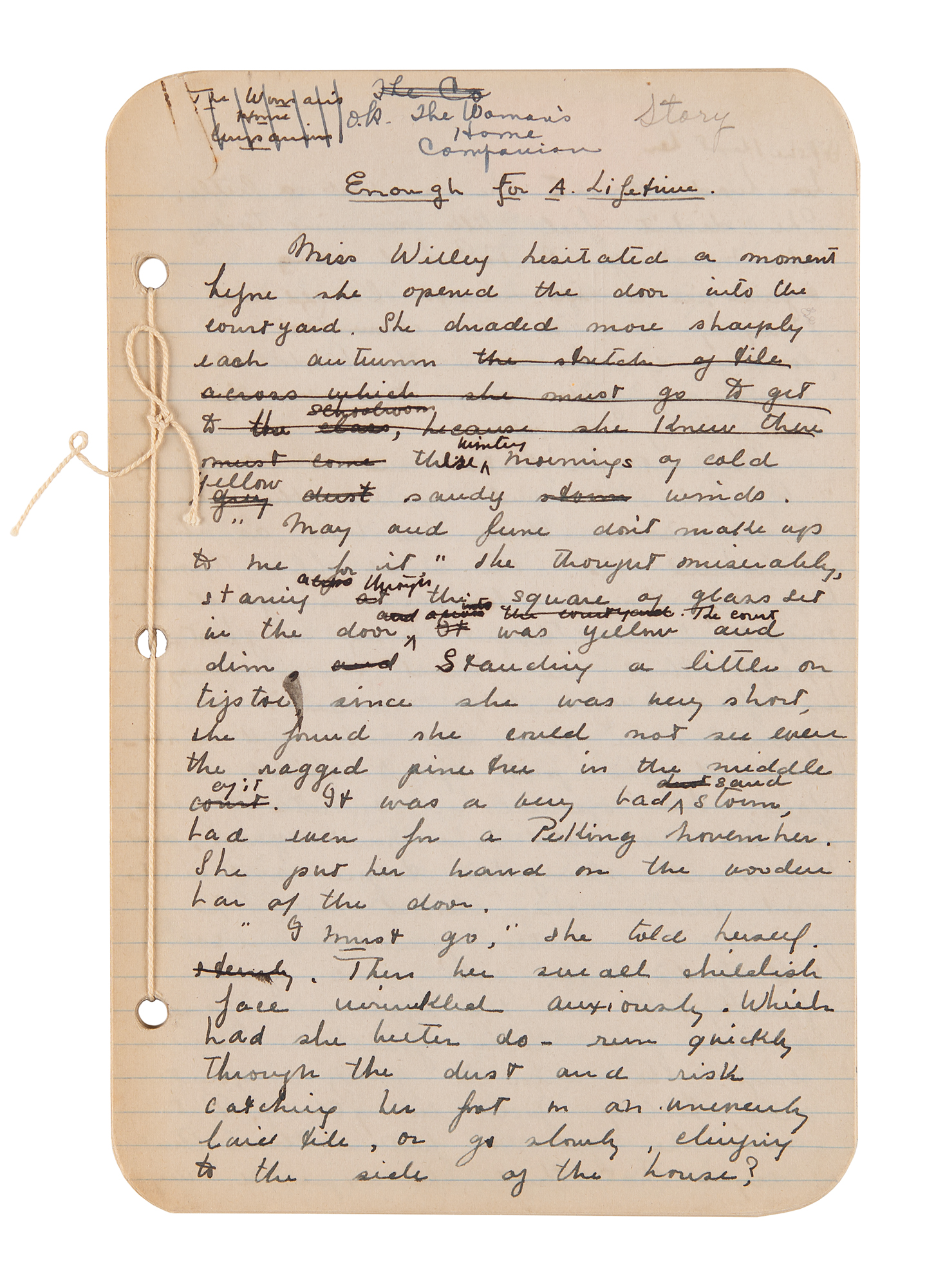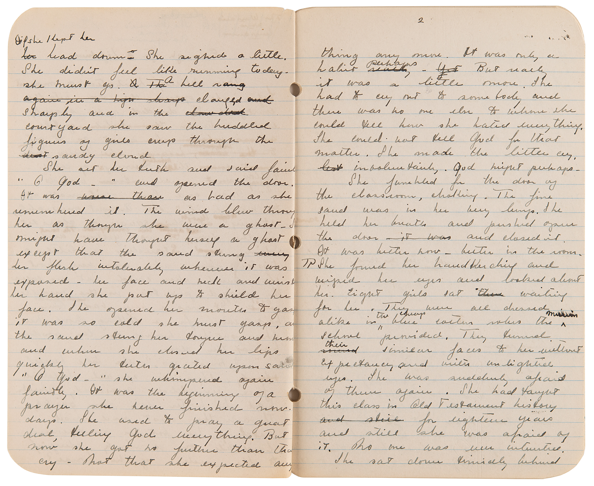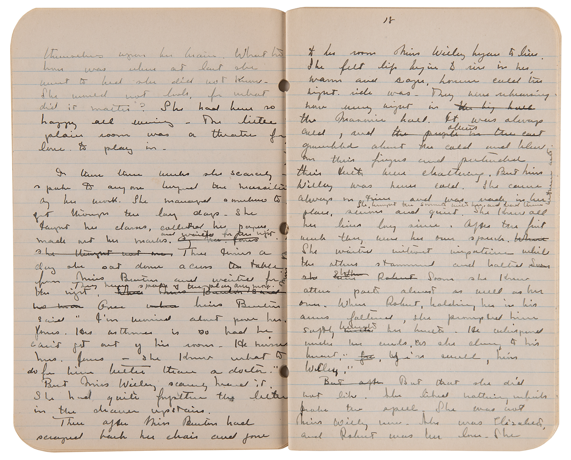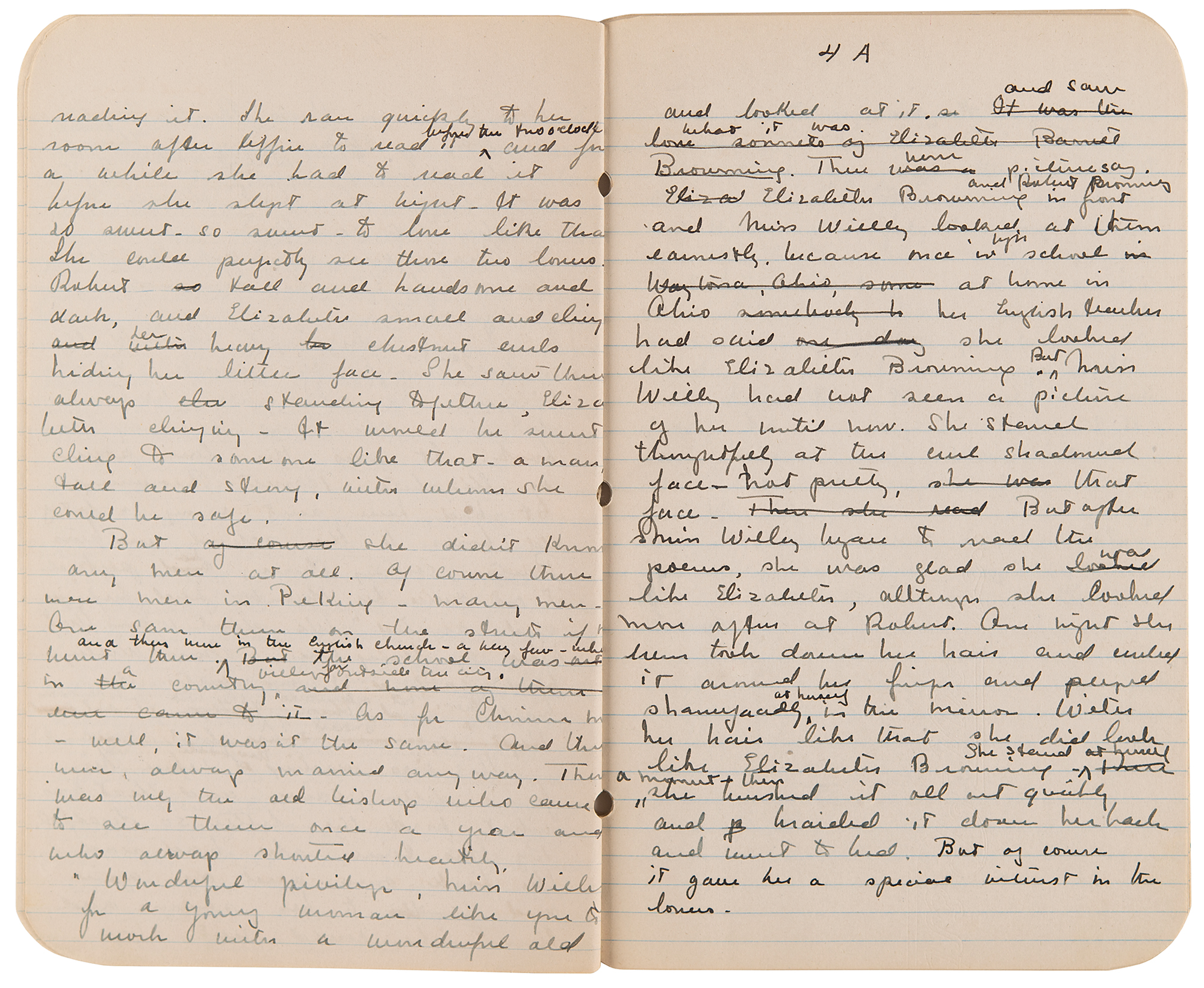 American writer and novelist (1892–1973) best known for The Good Earth, a novel that dramatizes family life in a 20th-century Chinese village, which won the Pulitzer Prize for Fiction in 1932 and contributed to her receipt of the Nobel Prize for Literature in 1938. Unsigned handwritten draft manuscript by Pearl S. Buck for a piece entitled "Enough For A Lifetime," totaling 49 pages on 26 loose-leaf leaves neatly tied together at left margin, no date but first published in the January 1935 issue of Woman's Home Companion. Buck has extensively corrected the text, with numerous deletions and revisions throughout. The manuscript begins: "Miss Willey hesitated a moment before she opened the door into the courtyard. She dreaded more sharply each autumn these winter mornings of cold yellow sandy winds. 'May and June don't make up to me for it,' she thought miserably, staring through the square of glass set in the door." In fine condition. A desirable working draft by the Nobel and Pulitzer winner.