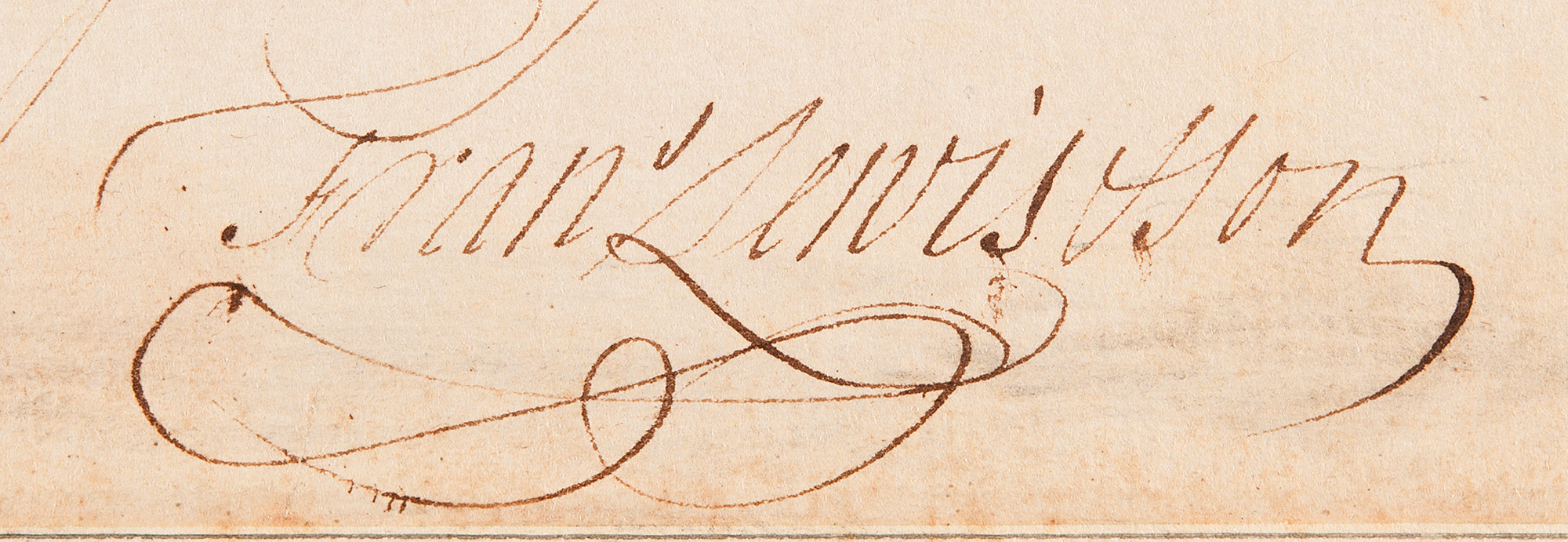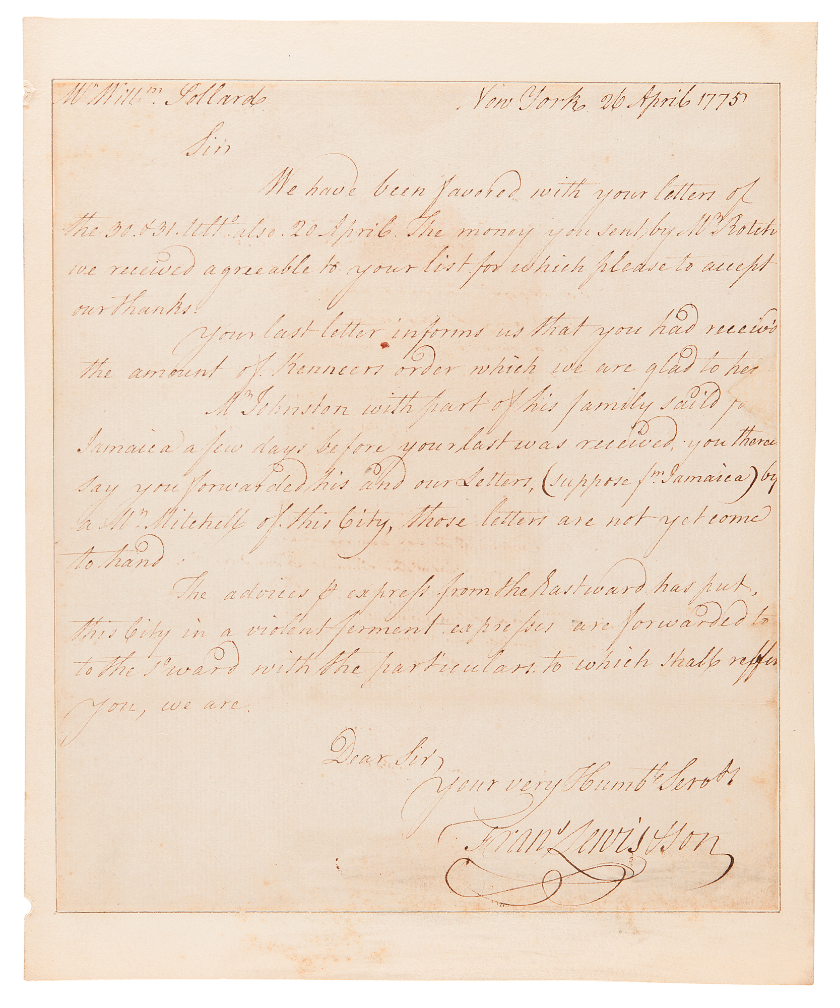 Signer of the Declaration of Independence from New York (1713–1802). Revolutionary War-dated ALS signed “Fra's Lewis & Son,” one page, 7.5 x 8.75, April 26, 1775. Handwritten letter to Philadelphia merchant to William Pollard, in full: "We have been favored with your letters of the 30 & 31 ult'o also 20 April. The money you sent by Mr. Rotch we received agreeable to your list for which please to accept our thanks. Your last letter informs us that you had receiv'd the amount of Kenneer's order which we are glad to he[ar].
