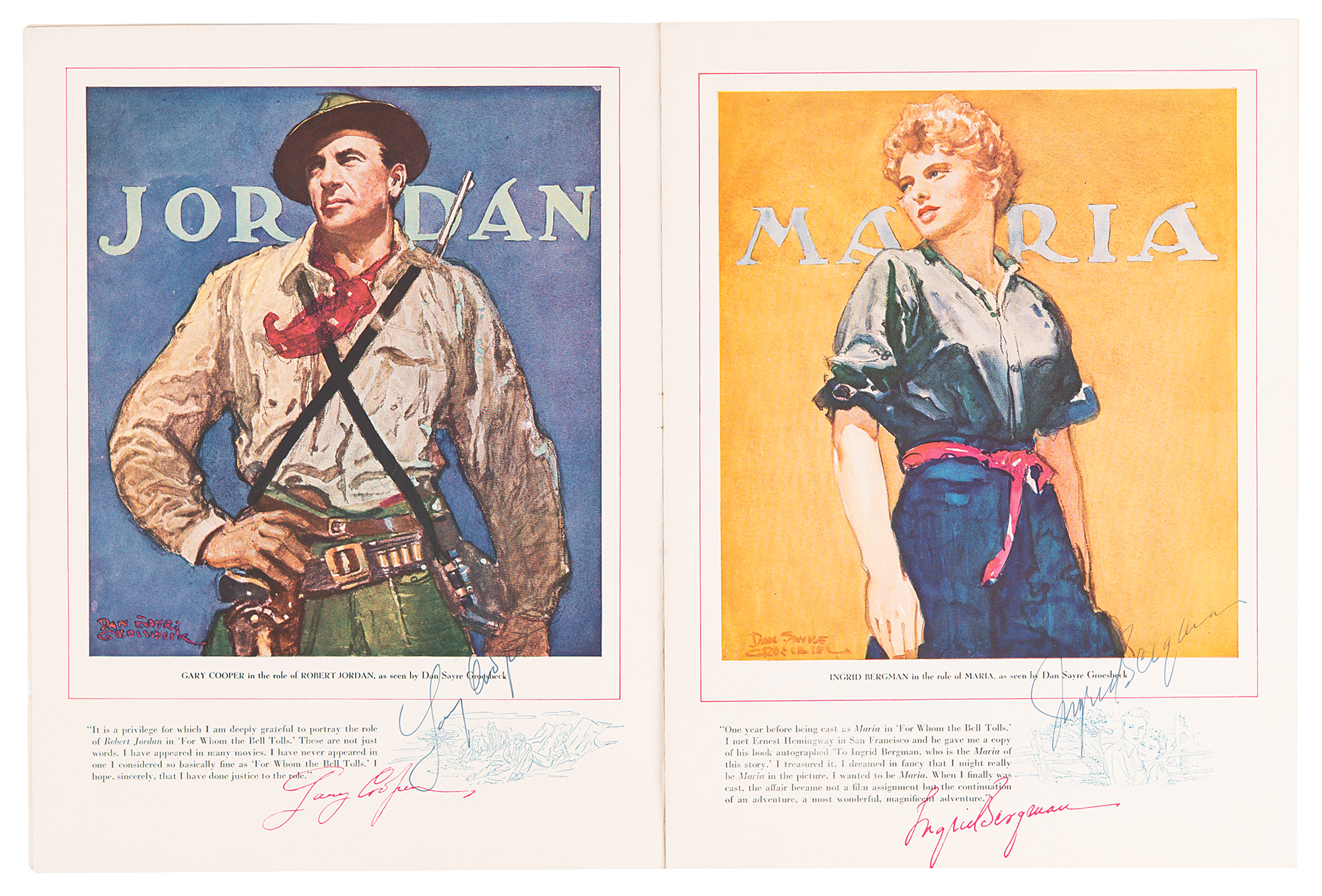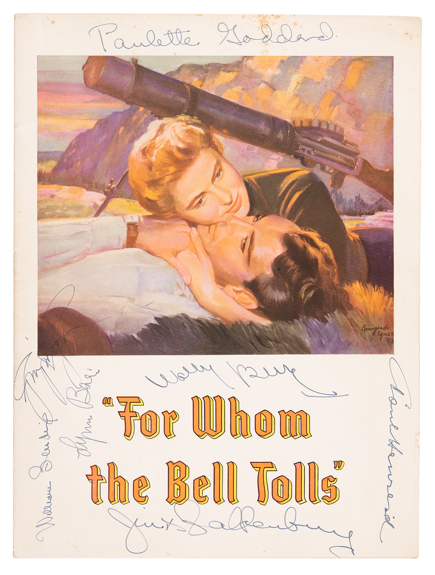 Original program for the 1943 Paramount Pictures epic war film For Whom the Bell Tolls, the first movie adaptation of Ernest Hemingway’s 1940 novel of the same name, 18 pages, 9 x 12, signed inside on their respective character pages in fountain pen by leading stars Gary Cooper and Ingrid Bergman. The front cover is also signed by classic actors and actresses Paulette Goddard, Wallace Beery, Ginger Rogers, Paul Henreid, William Bendix, Jinx Falkenburg, and Lynn Bari, and the back cover is signed by William Boyd. In fine condition, with a bit of scattered staining to the front cover.