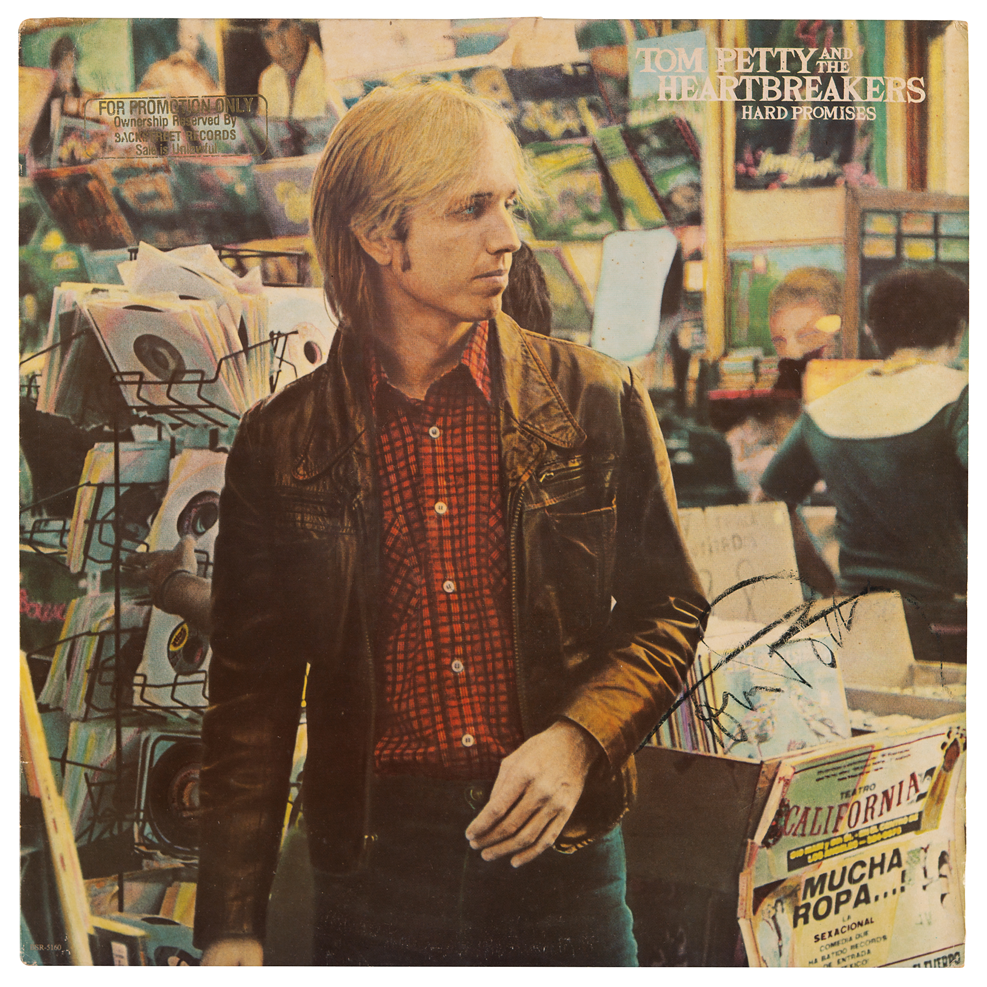 Hard Promises promotional album by Tom Petty and the Heartbreakers, signed on the front in black felt tip by Petty. In very good to fine condition, with a light circular surface impression, and very slight brushing to the signature. The record is included. A vintage signature from the rock icon.