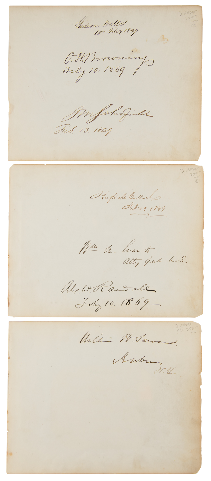 Seven signatures of members of Andrew Johnson's cabinet on three off-white 8 x 6.5 album pages, including: Secretary of State William H. Seward, Secretary of the Treasury Hugh McCulloch, Attorney General William Evarts, Postmaster General Alexander W. Randall, Secretary of the Navy Gideon Welles, Secretary of the Interior Orville H. Browning, and Secretary of War John M. Schofield. Several date their signatures to 1869. In overall fine condition.