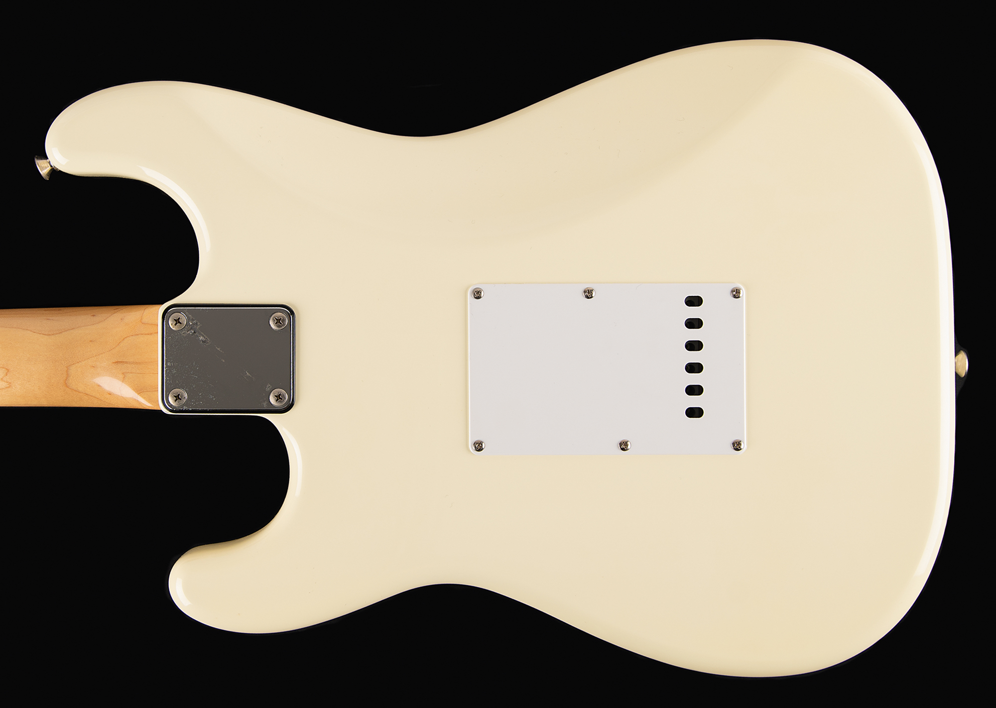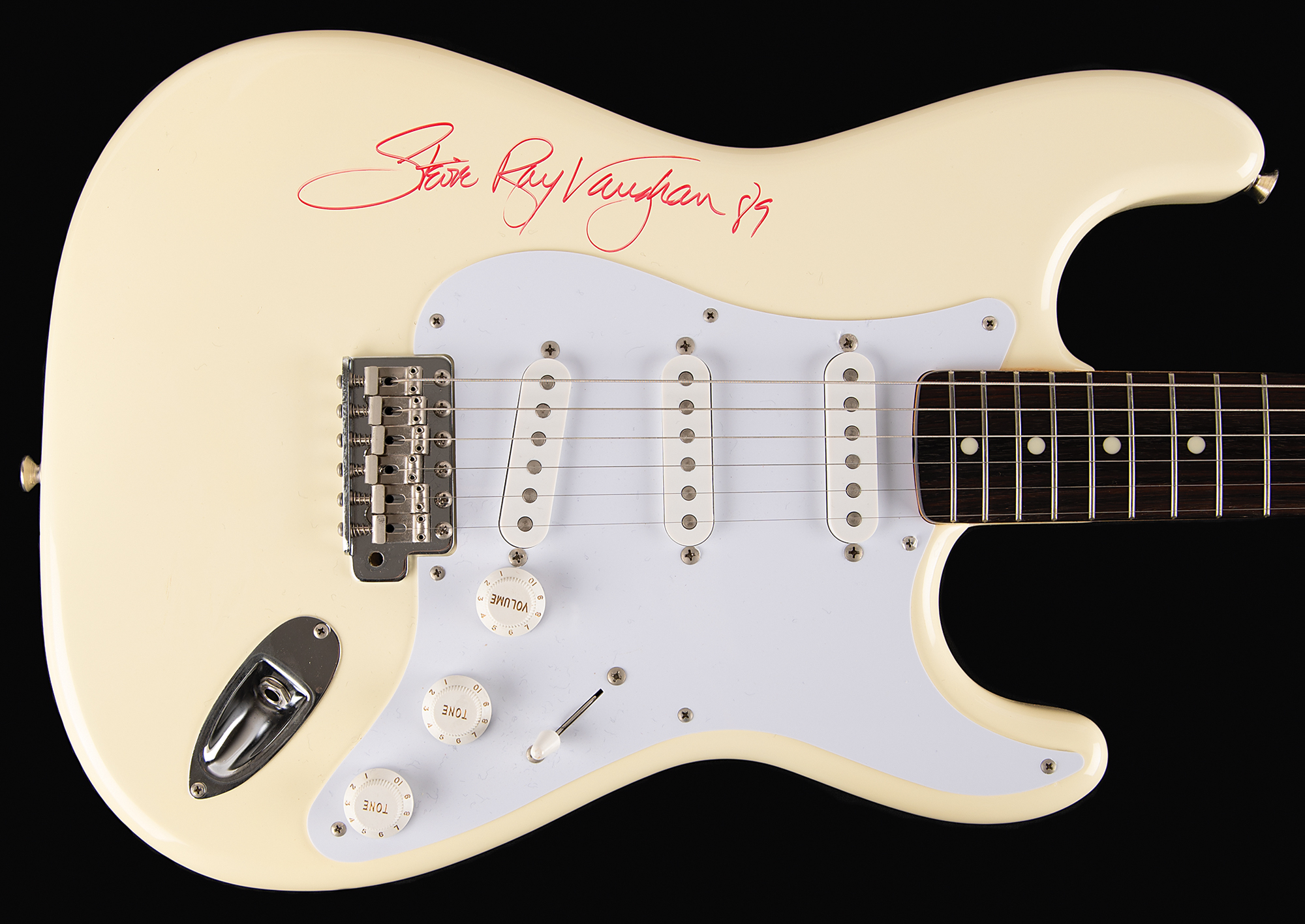 Beautiful cream-bodied 1989 Fender Stratocaster electric guitar (made in Japan), serial no. E963919, neatly signed on the body in red felt tip, "Stevie Ray Vaughan, 89." In fine condition. Includes a Fender hardshell case. Accompanied by a full letter of authenticity from REAL. Like any legendary guitarist, Vaughan is exceptionally desirable in signed guitars; given his early death, however, they are quite rare. Guitars signed on the body, rather than the pickguard, are the most highly sought after. An absolutely magnificent piece boasting a huge SRV signature.
