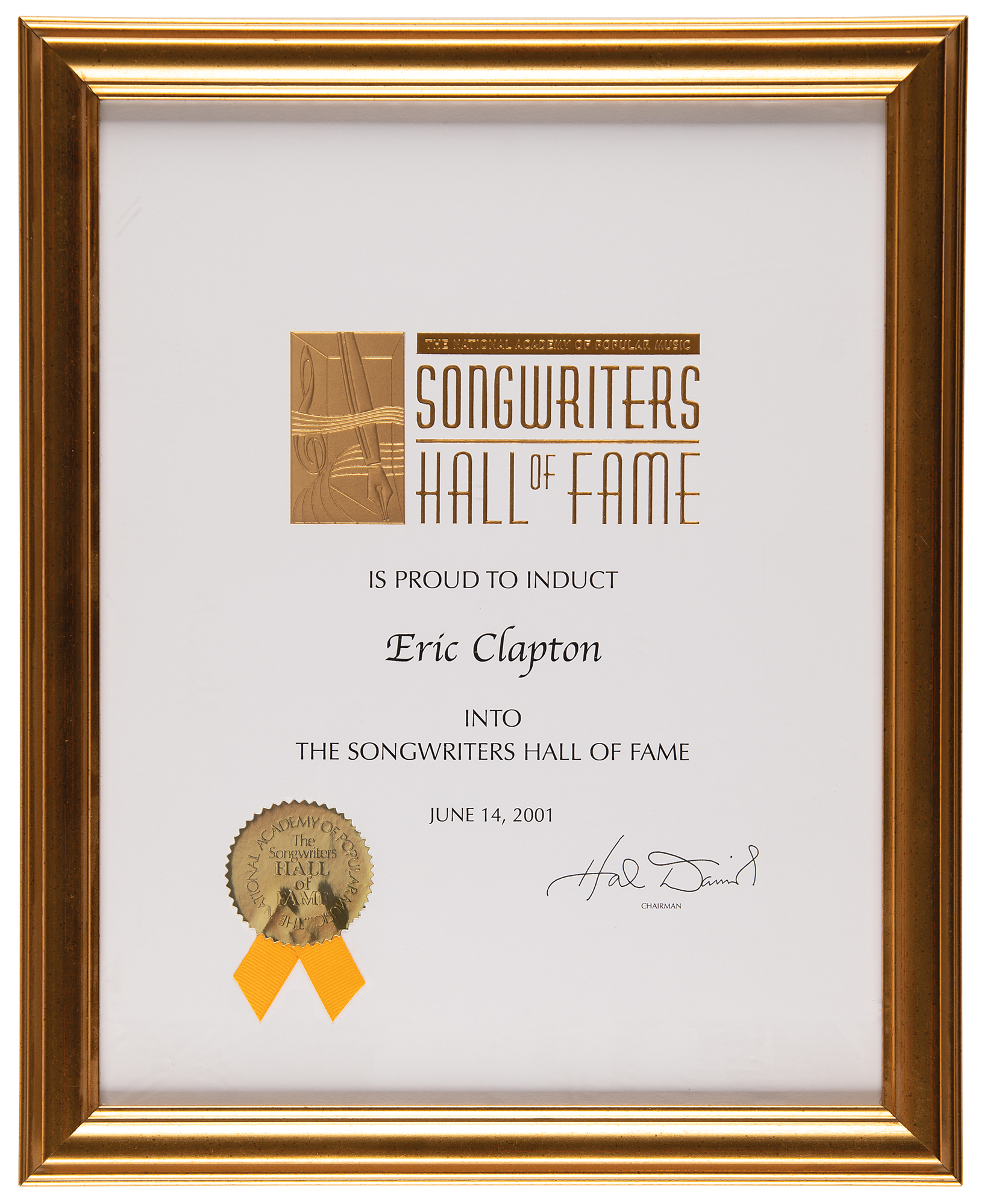 Songwriters Hall of Fame induction certificate presented to Eric Clapton, signed in ink by chairman Hal David, 10.75 x 13.75, June 14, 2001. In full: "The National Academy of Popular Music Songwriters Hall of Fame is proud to induct Eric Clapton into the Songwriters Hall of Fame, June 13, 2001." Retains its gold seal and ribbon affixed at the lower left. Framed to an overall size of 13 x 16. In fine condition.