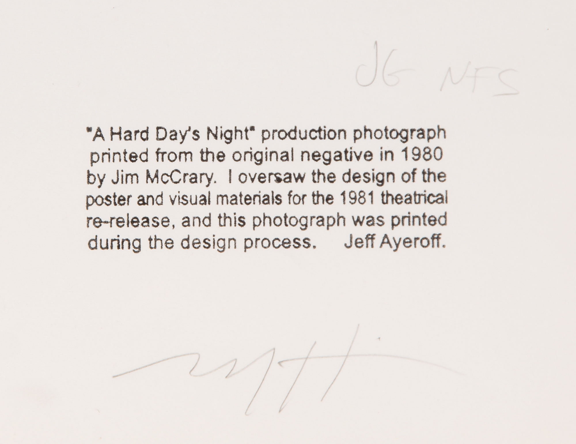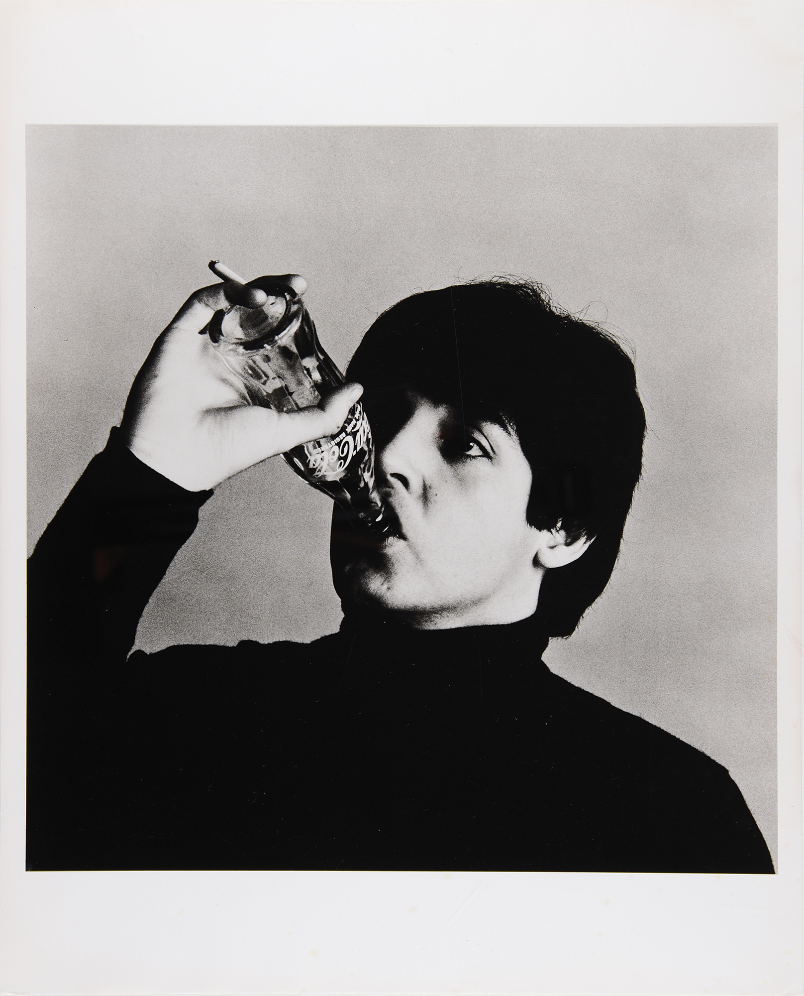 Oversized original semi-glossy 16 x 20 silver gelatin photograph of Paul McCartney drinking a bottle of Coca-Cola with cigarette in hand, taken during the filming of A Hard Day’s Night in 1964 and printed circa 1980 from the original negative. Reverse is stamped: “‘A Hard Day’s Night’ production photograph printed from the original negative in 1980 by Jim McCrary. I oversaw the design of the poster and visual materials for the 1981 theatrical re-release, and this photograph was printed during the design process. Jeff Ayeroff.” Signed below in pencil by legendary music business executive Jeff Ayeroff. In fine condition, with light surface 'dimpling' to McCartney's dark sweater, visible at an angle.