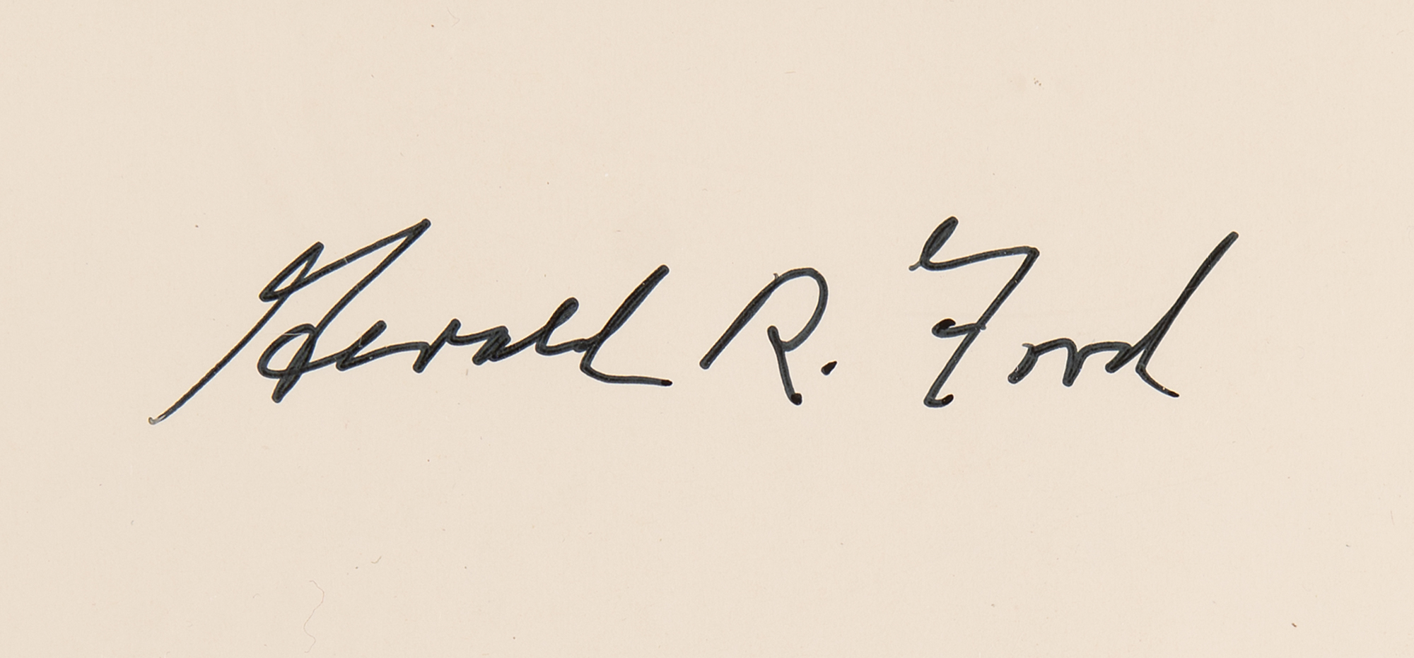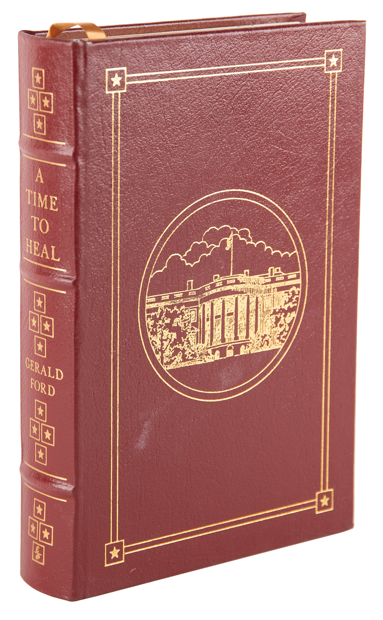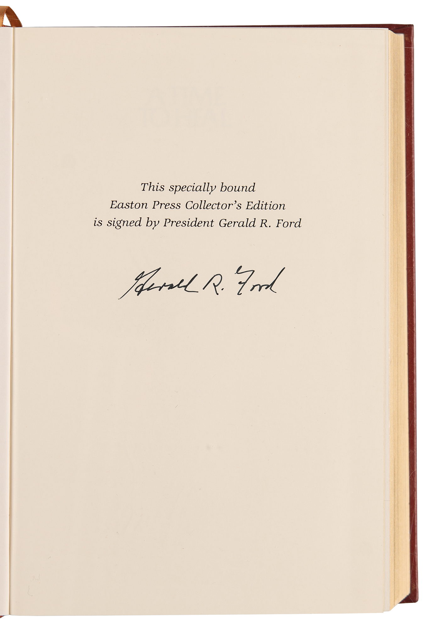 Signed book: A Time to Heal. Collector's edition. Norwalk, CT: The Easton Press, 1987. Leatherbound hardcover, 6.5 x 9.5, 454 pages. Signed on the colophon in black felt tip, "Gerald R. Ford." In fine condition, with a bumped lower front corner.