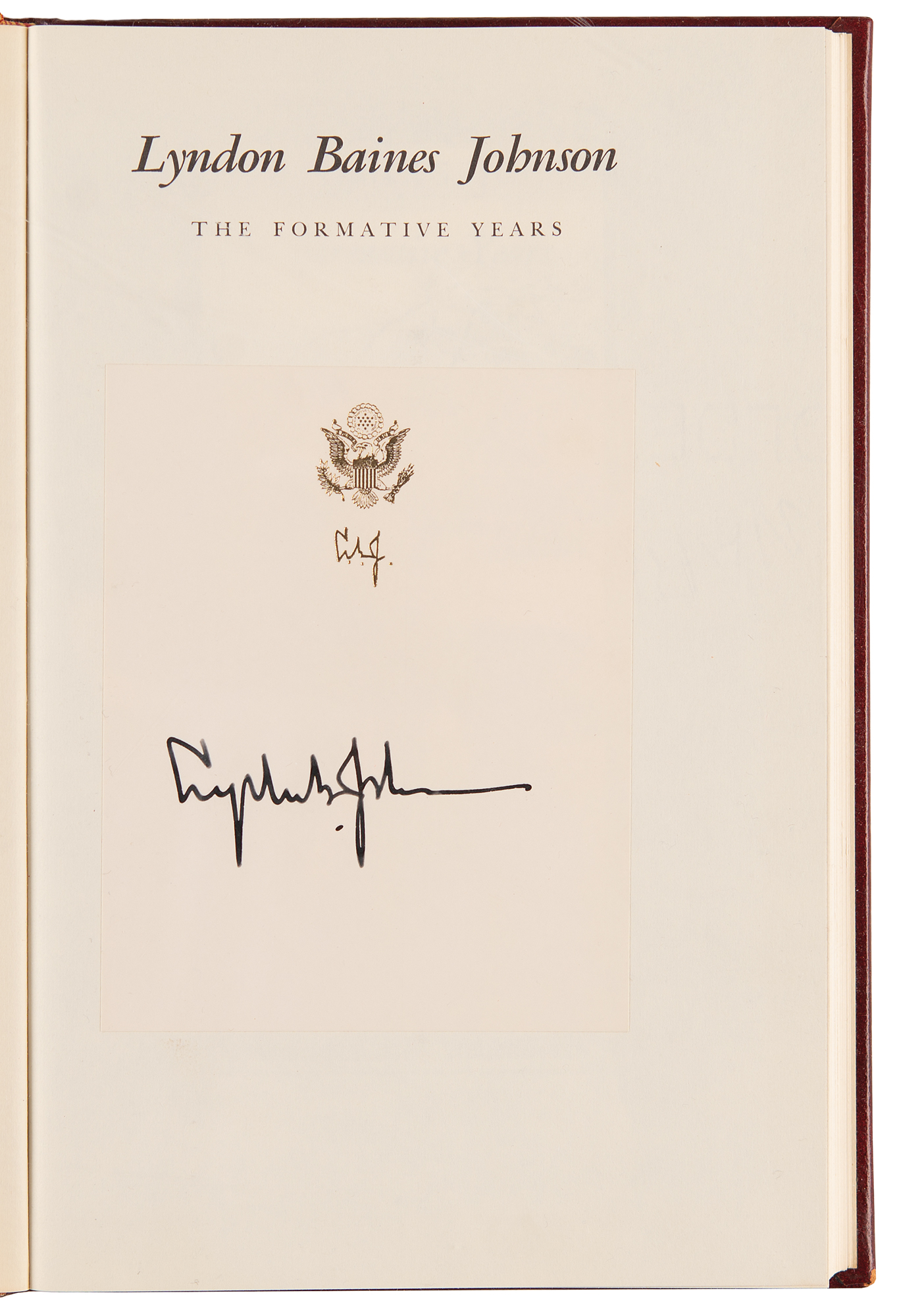 Signed book: Lyndon Baines Johnson: The Formative Years. First edition. San Marcos: Southwest Texas State College Press, 1965. Leatherbound hardcover, 6.25 x 9.25, 185 pages. Signed on a bookplate affixed to the half-title page in fountain pen, "Lyndon B. Johnson." In very fine condition.