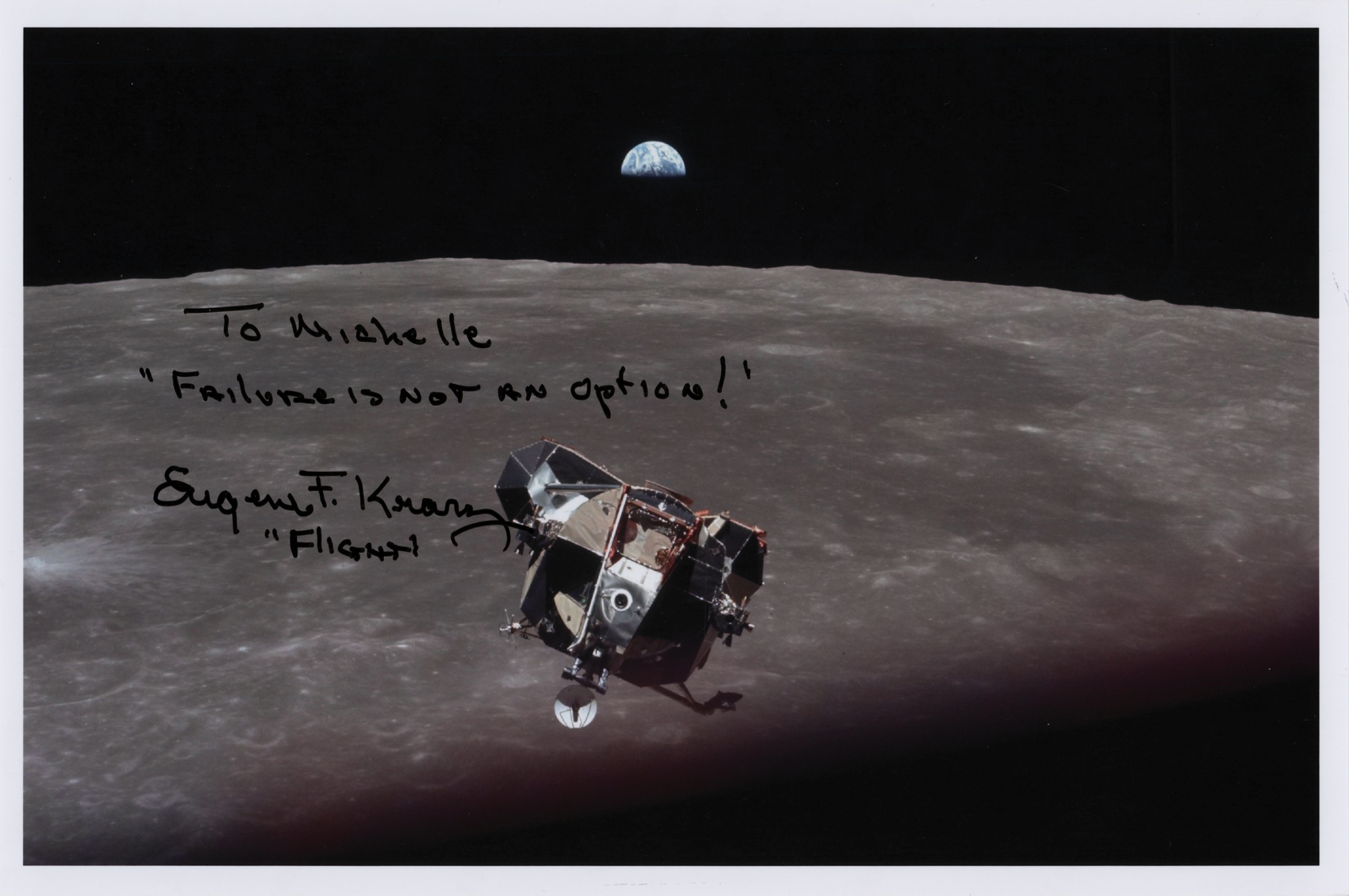 Color glossy 12 x 8 photo of the Apollo 11 Lunar Module 'Eagle' high above the lunar surface with the Earth visible in the background, signed and inscribed in black felt tip, "To Michelle, 'Failure is not an option!' Eugene F. Kranz, 'Flight.'" In very fine condition.