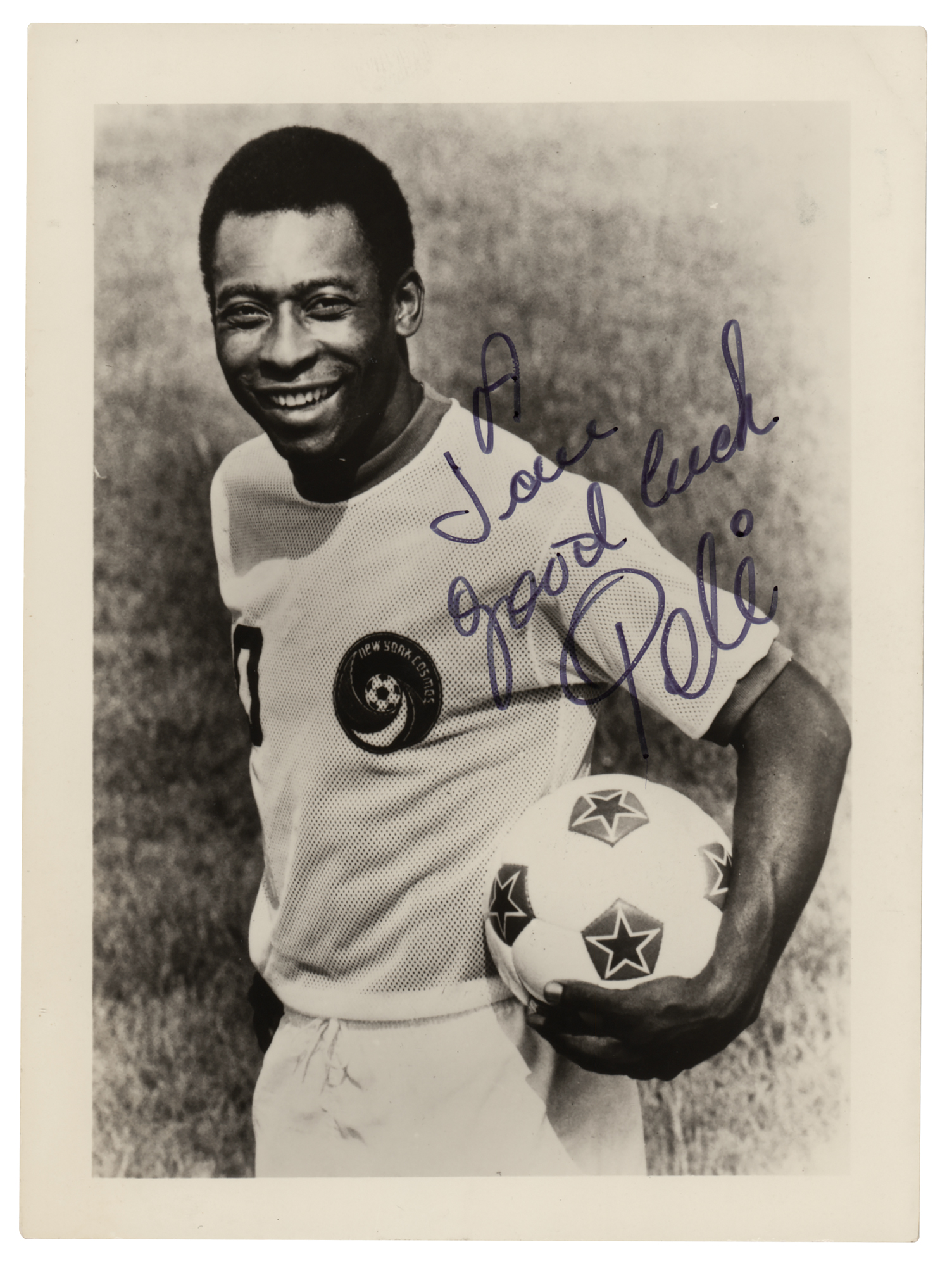 Glossy 5.25 x 7 photo of legendary player Pele holding a soccer ball, signed and inscribed in black felt tip. In fine condition.