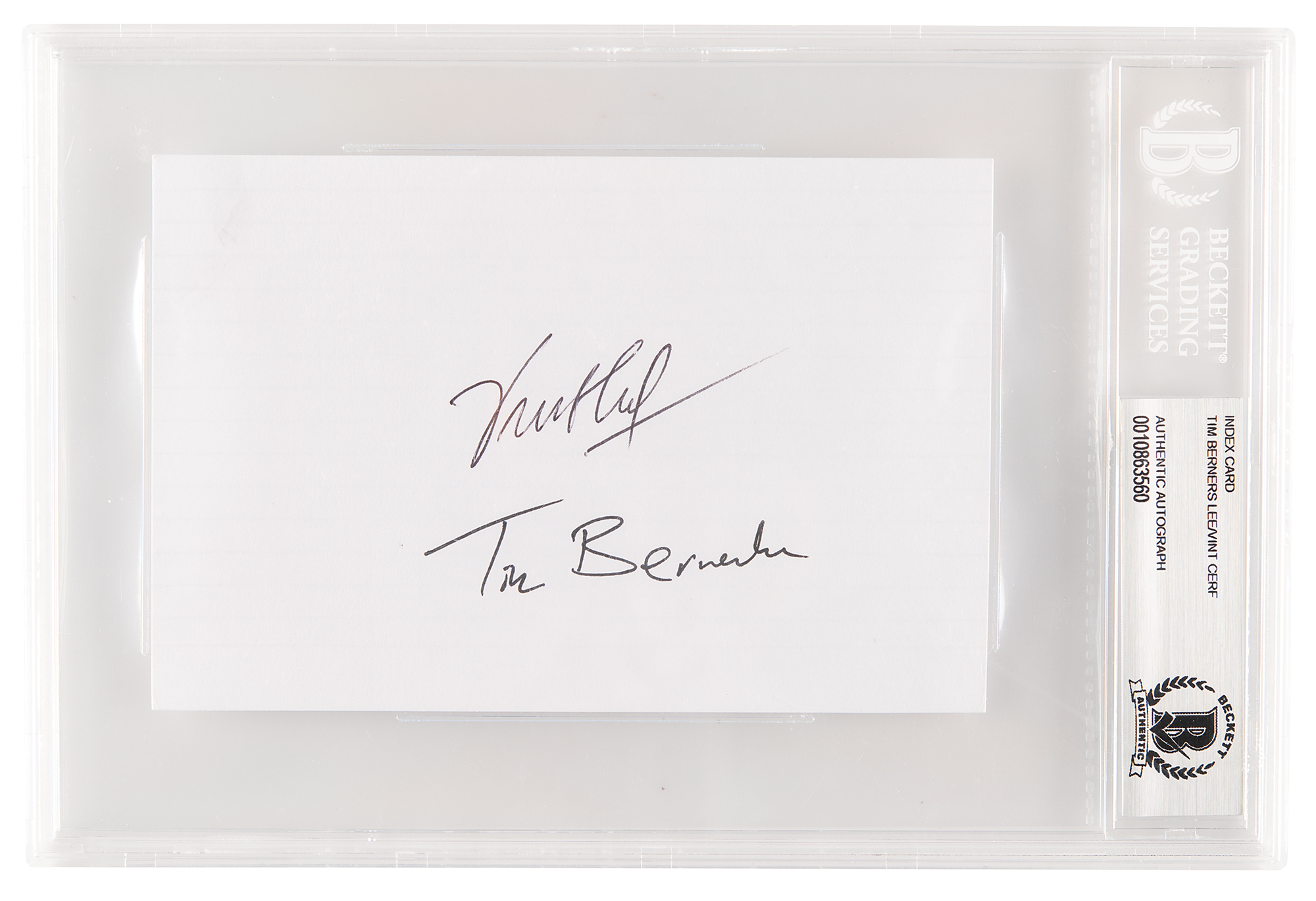 Ink signatures, "Vint Cerf" and "Tim Berners-Lee,” on a white 6 x 4 card. In very fine condition. Encapsulated in a Beckett authentication holder. Vint Cerf (born 1943) is an internet pioneer and one of 'the fathers of the Internet,' who developed TCP/IP technology and the first commercial email system. Tim Berners-Lee (born 1955) is an English engineer and computer scientist who is best known as the inventor of the World Wide Web.
