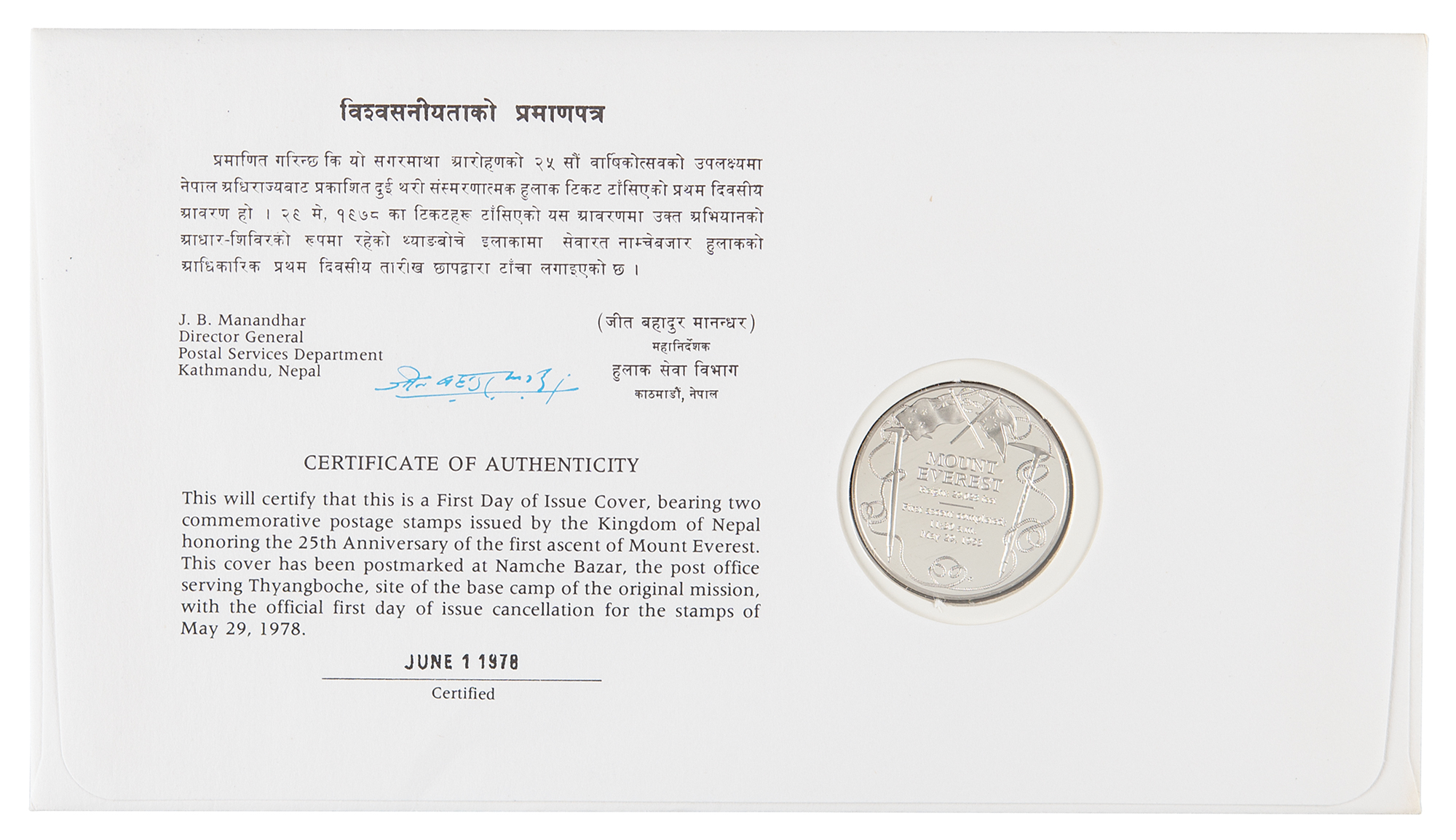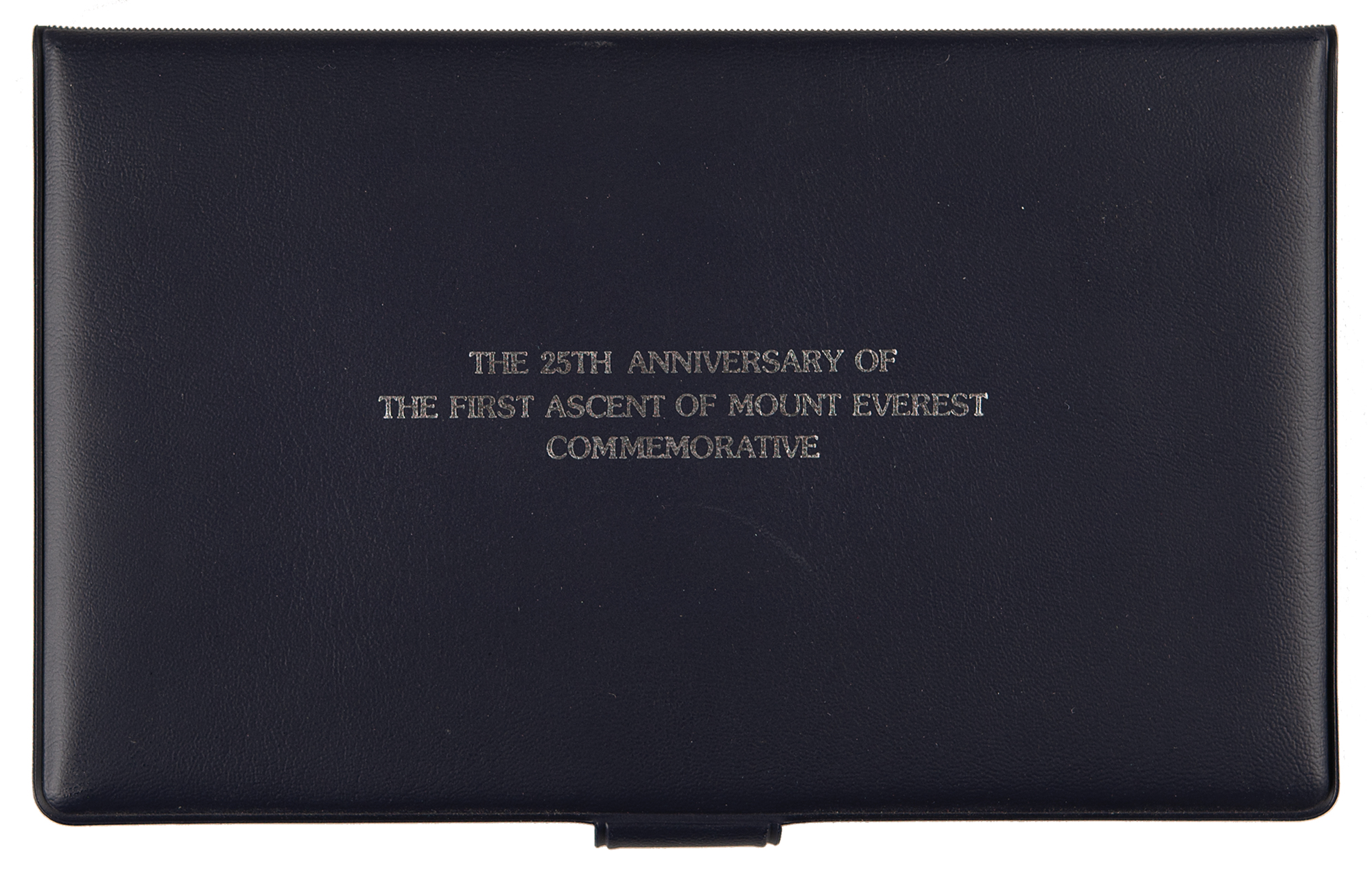 Commemorative cover, 8 x 4.5, with a cachet and inlaid medallion honoring the 25th anniversary of the first ascent of Mount Everest, signed in black ballpoint by Edmund Hillary and Tenzing Norgay. Housed in its original presentation wallet. In very fine condition.