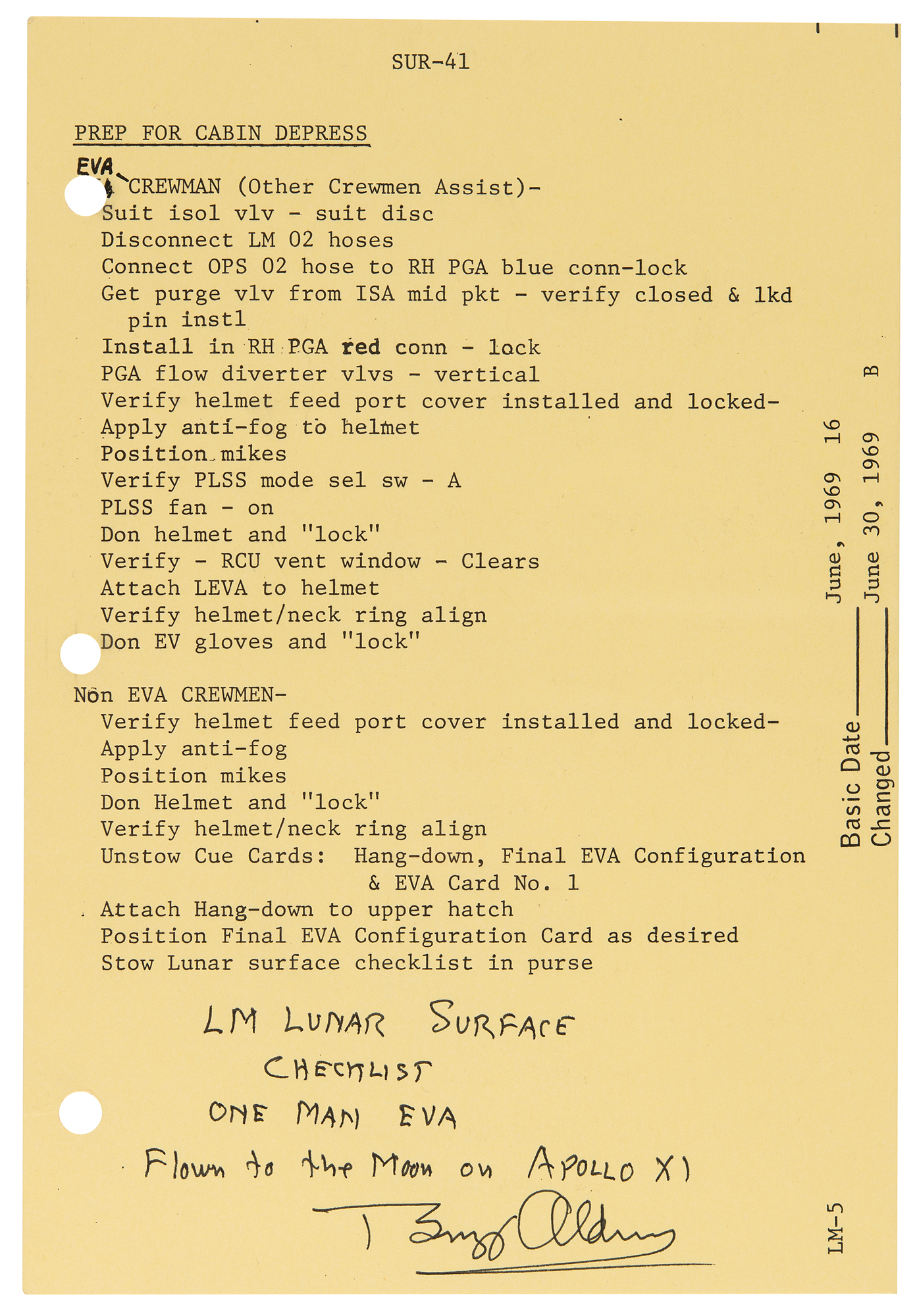 Important flown single-sided page from the Apollo 11 LM Lunar Surface Checklist carried to the moon on the Lunar Module 'Eagle,' 5.5 x 8, signed and flight-certified in black felt tip, "LM Lunar Surface Checklist, One Man EVA, Flown to the Moon on Apollo XI, Buzz Aldrin." Numbered "SUR-41" at the head, the yellow page details procedures necessary for either crewman to prepare for a one-man EVA, a contingency that was not carried out on the Apollo 11 mission. The steps listed outline preparation for cabin depressurization, highlighted by the donning and locking of gloves and helmet, and verification of Portable Life Support System (PLSS). In very fine condition.