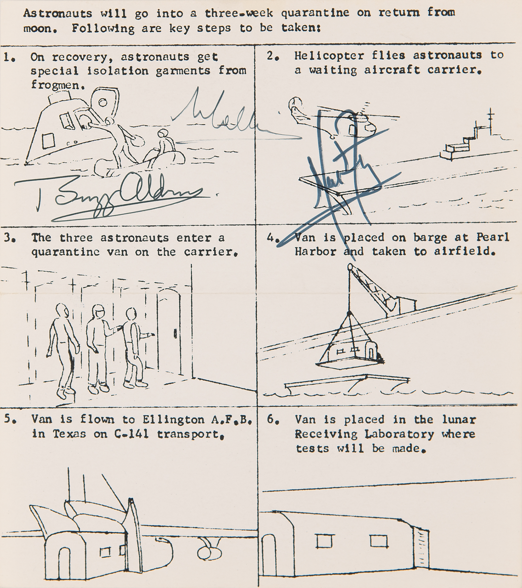 Unusual 6.25 x 7 printed diagram documenting the six steps of the Apollo 11 recovery and quarantine, neatly signed in black felt tip by Neil Armstrong, Buzz Aldrin, and Michael Collins. The diagram shows the astronauts receiving their isolation garments upon splashdown, flying to the aircraft carrier aboard a helicopter, entering a quarantine van on board the ship, traveling by barge at Pearl Harbor,flying to Ellington Air Force Base by C-141, and finally reaching the Lunar Receiving Laboratory, where the astronauts spent three weeks undergoing testing upon their return from the moon. In fine condition.