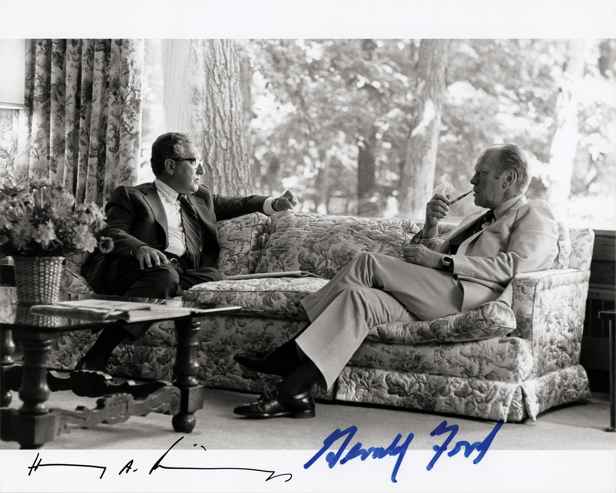 Satin-finish 8 x 10 photo of Gerald Ford and Henry Kissinger engaged in a leisurely discussion at Camp David, signed in the lower border in blue felt tip by Ford and in black felt tip by Kissinger. In very fine condition, with a JSA label affixed to the reverse. Accompanied by a certificate of authenticity from JSA.