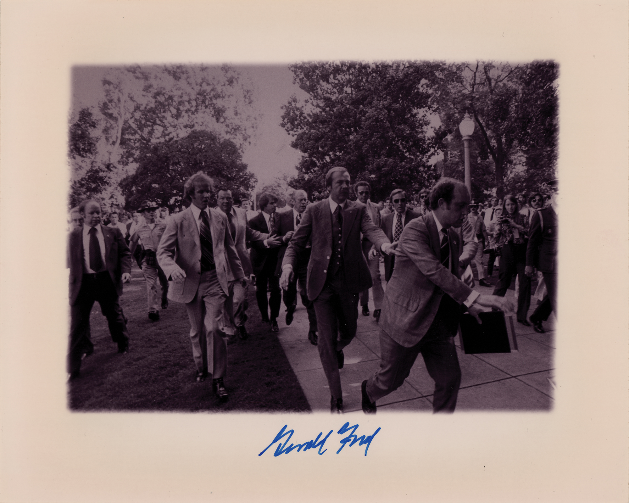 Glossy 10 x 8 photo of President Ford being rushed by Secret Service from the site of the 1975 assassination attempt in Sacramento, California, signed in the lower border in blue felt tip, "Gerald Ford." In very fine condition.