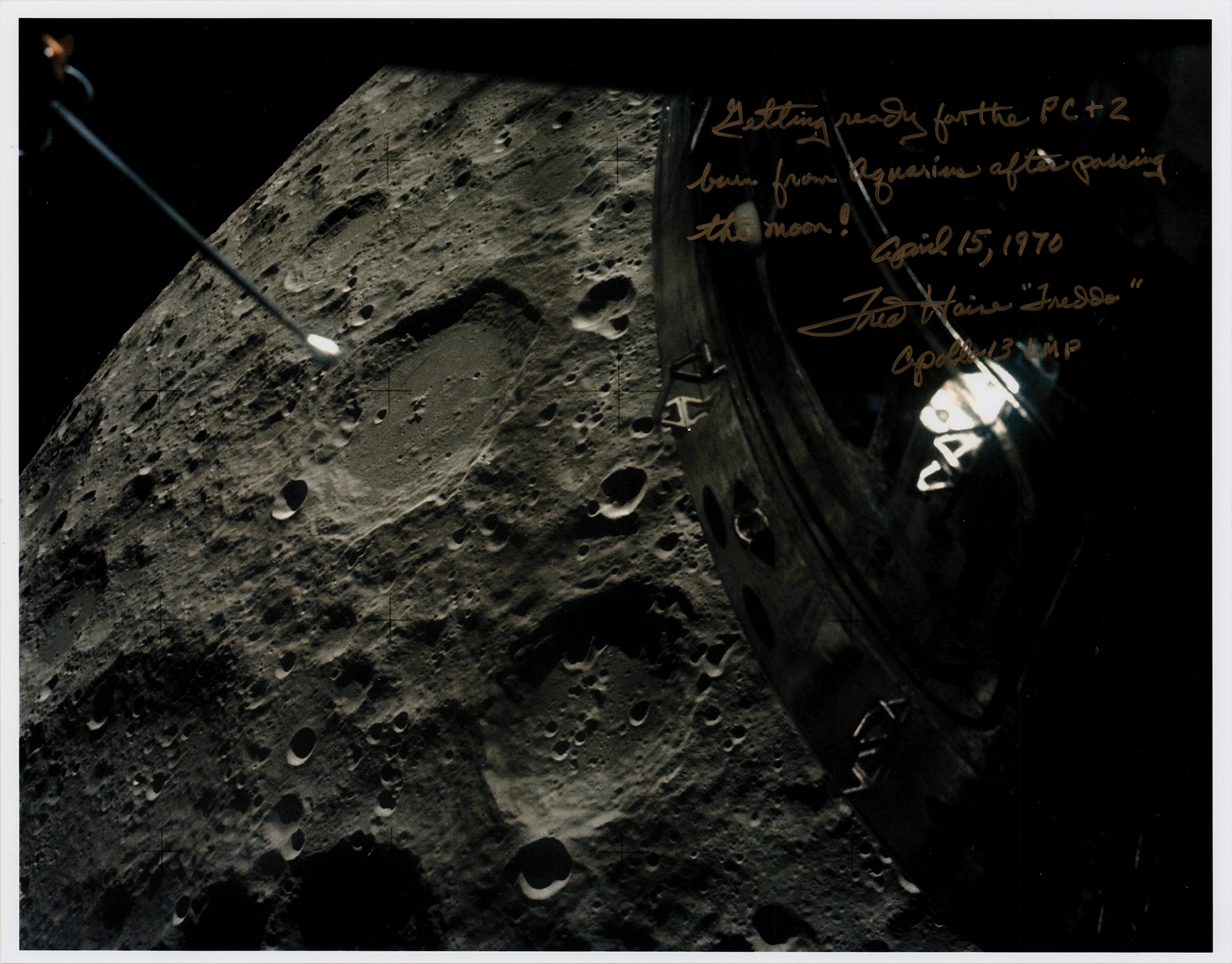 Color satin-finish 14 x 11 photo of the moon's surface from the window of the Apollo 13 Lunar Module Aquarius, signed in gold ink, "Getting ready for the PC+2 burn from Aquarius after passing the moon! April 15, 1970, Fred Haise, 'Freddo,' Apollo 13 LMP." In very fine condition.