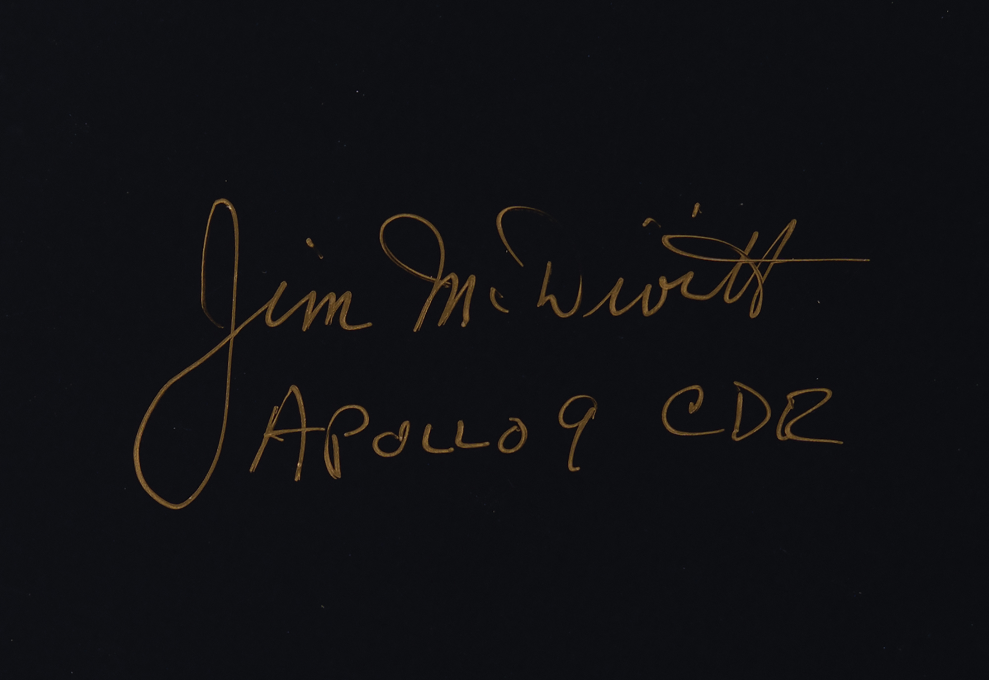 Color satin-finish 20 x 16 photo of the Apollo 9 LM Spider in Earth orbit, signed in gold ink, "Jim McDivitt, Apollo 9 CDR." In fine condition.