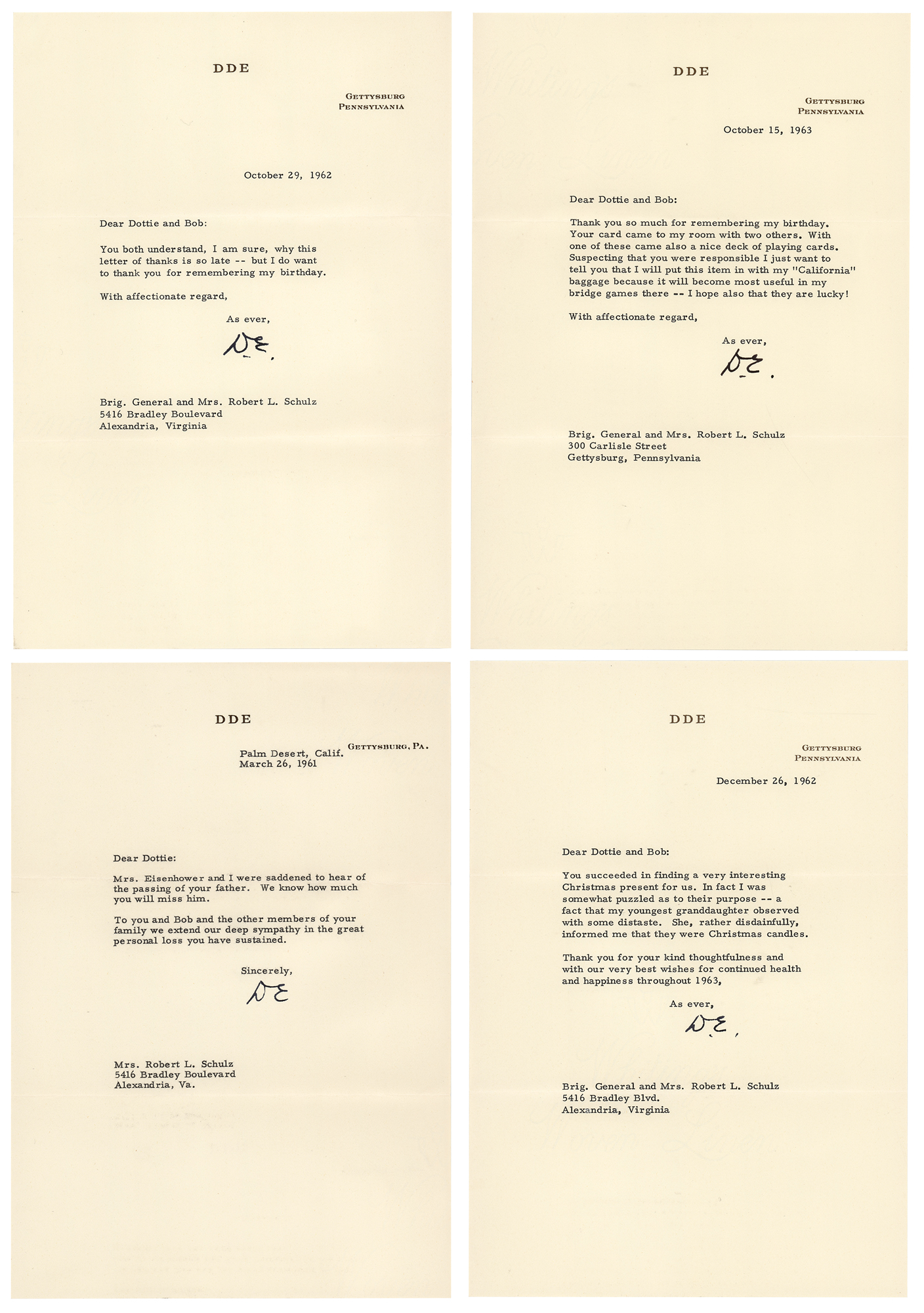 Four TLSs signed "D.E.," each one page, 7 x 10.25, personal letterhead, dated 1961–1963. Eisenhower writes to Brig. General and Mrs. Robert L. Schulz, expressing condolences on the loss of Mrs. Schulz's father, sending thanks for birthday wishes, expressing gratitude for the 'puzzling' gift of Christmas candles, and promising to use a "nice deck of playing cards" in his California bridge games. In overall very fine condition. Accompanied by all four original mailing envelopes.