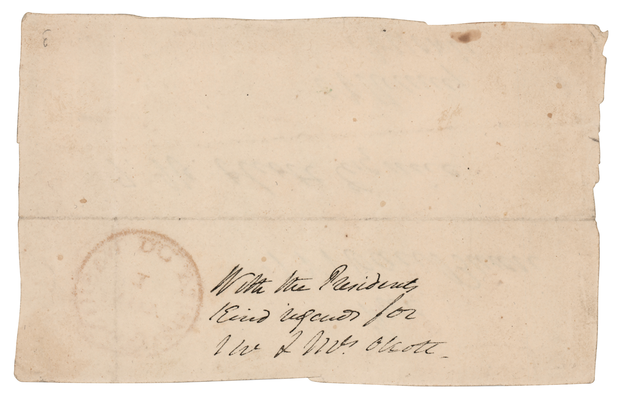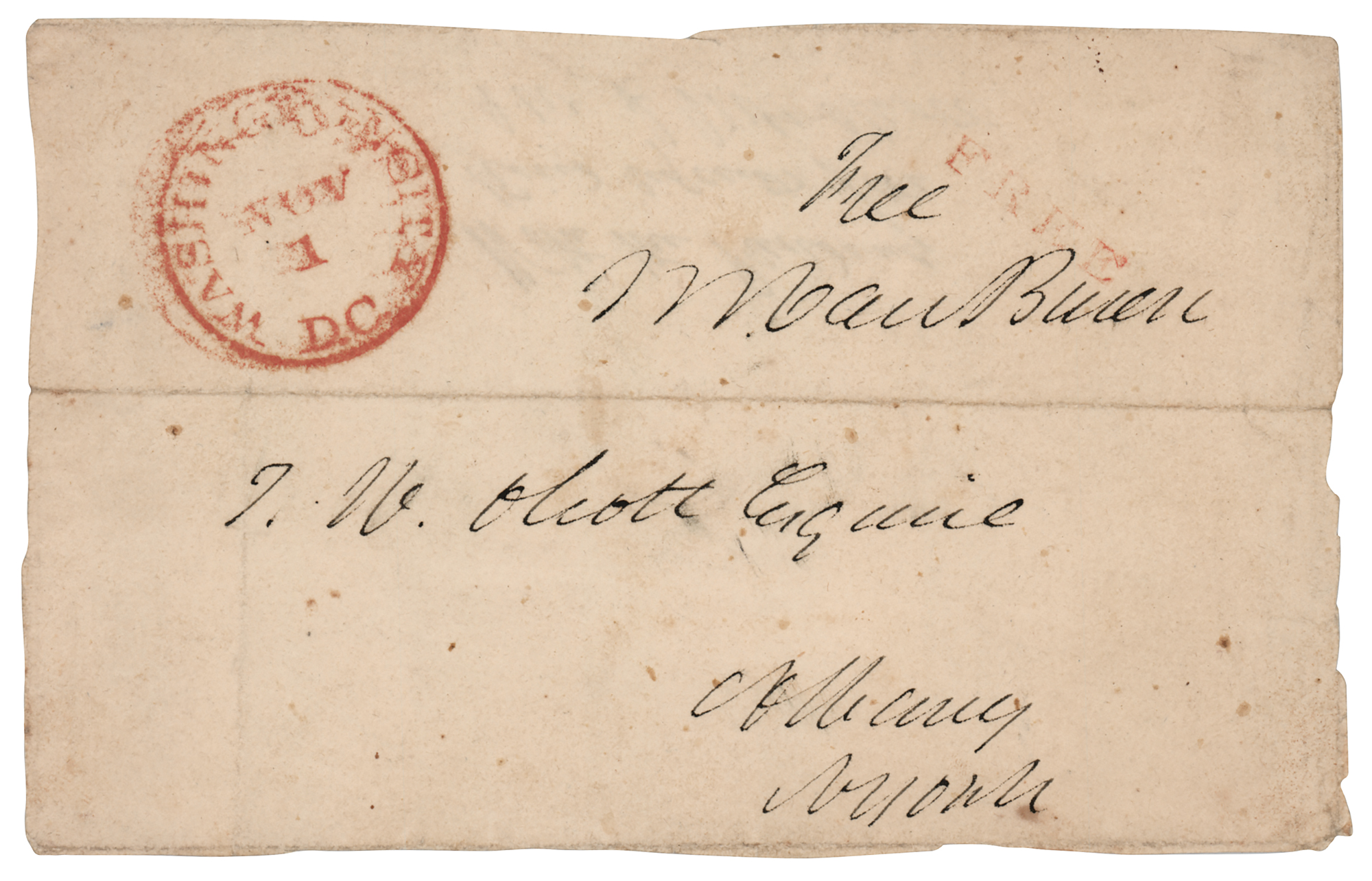 Free-franked mailing panel, 5.5 x 3.5, addressed in the hand of President Martin Van Buren to “T. W. Olcott Esquire, Albany, N. York,” who adds his franking signature above, “Free, M. Van Buren,” and writes a third-person sentiment on the reverse, “With the President’s kind regards for Mr. & Mrs. Olcott.” In fine condition, with a central horizontal fold.
