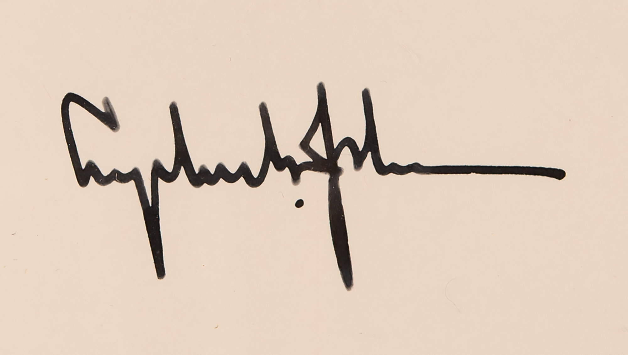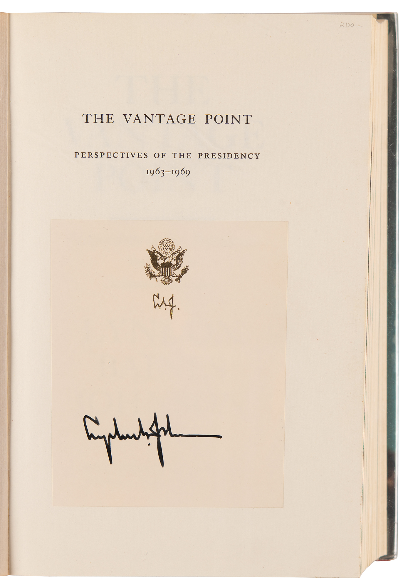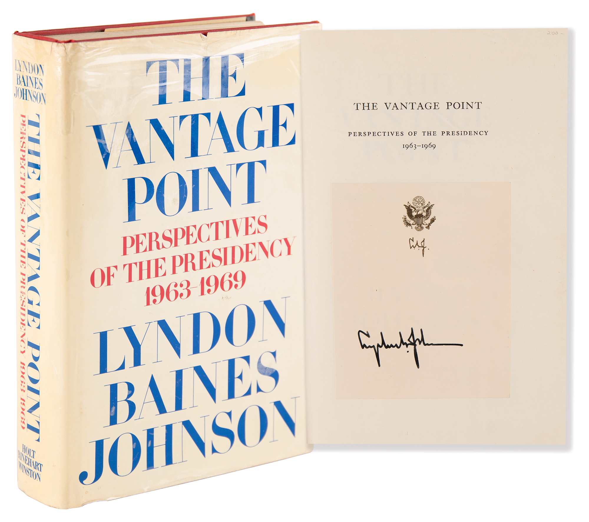 Signed book: The Vantage Point: Perspectives of the Presidency, 1963-1969. First edition. NY: Holt, Rinehart and Winston, 1971. Hardcover with dust jacket, 6.25 x 9.5, 636 pages. Signed in fountain pen by Lyndon B. Johnson on a bookplate affixed to the half-title page. In very good to fine condition, with wear and sunning to the dust jacket, and cracking to the inner hinge of the book; the signed bookplate is fine and clean.
