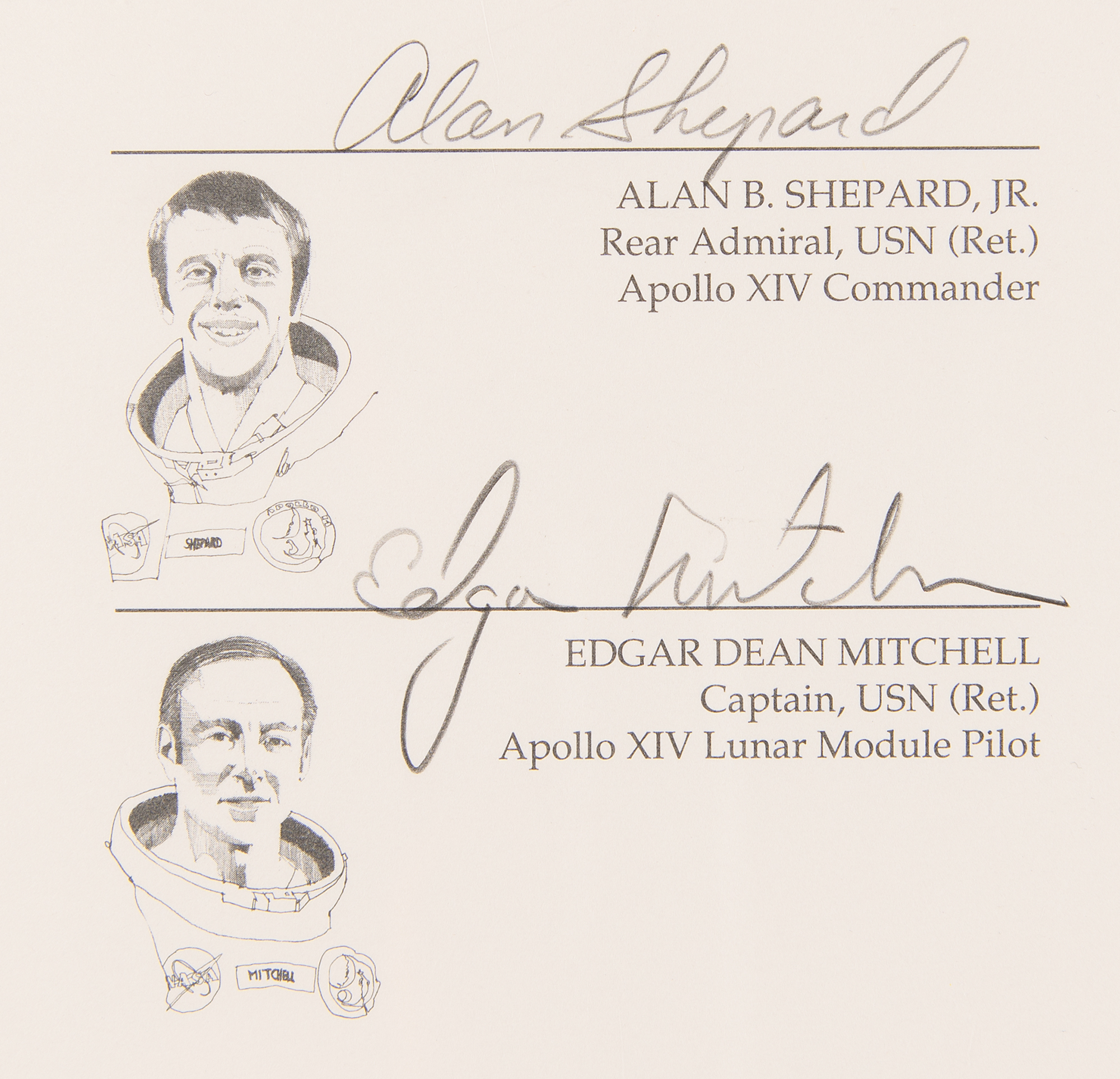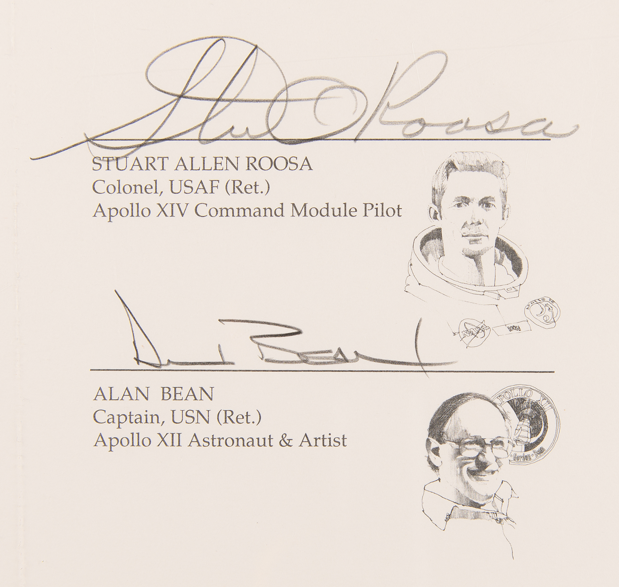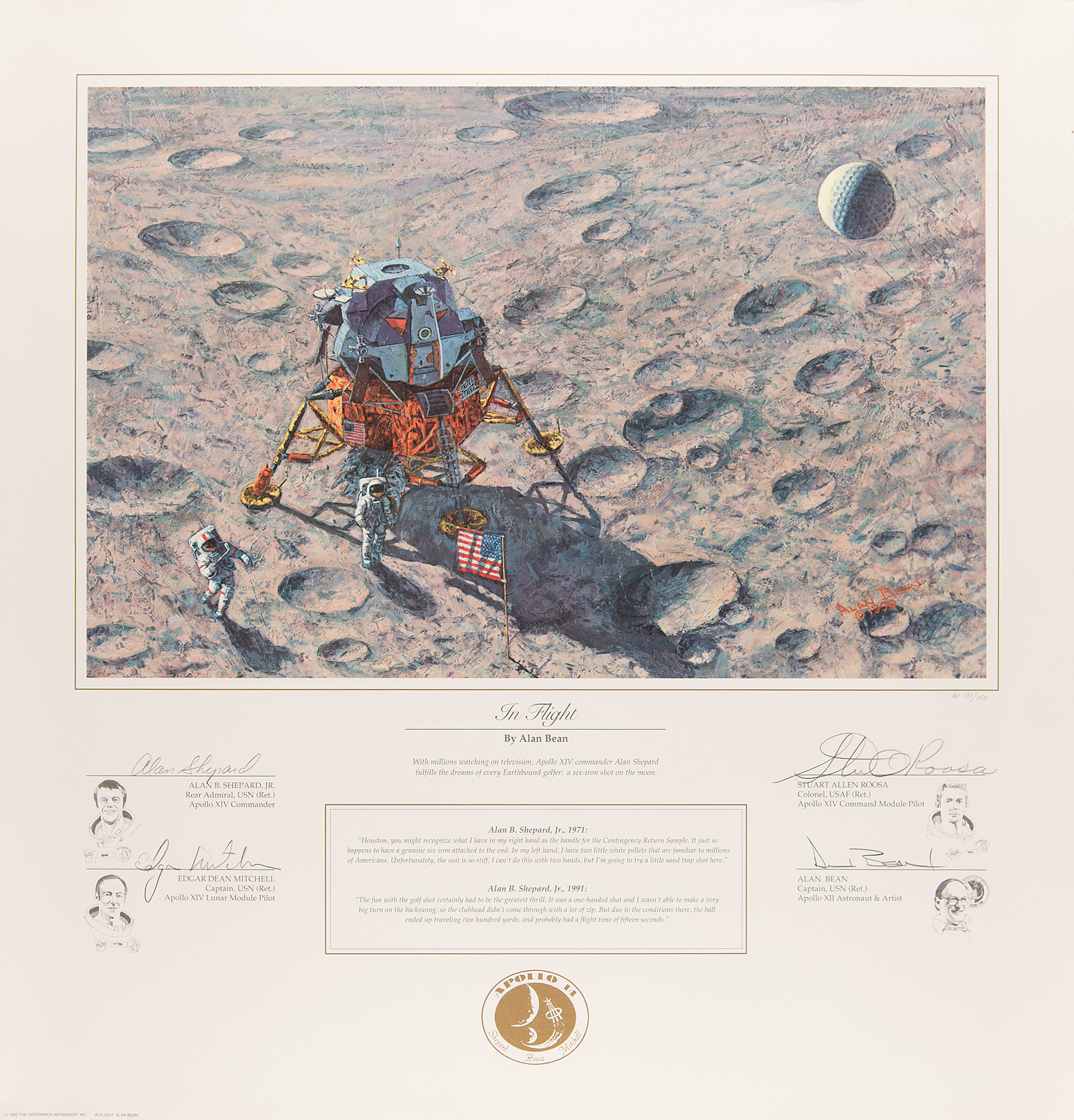 Limited edition color 22.75 x 23.75 lithograph of a painting by Alan Bean entitled 'In Flight,' numbered AP 131/150, signed in the lower border in pencil by Alan Shepard, Edgar Mitchell, Stu Roosa, and Alan Bean, whose artwork shows Alan Shepard's famous lunar golf shot, as viewed by millions on television during the Apollo 14 mission. Rolled and in fine condition.