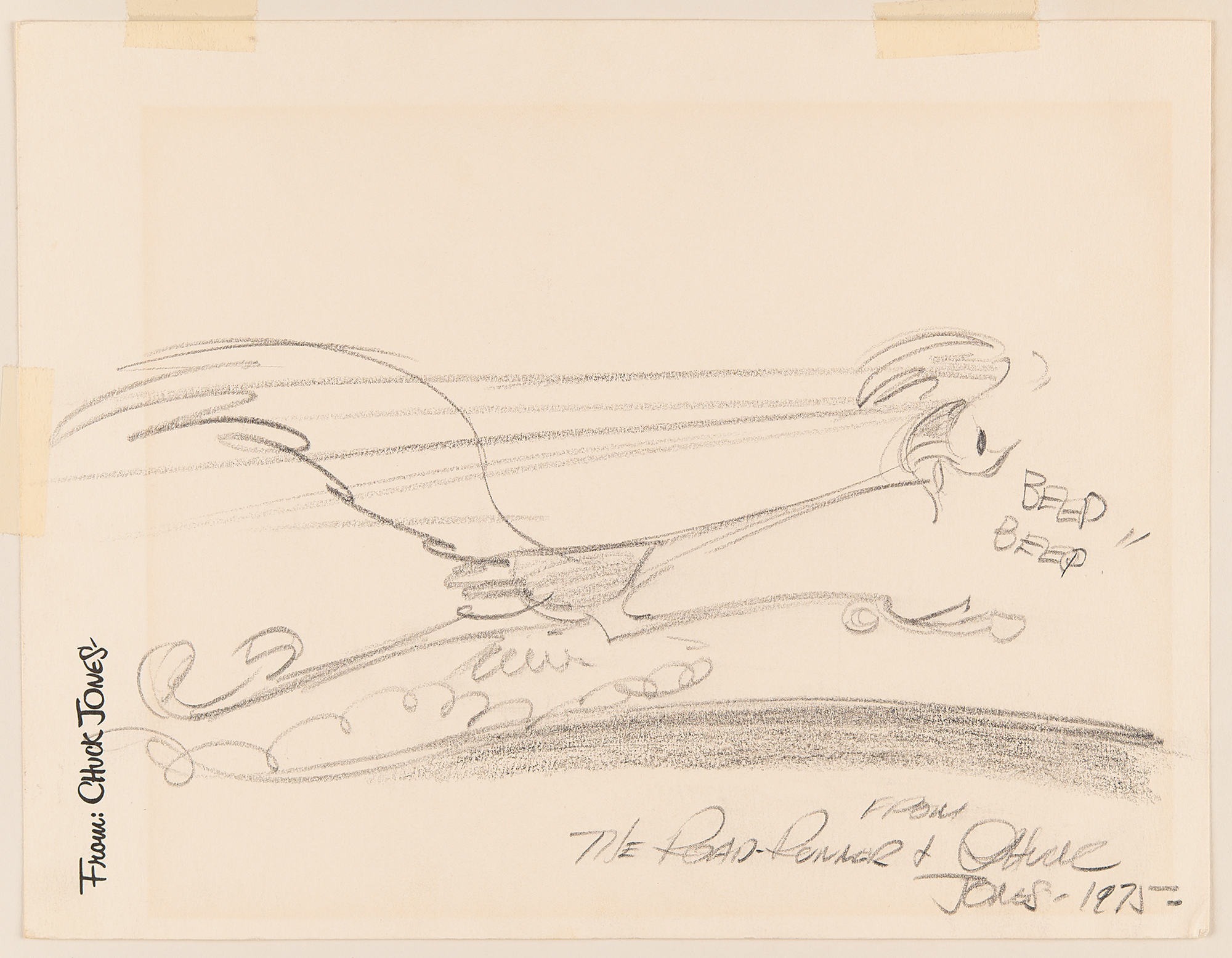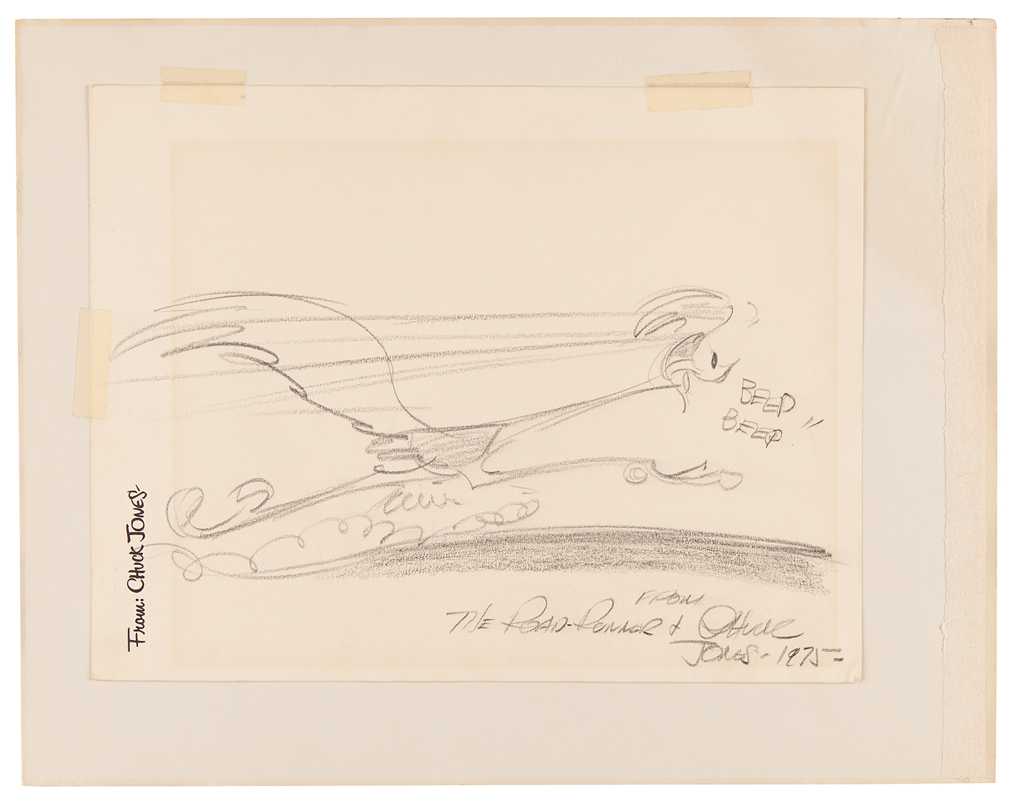 Original drawing by Chuck Jones of the Road Runner squawking “Beep Beep!!” in a full-length running pose, accomplished in graphite on an off-white 11 x 8.5 sheet of his personal 'From: Chuck Jones' stationery, signed below, “From the Road-Runner & Chuck Jones, 1975.” Affixed to a 14 x 11 cardstock mount and in fine condition.