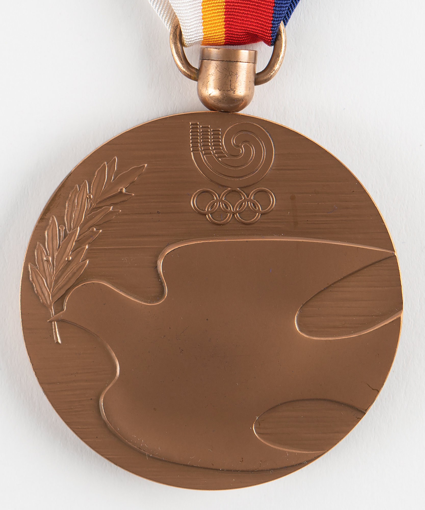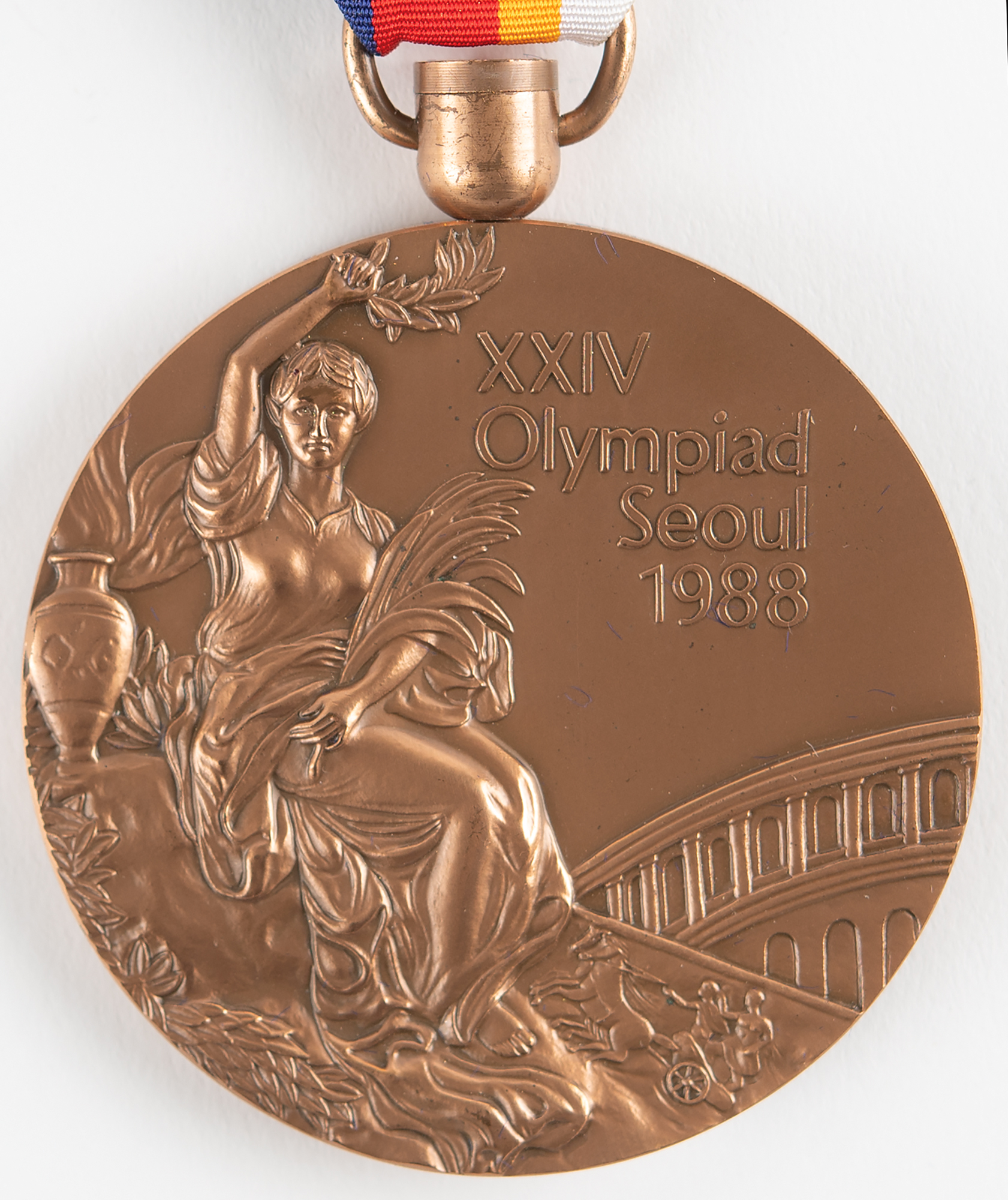 Scarce unawarded winner's medal issued for the Seoul 1988 Summer Olympics. Bronze, 64 mm, 122 gm, by the Korea Security Printing and Minting Corporation. The front features the traditional medal design by Giuseppe Cassioli of a ‘Seated Victory’ with the Colosseum in the background, and raised lettering, “XXIV Olympiad, Seoul, 1988”; the reverse features a sleek modern design by the Seoul Organizing Committee portraying a soaring dove of peace with a laurel branch in its beak, with the Seoul Olympic emblem above. The edge is plain; an awarded example would be inscribed with the name of the event. Complete with its original ultramarine, red, orange, and white ribbon, and its purple velvet presentation case.