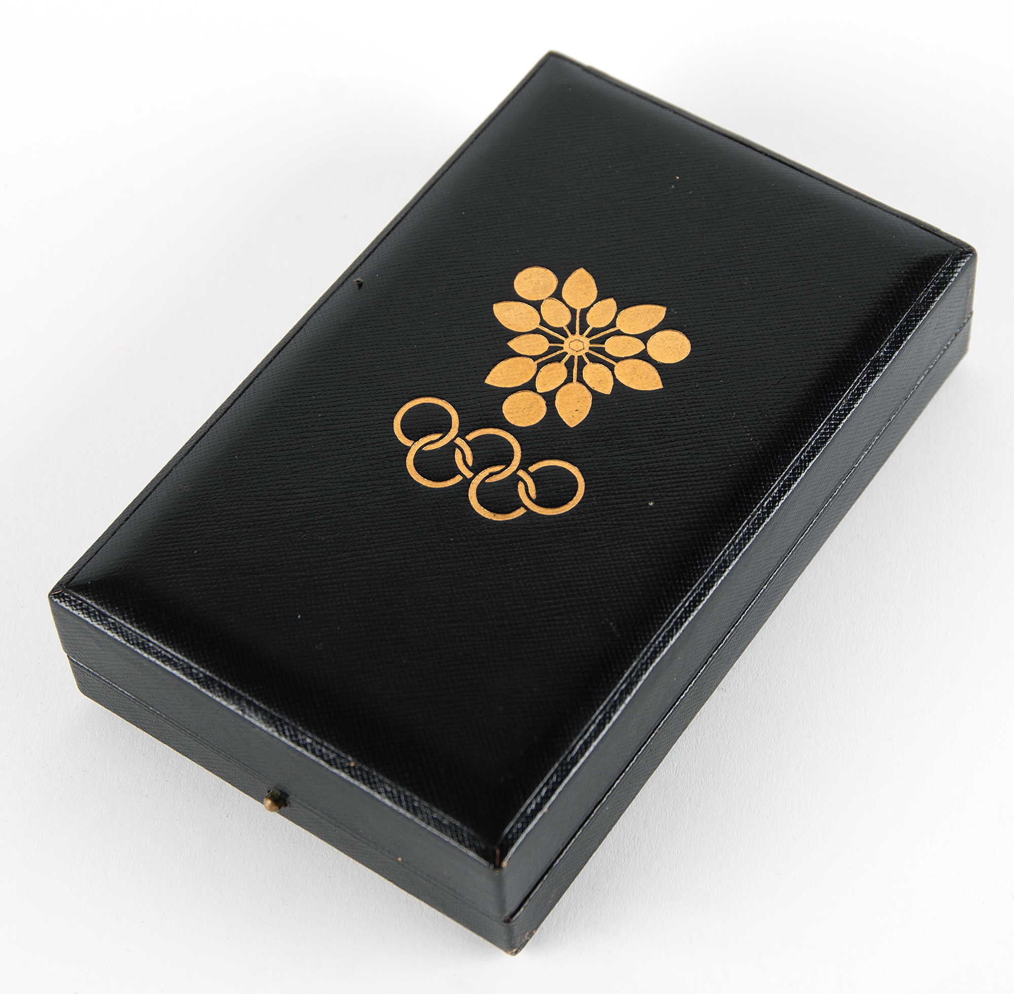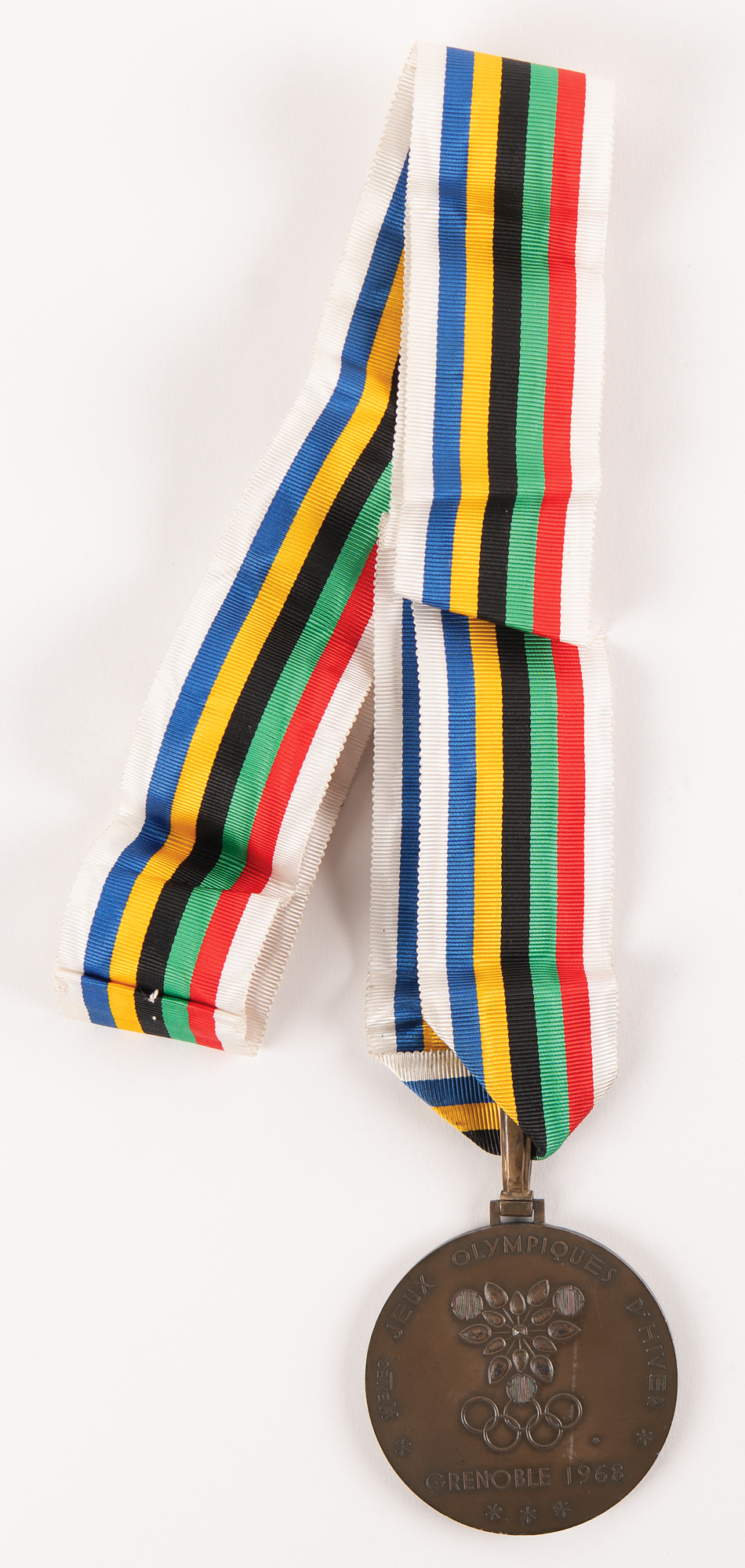 Sought-after winner’s medal for ice hockey at the Grenoble 1968 Winter Olympics. Bronze, 60 mm, 114 gm, designed by Roger Excoffon and manufactured by the Paris Mint. The front, inscribed, “Xemes Jeux Olympiques D’Hiver, Grenoble 1968,” features the symbol of Grenoble, a snow crystal and three roses, and the Olympic rings; the reverse identifies the sport as ice hockey, “Hockey sur Glace,” and depicts a stylized silhouette of a hockey player. Complete with its original ribbon striped with Olympic colors and attractive black leather presentation case by Monnaie de Paris.