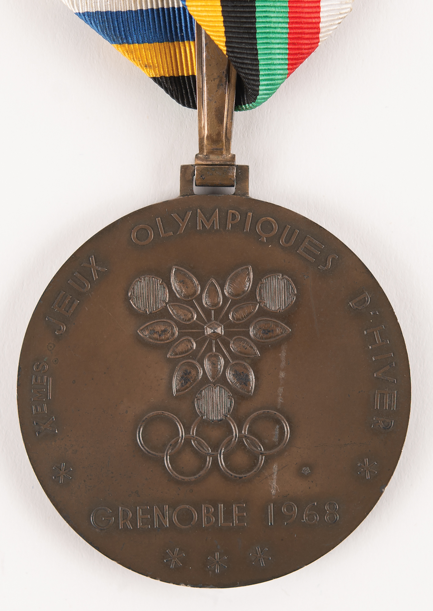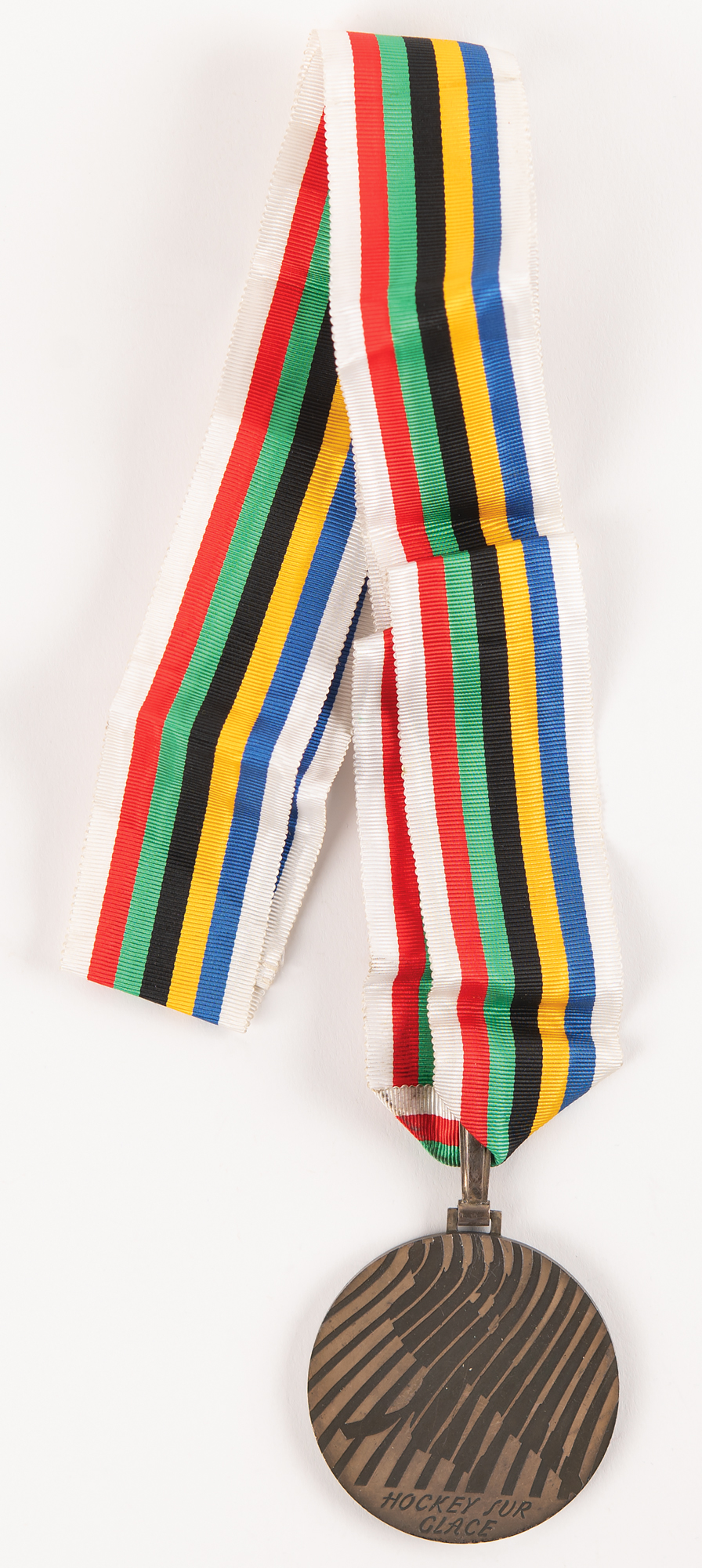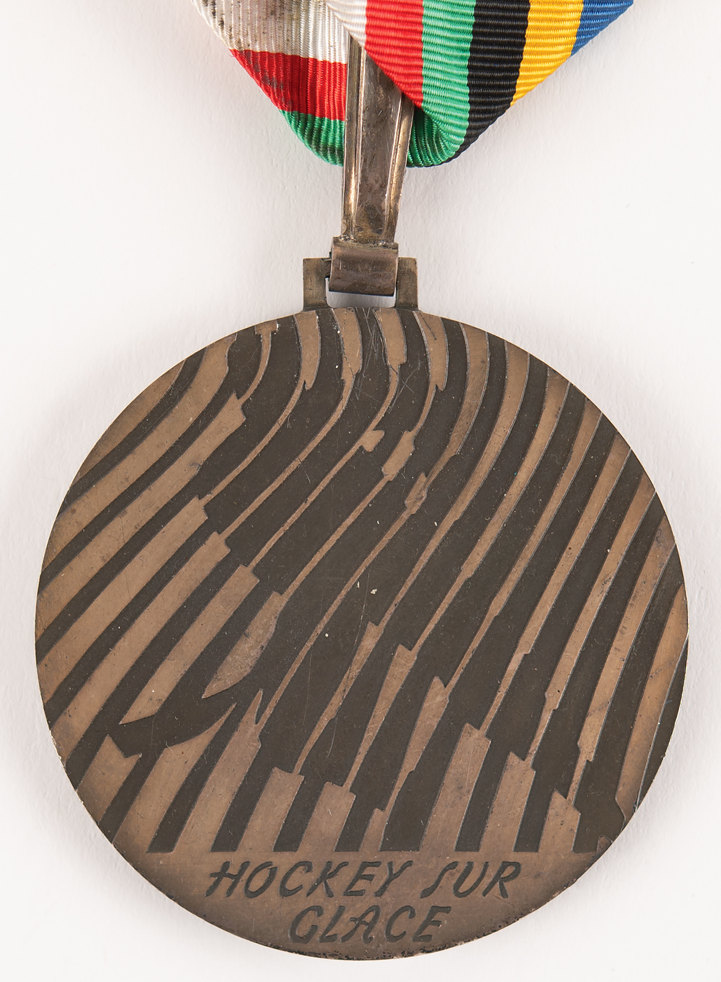 Winner's medals for the Grenoble 1968 Winter Olympics were produced for the first time with a unique design for each sport. This particular bronze medal was awarded to a member of the Canadian national hockey team, which lost in the final match to a powerhouse Soviet Union squad that went 7-1 in tournament play. Although Canada lost in the finals in the typical runner-up position, the silver was awarded to the Czechoslovakian team, which beat the USSR in their penultimate match of the tournament and earned them a tie-breaking advantage—both teams had a record of 5 wins, 1 loss (10 points) with one game remaining. To win the championship, Czechoslovakia needed to win its game against Sweden (the match was a draw) and for Canada to lose or tie its game with the USSR. Had Canada won against the USSR and Czechoslovakia won its game over Sweden, Canada would have tied Czechoslovakia with 12 points and prevailed in the tiebreaker to win the gold medal.
