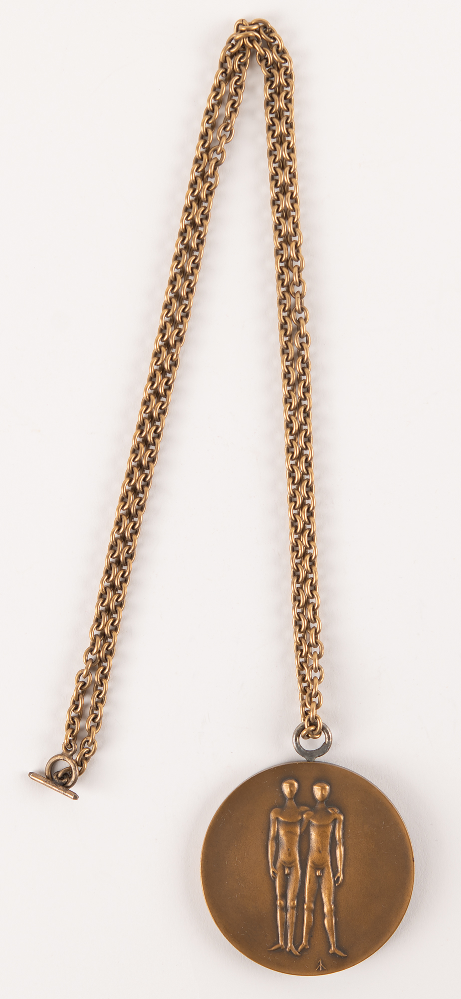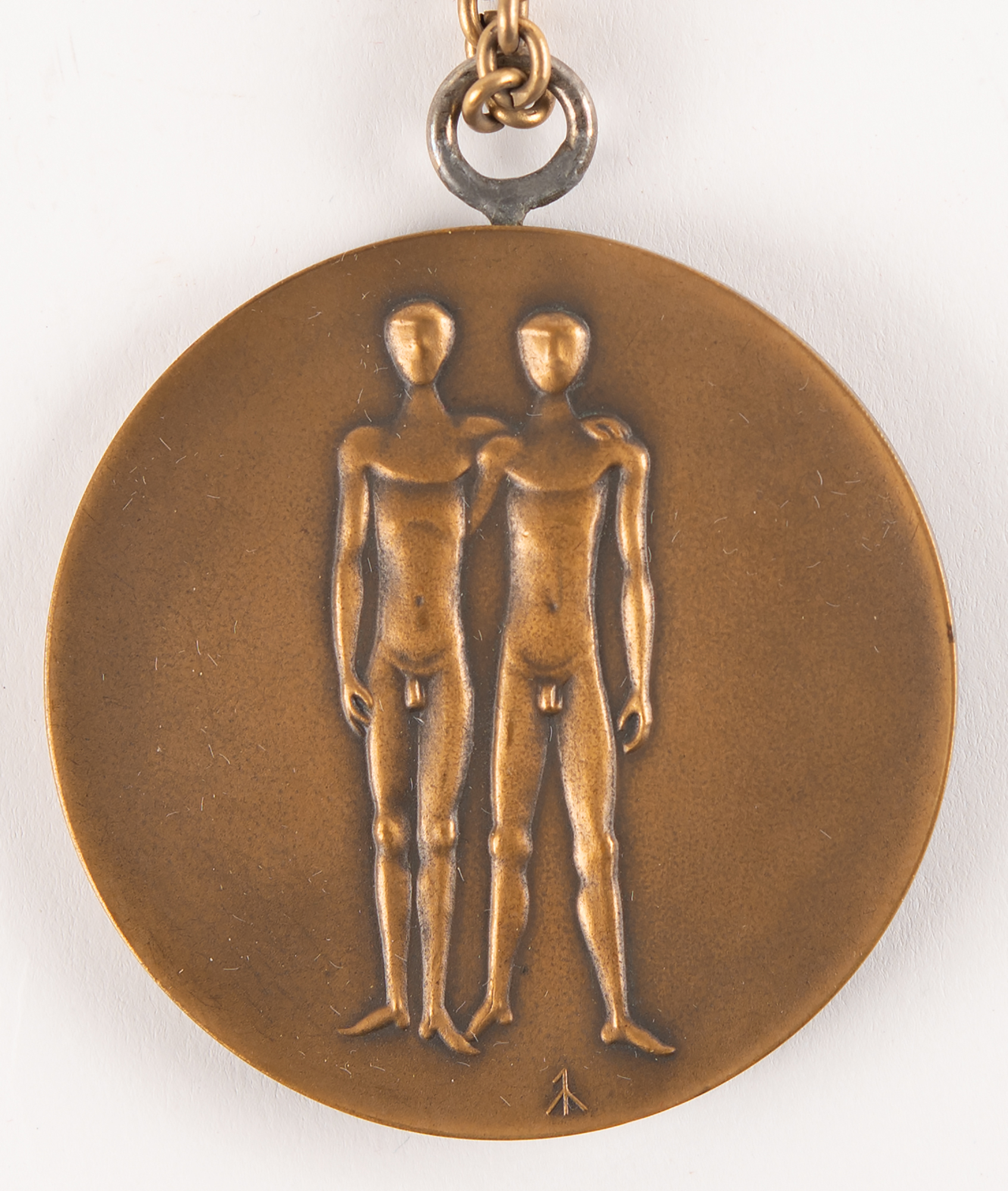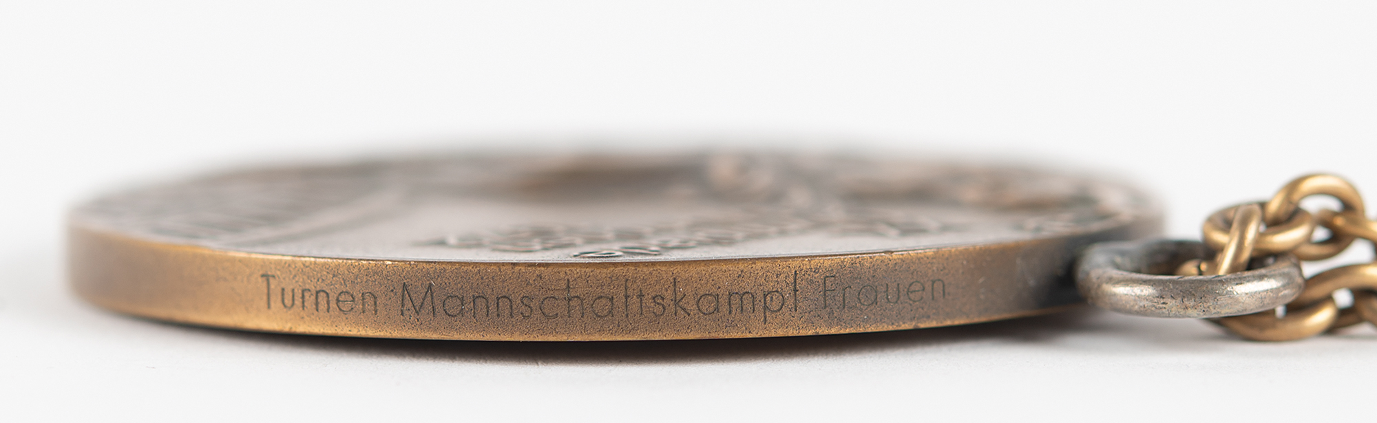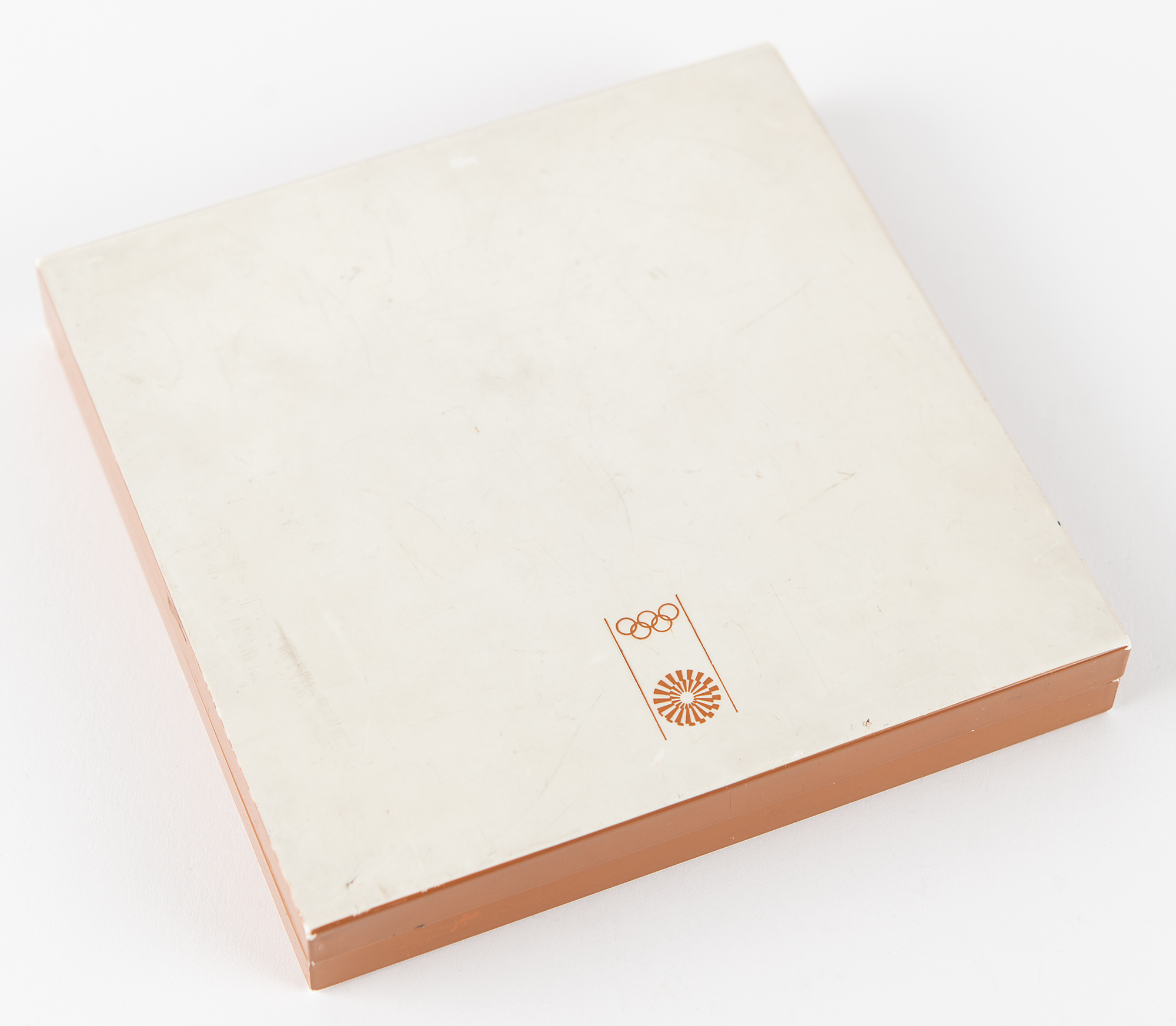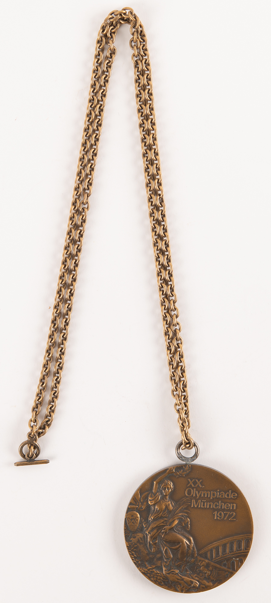 Scarce winner's medal issued to Hungarian gymnast Zsuzsa Nagy at the Munich 1972 Summer Olympics. Bronze, 66 mm, 132 gm (184 gm with chain), designed by Gerhard Marcks and manufactured by the Bavarian Mint. The front is inscribed, “XX. Olympiade Munchen 1972,” and depicts the 'Seated Victory' with the Colosseum in the background; the reverse portrays the mythological twins Castor and Pollux, the patrons of competitive sport and friendship, with the artist's monogram below. The edge is engraved with the sport and athlete’s name: “Turnen Mannschaftskampf Frauen [Gymnastics Team Competition Women]” and “Nagy Zsuzsa.” Complete with its original plastic presentation case, which bears slight wear and rubbing.