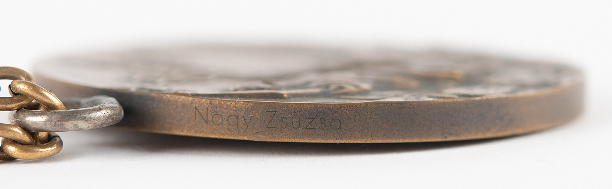 This was the first winner's medal since 1928 to feature a new design on the reverse, replacing the traditional depiction of a victorious athlete carried by a jubilant crowd, and the first medal to bear a chain instead of a ribbon, which was deemed to be too easily soiled or wrinkled. Zsuzsa Nagy was one of six Hungarian women’s gymnastics team members to earn a bronze medal in the Team all-around at the 1972 Summer Olympics in Munich, completing the victory podium alongside East Germany (silver) and the Soviet Union (gold).